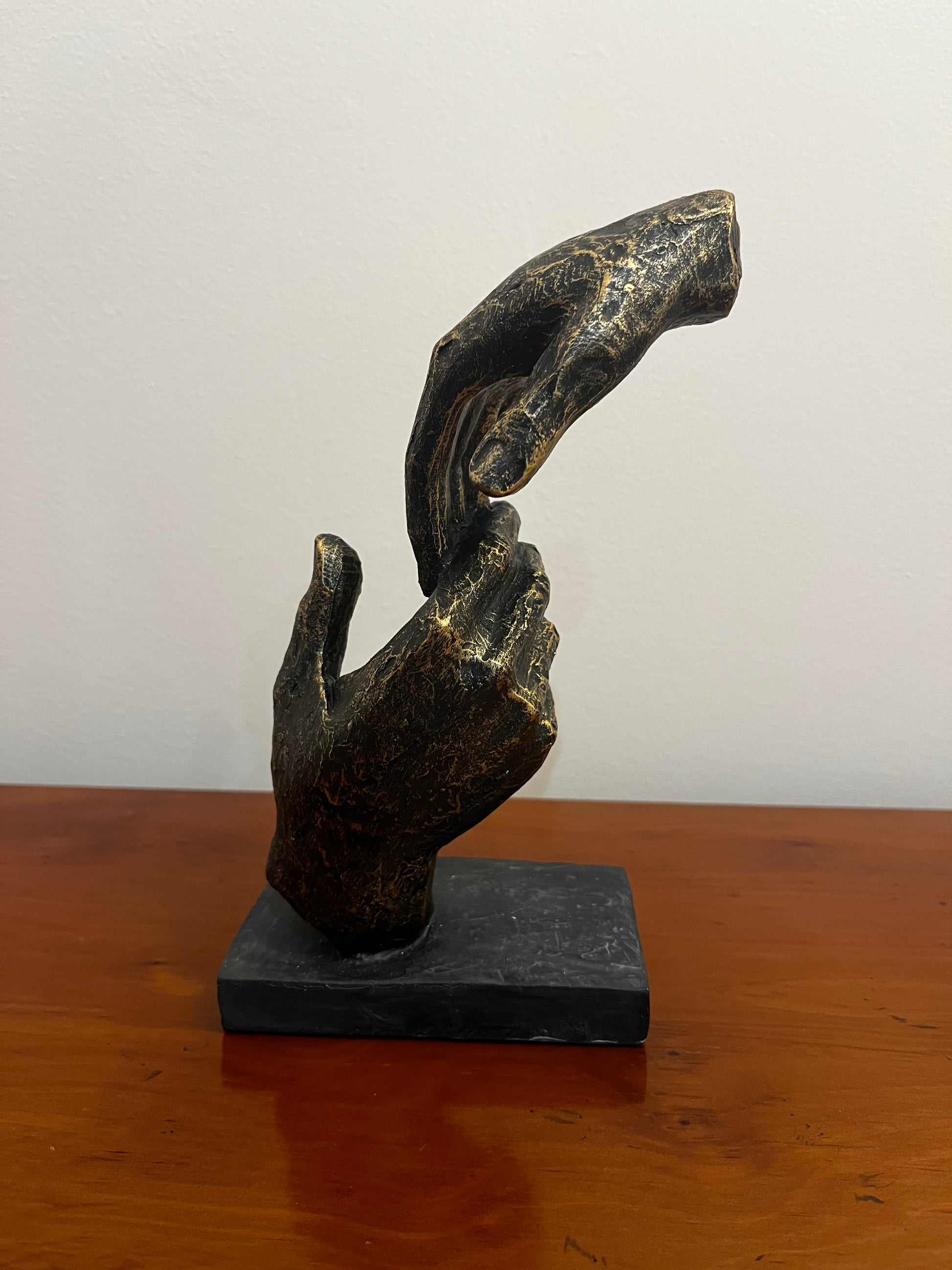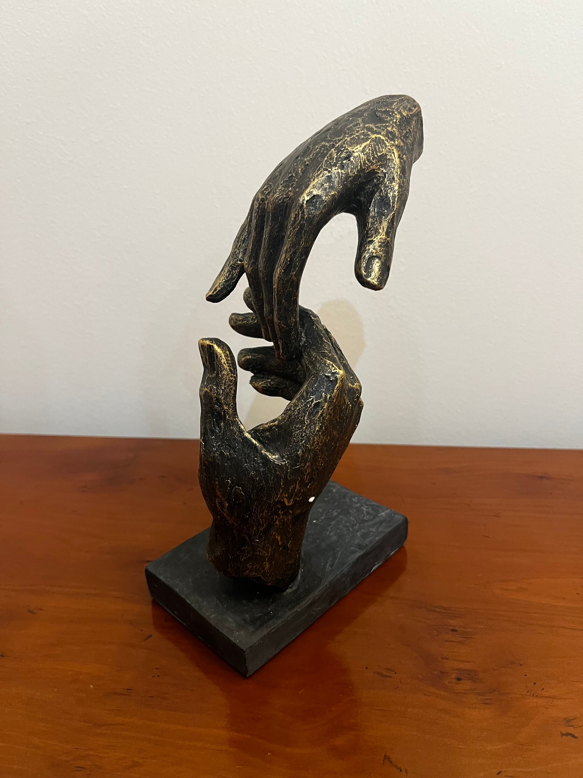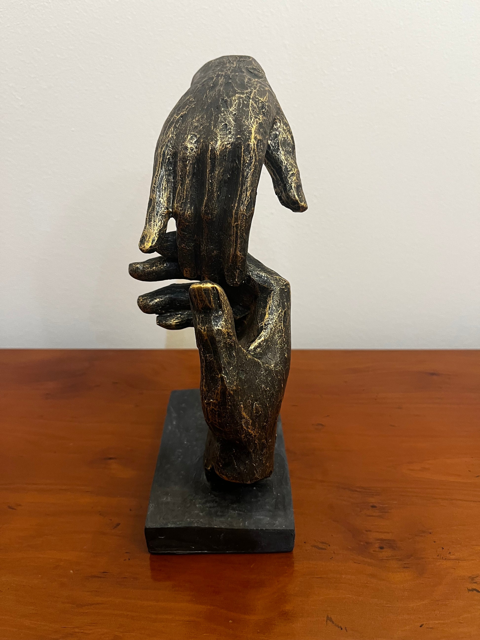 La sculpture "Deux mains" en résine de couleur bronze est un véritable accroche-regard pour tout intérieur. Avec des dimensions de 7 cm x 13 cm x 21 cm et la forme de deux mains, il s'intègre parfaitement dans différents concepts d'espace. La couleur d'accent gris donne à la sculpture une touche particulière et en fait une pièce décorative unique. Que ce soit dans le salon, la chambre ou le bureau, la sculpture met partout des accents élégants. La finition de qualité supérieure et le design détaillé en font un point fort dans n'importe quelle pièce. Offrez-vous ou faites plaisir à vos proches cette œuvre d'art unique et apportez une touche d'élégance à votre intérieur.