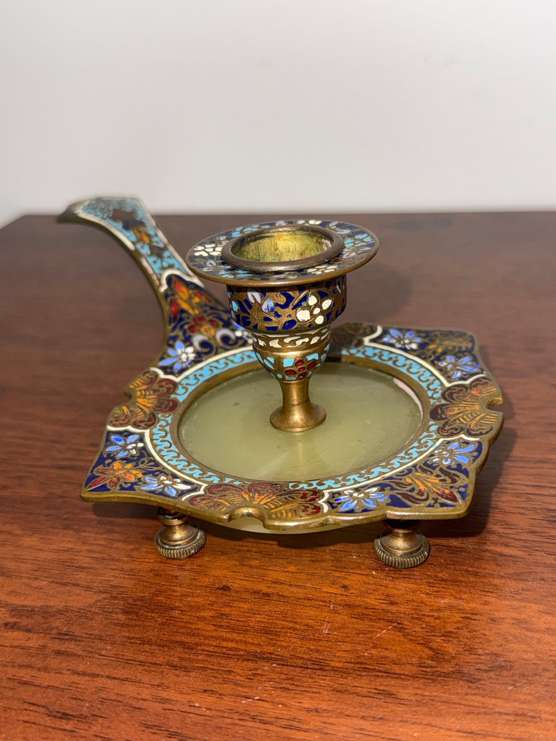 Magnifique bougeoir ancien en bronze doré avec un travail d’émaillage cloisonné aux motifs floraux et géométriques. La base est en onyx vert, offrant un contraste élégant avec les ornements colorés.