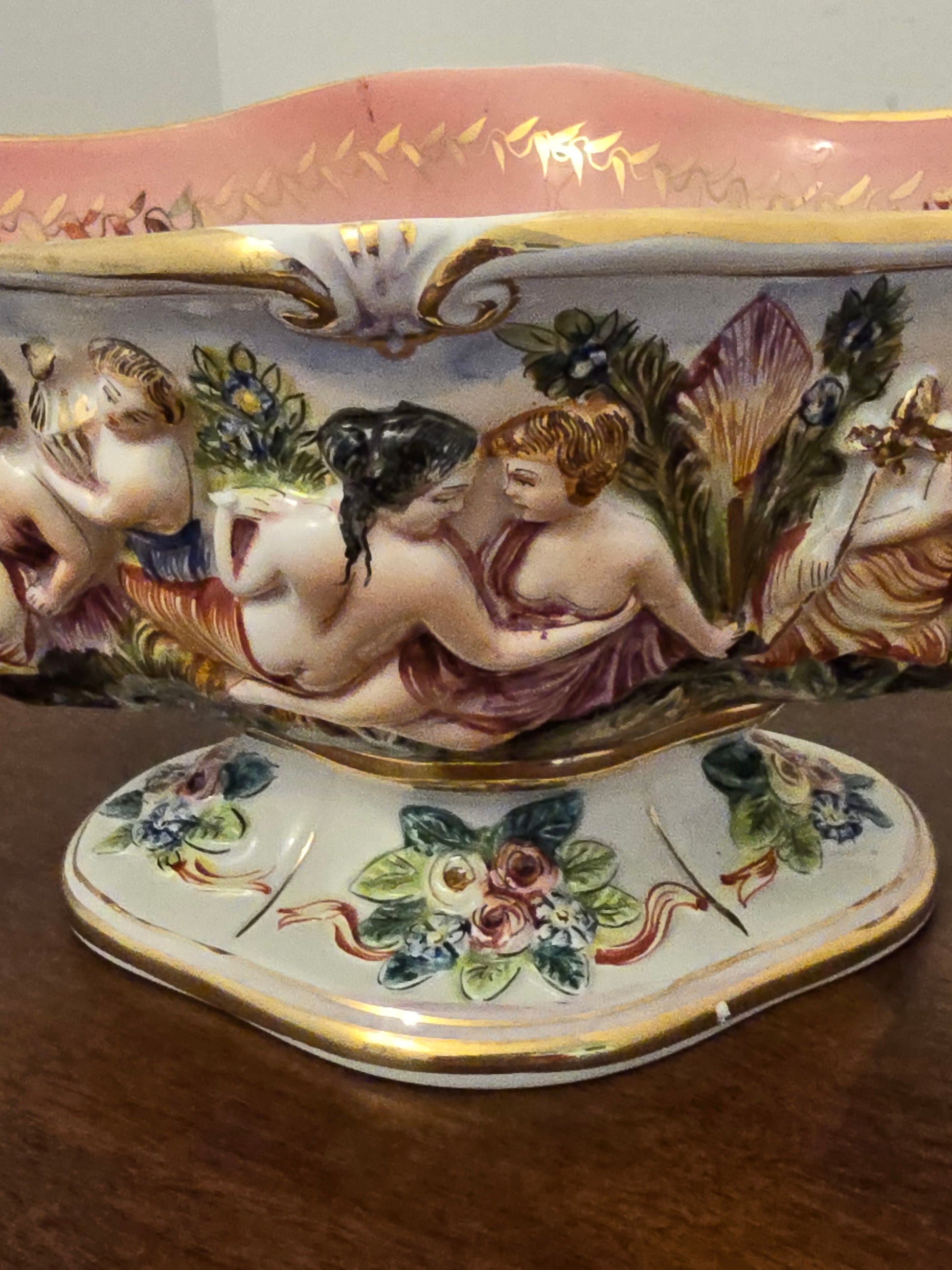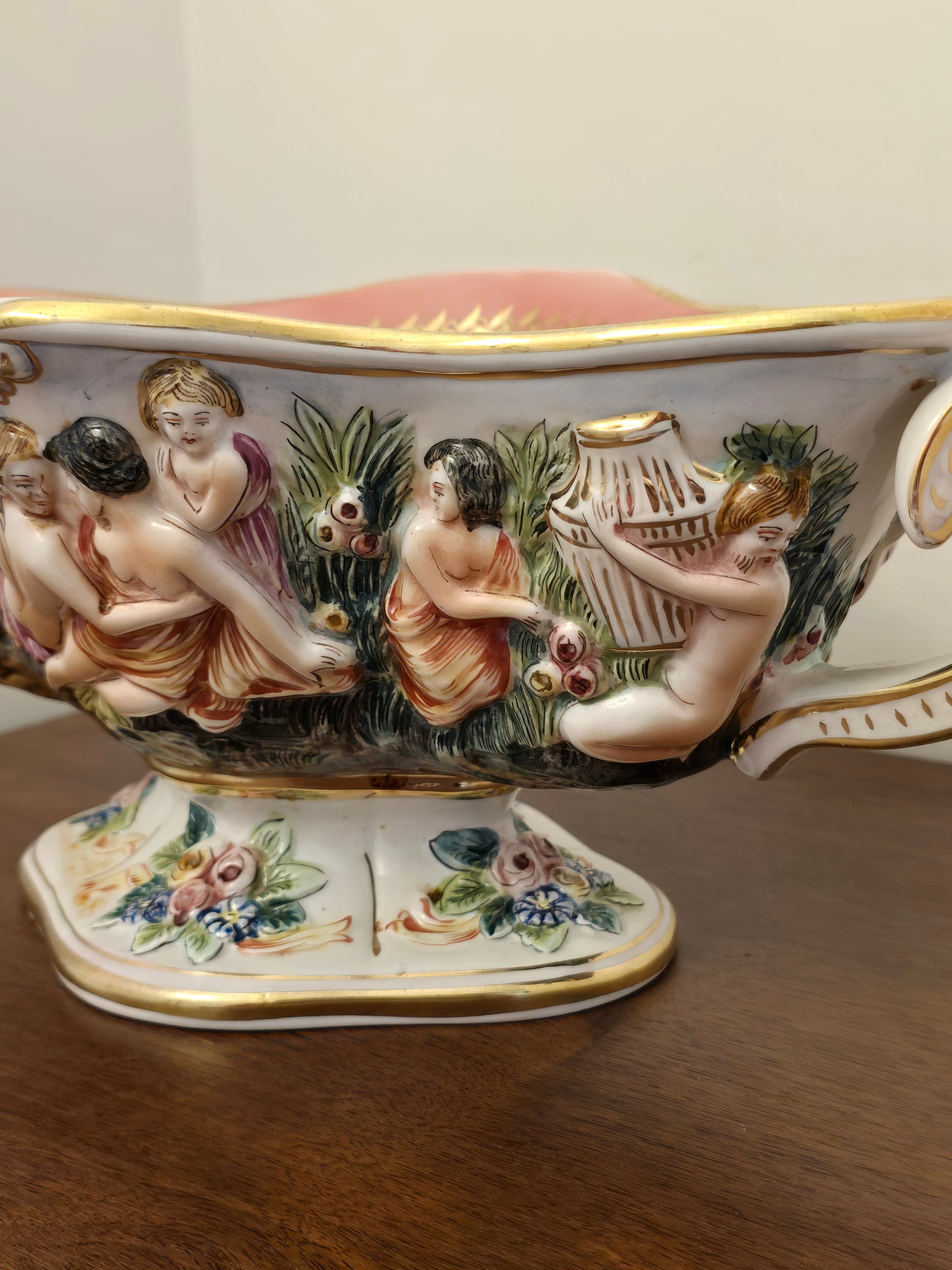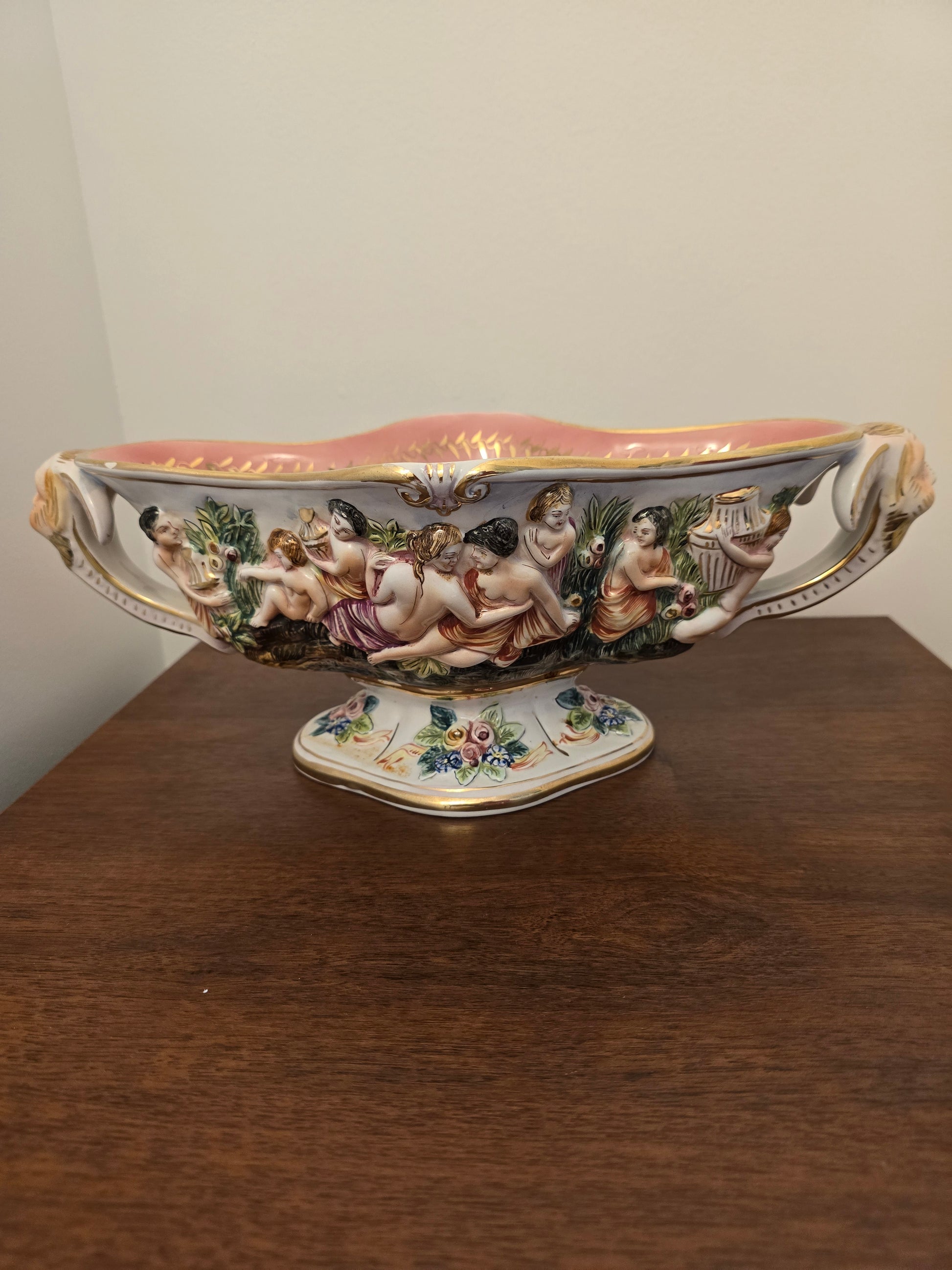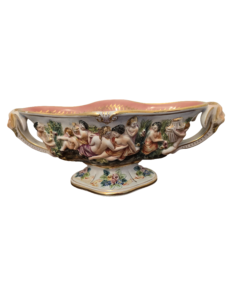 Découvrez la beauté de l'art italien avec cette coupelle en céramique Capodimonte ! Son intérieur rose et son décor coloré d'une scène religieuse apportent une touche de couleur à votre intérieur