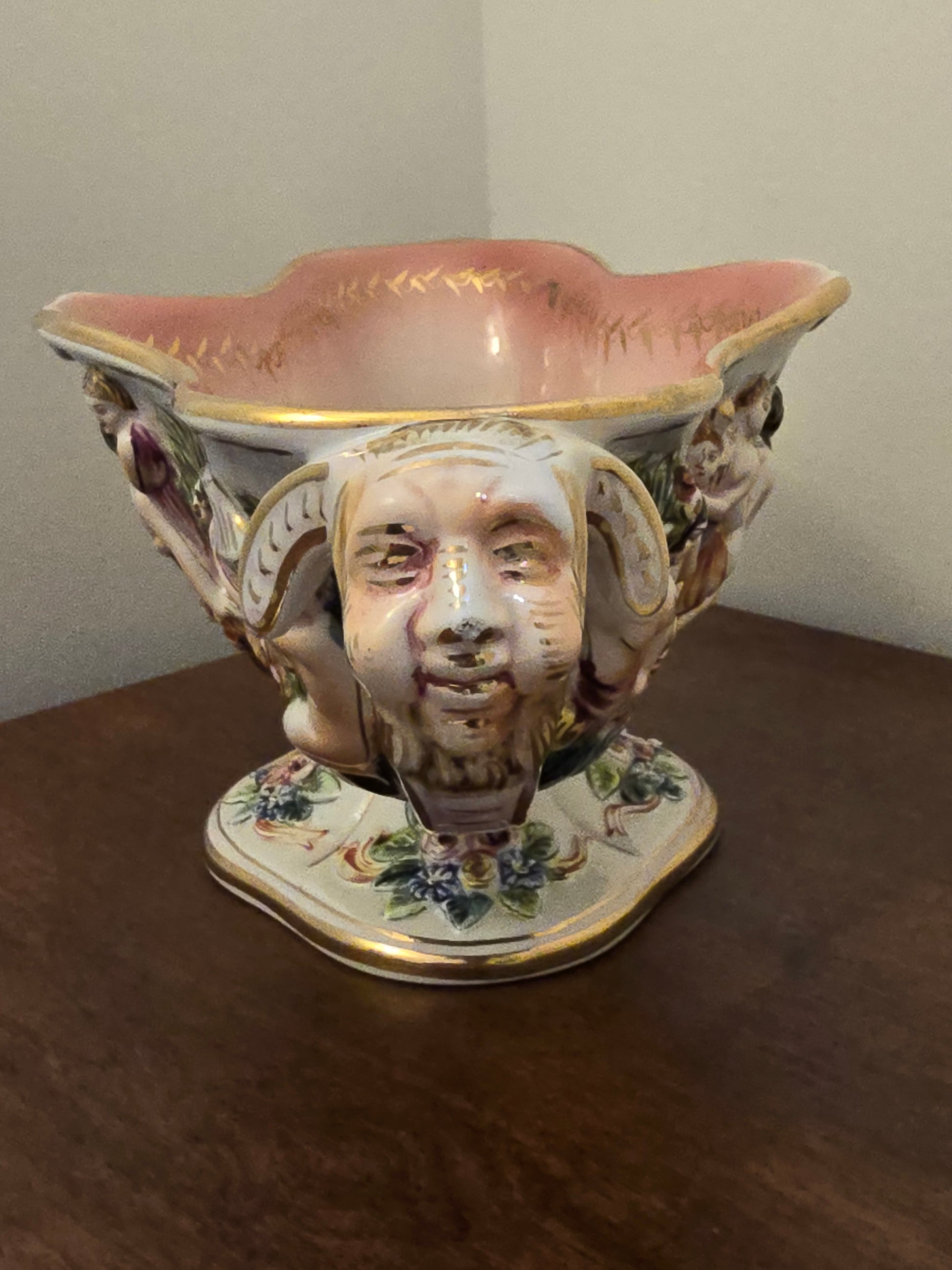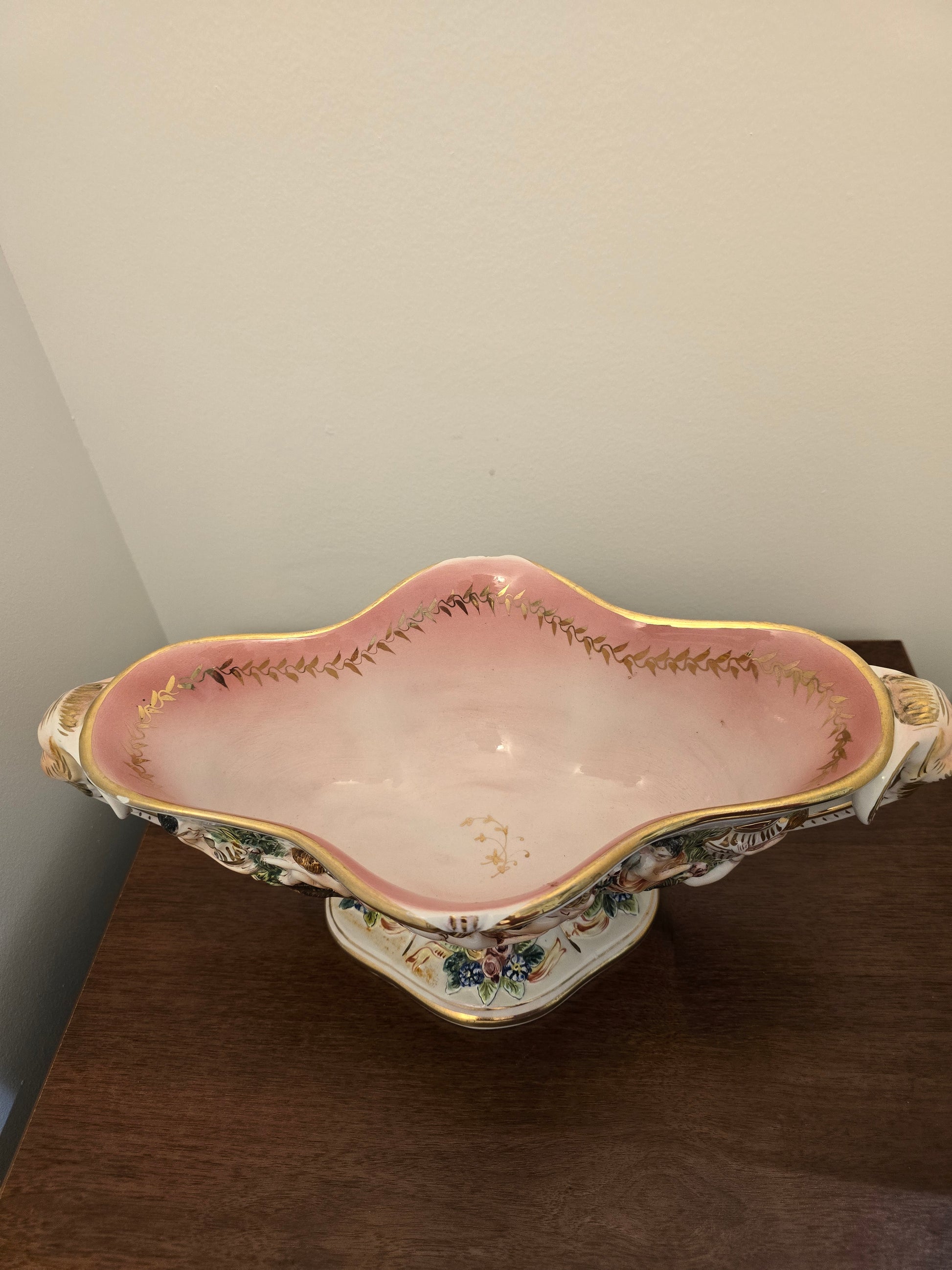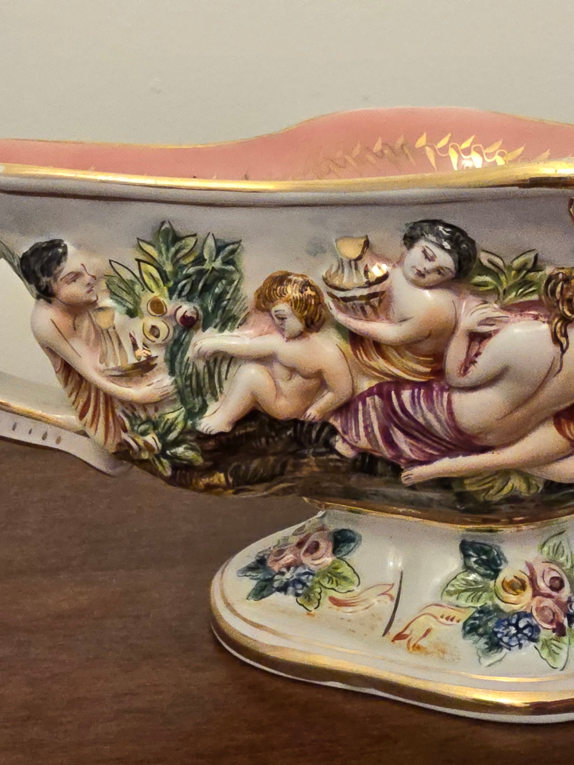 Découvrez la beauté de l'art italien avec cette coupelle en céramique Capodimonte ! Son intérieur rose et son décor coloré d'une scène religieuse apportent une touche de couleur à votre intérieur