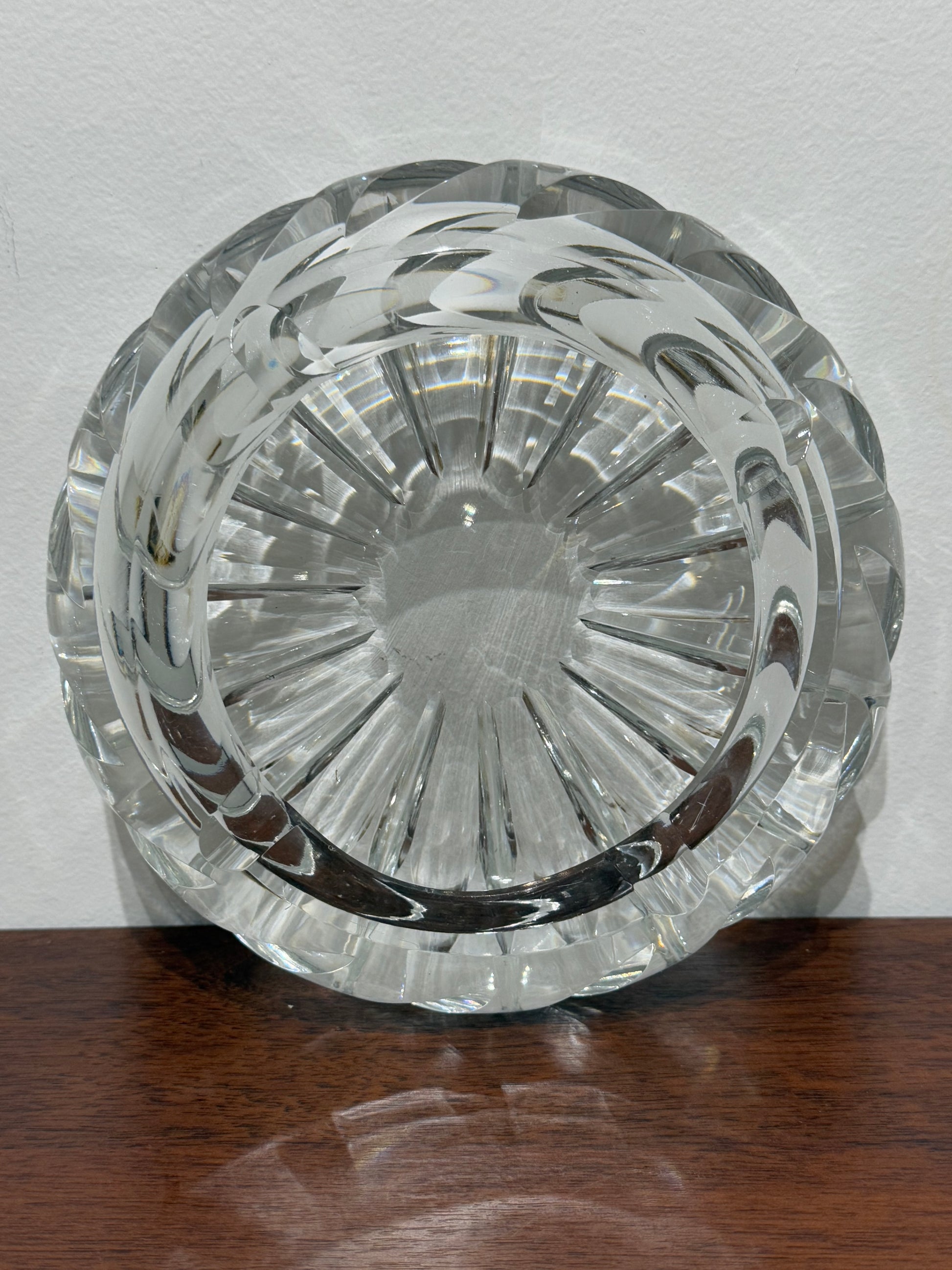 • Superbe cendrier en cristal taillé, aux motifs géométriques rayonnants et bords épais sculptés en relief.