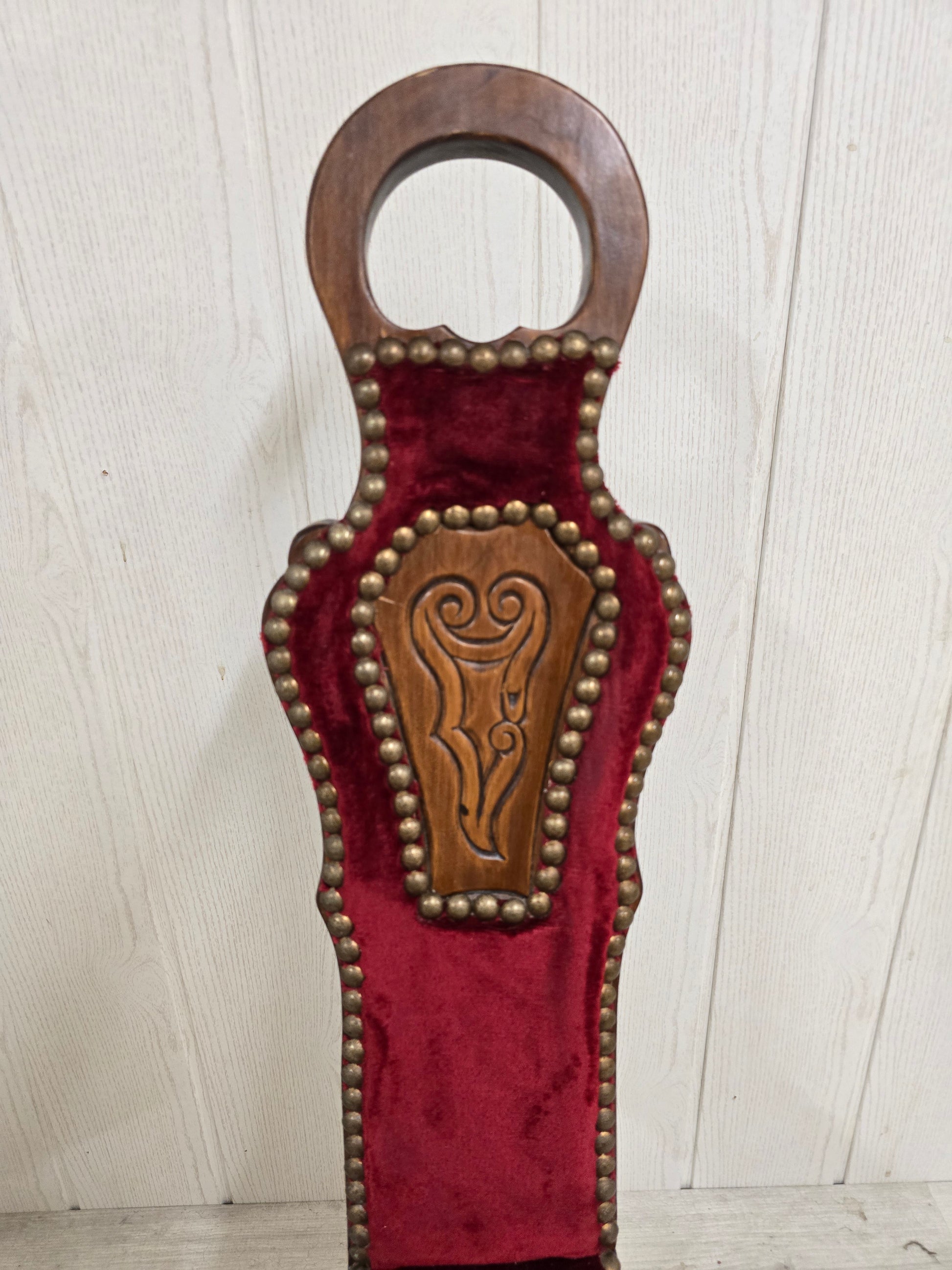 Matériaux : Structure en bois, assise et dossier en velours rouge, clous tapissier décoratifs, médaillon sculpté