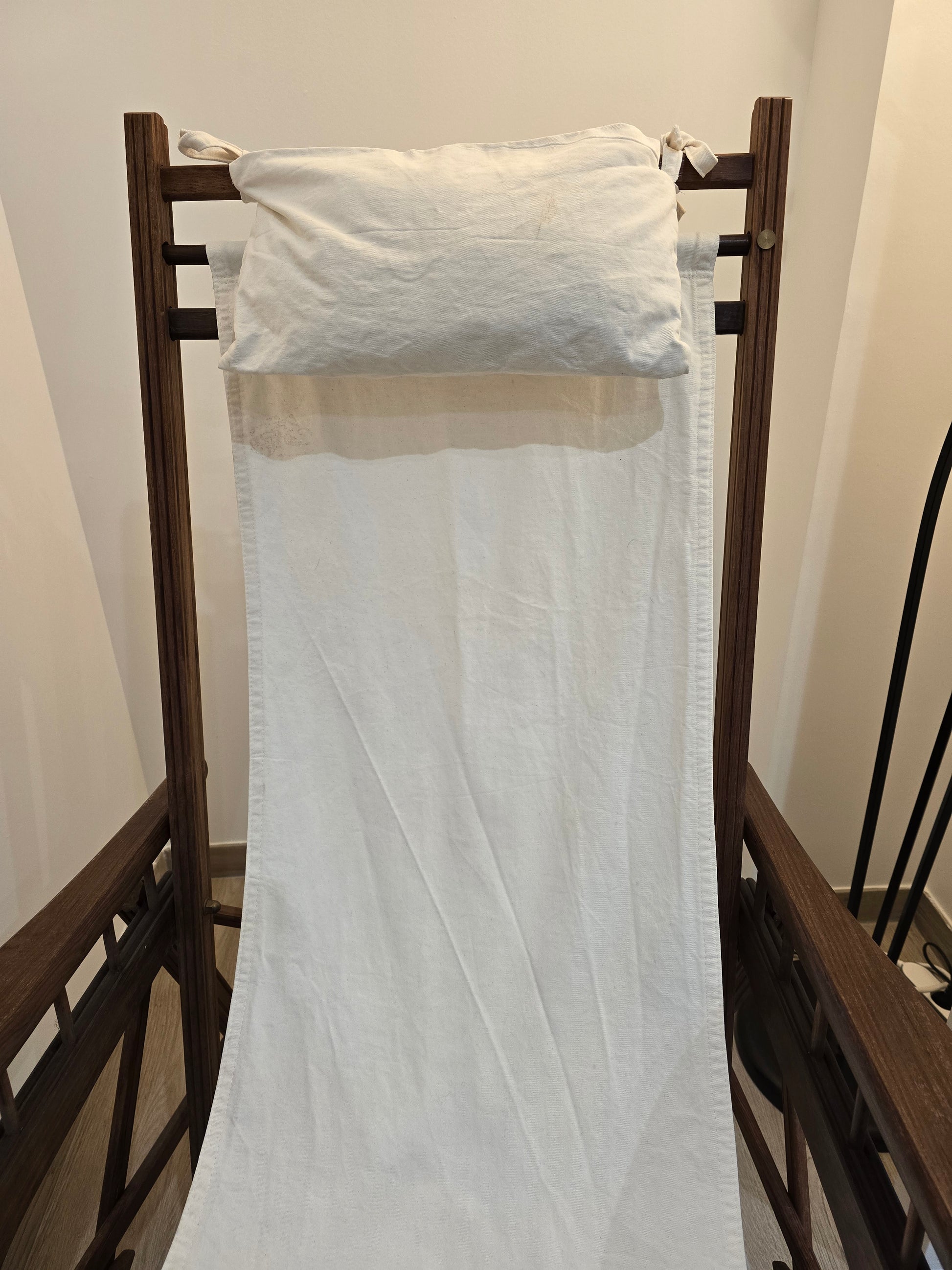 Ajoutez une touche de charme rétro à votre véranda ou jardin avec cette chaise longue pliante vintage. Fabriquée en chêne des années 50, elle offre un confort optimal grâce à son drap en lin blanc et ses multiples positions réglables. Profitez de vos moments de détente en extérieur avec style.
