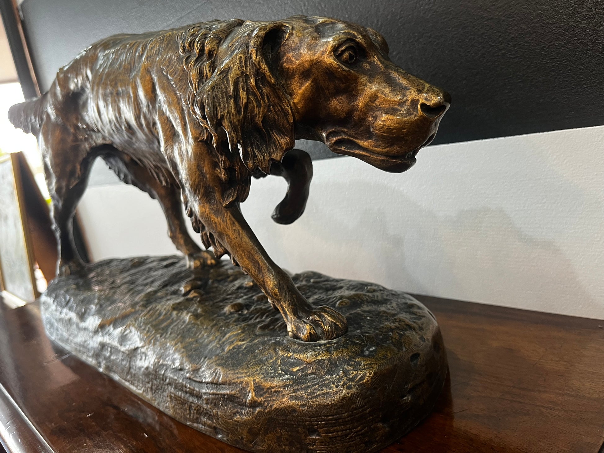 Découvrez la statue en bronze marron patiné du célèbre sculpteur Clovis Edmond Masson (1838-1913), représentant un chien de chasse à l’arrêt. Avec des années d’expérience dans son domaine, cette pièce affinée offre une belle représentation d'un chien de chasse à l'arrêt, ajoutant une touche artistique à votre collection. L’une de ses plus belle sculpture façonnée artisanalement un travail magnifique signé de lui même.