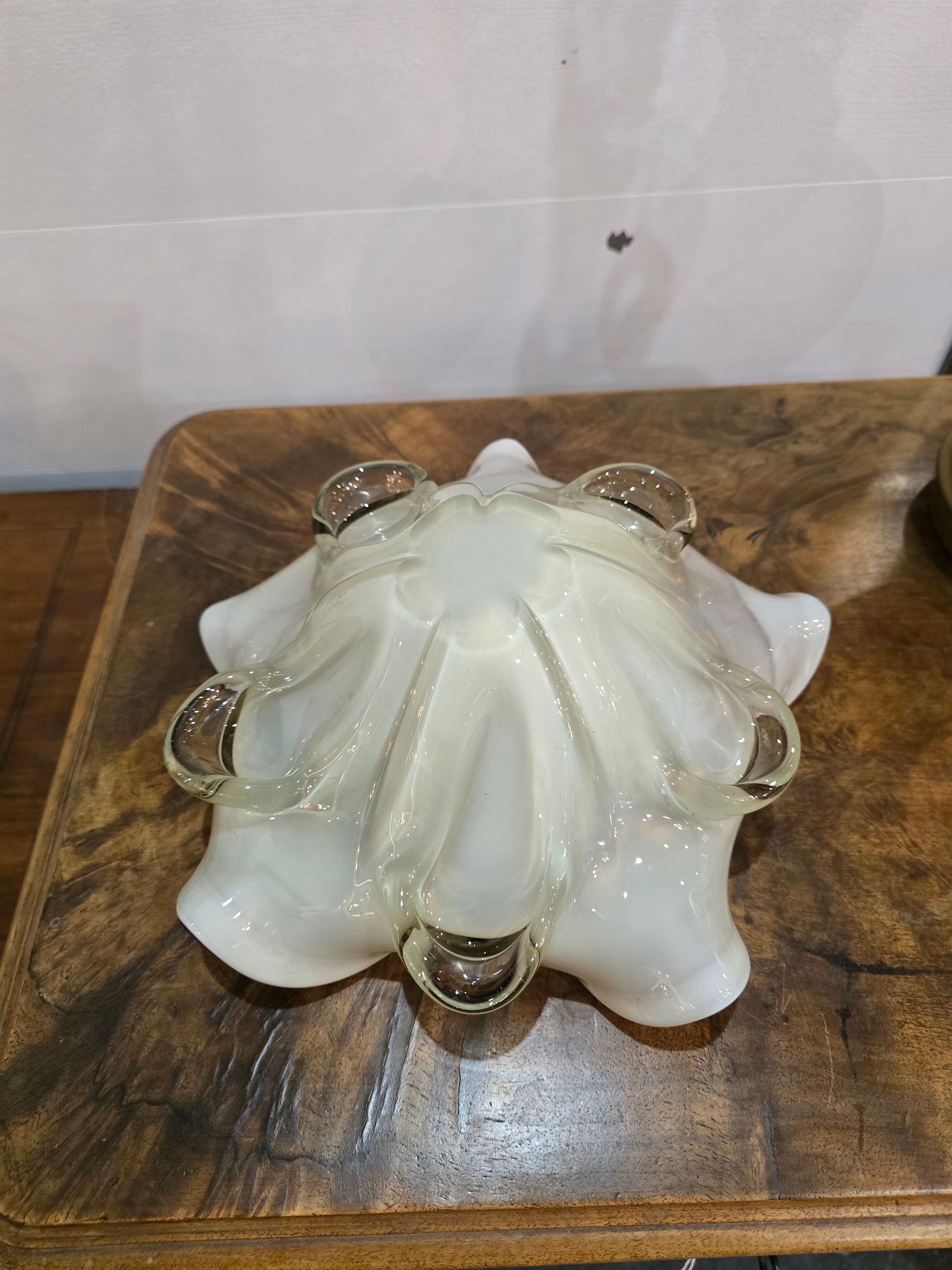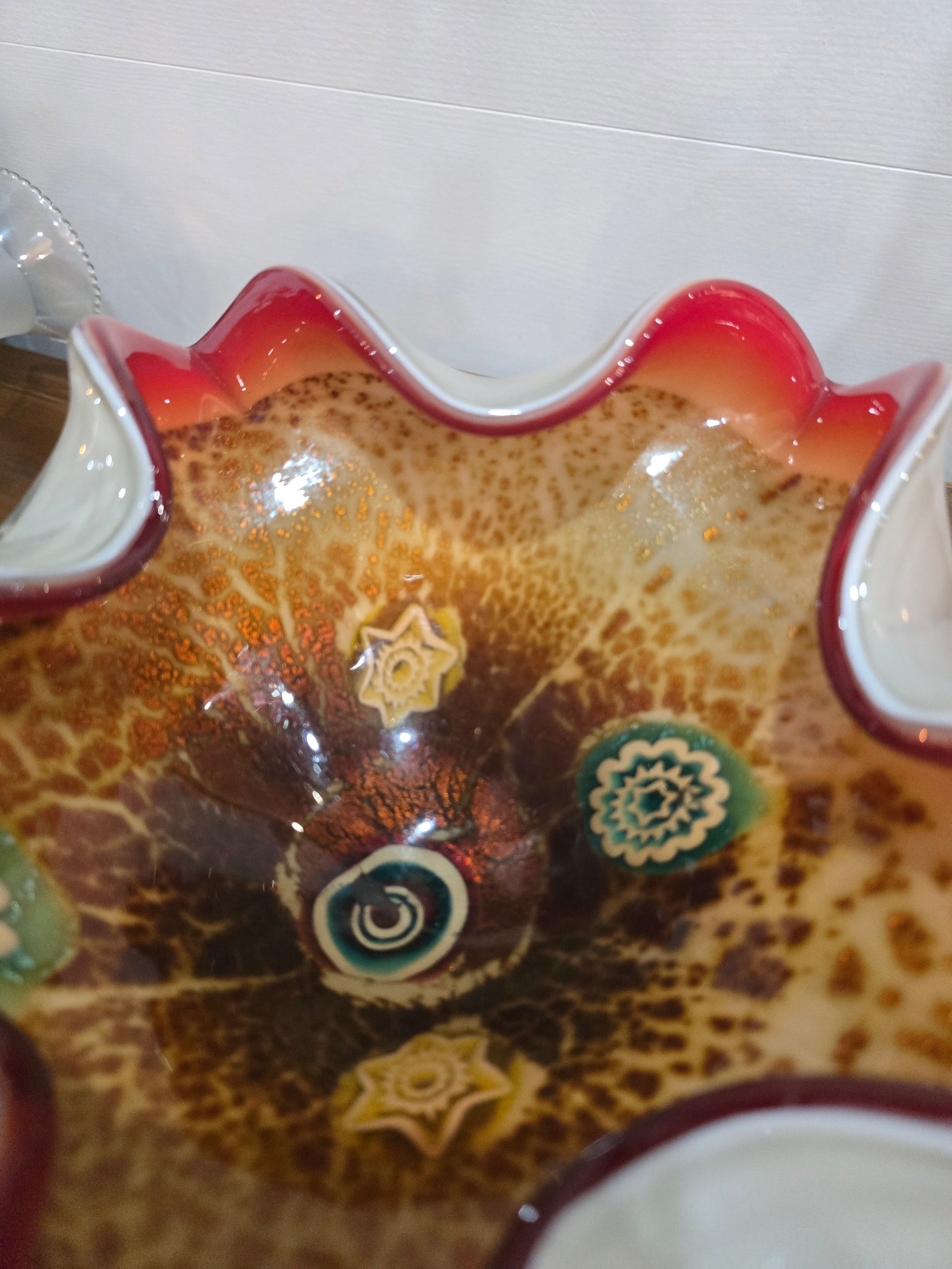 Superbe coupe en verre soufflé de style Murano, ornée d’un décor vibrant de millefiori au centre. La pièce présente un magnifique bord ondulé rouge et blanc, travaillé à chaud, rappelant la forme d’une fleur ouverte.