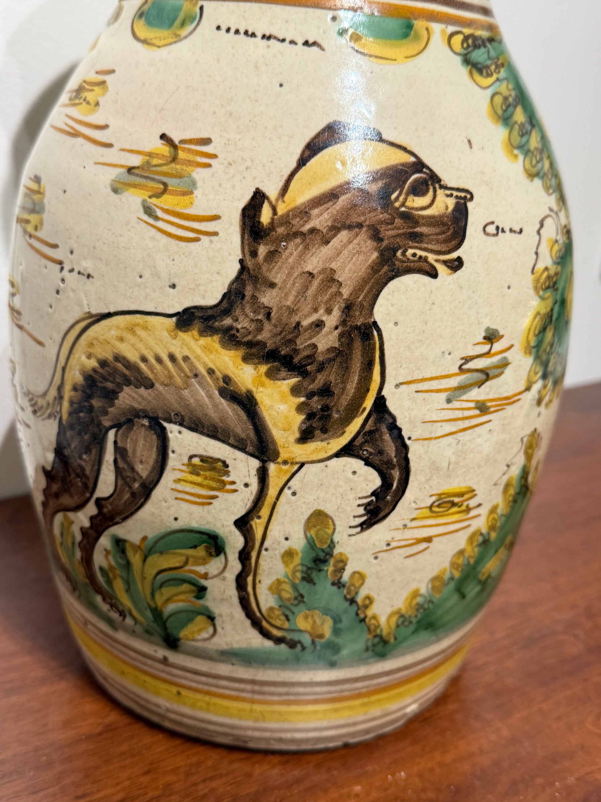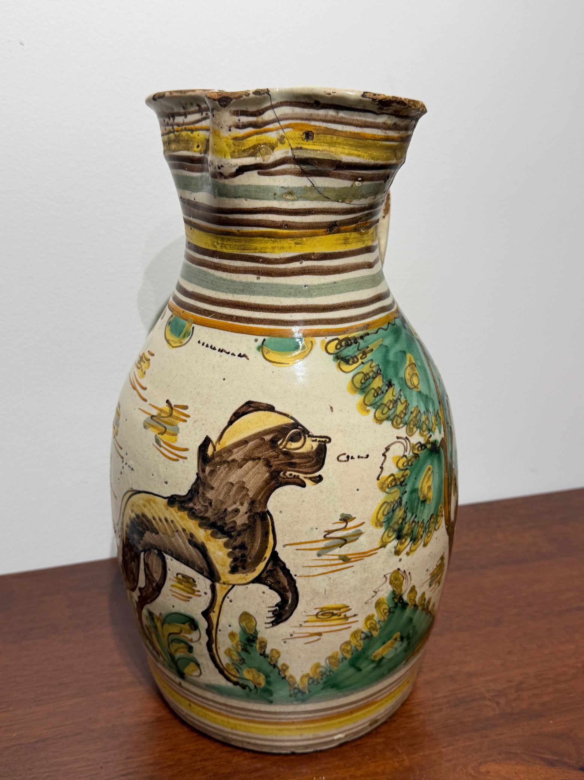 Cette magnifique cruche en faïence polychrome est un véritable témoignage du passé, avec son design rustique et ses motifs animaliers naïfs. Elle est probablement originaire du sud de la France ou d’Italie, où ce type de faïence populaire était très répandu entre le XVIIIe et le XIXe siècle.