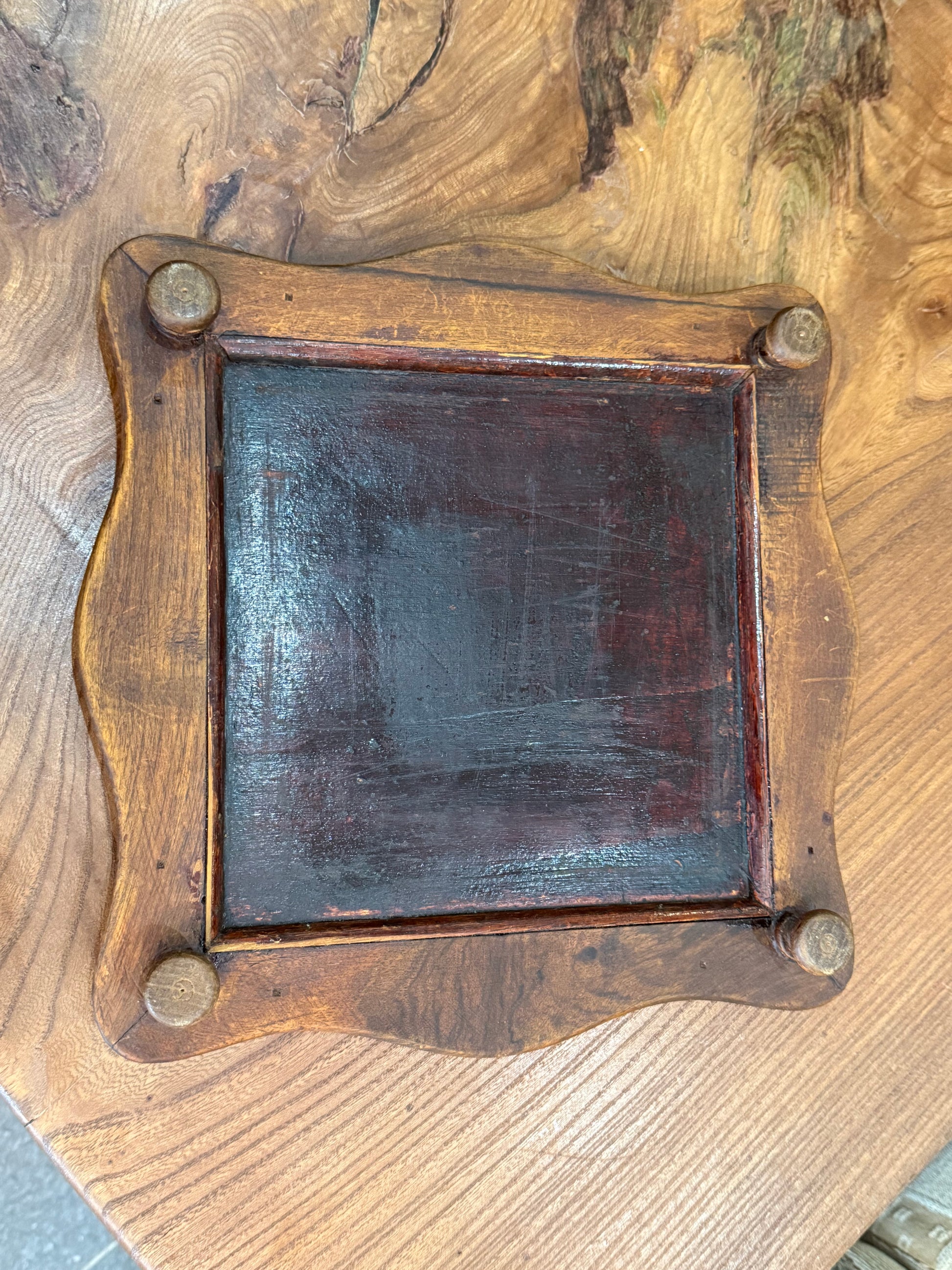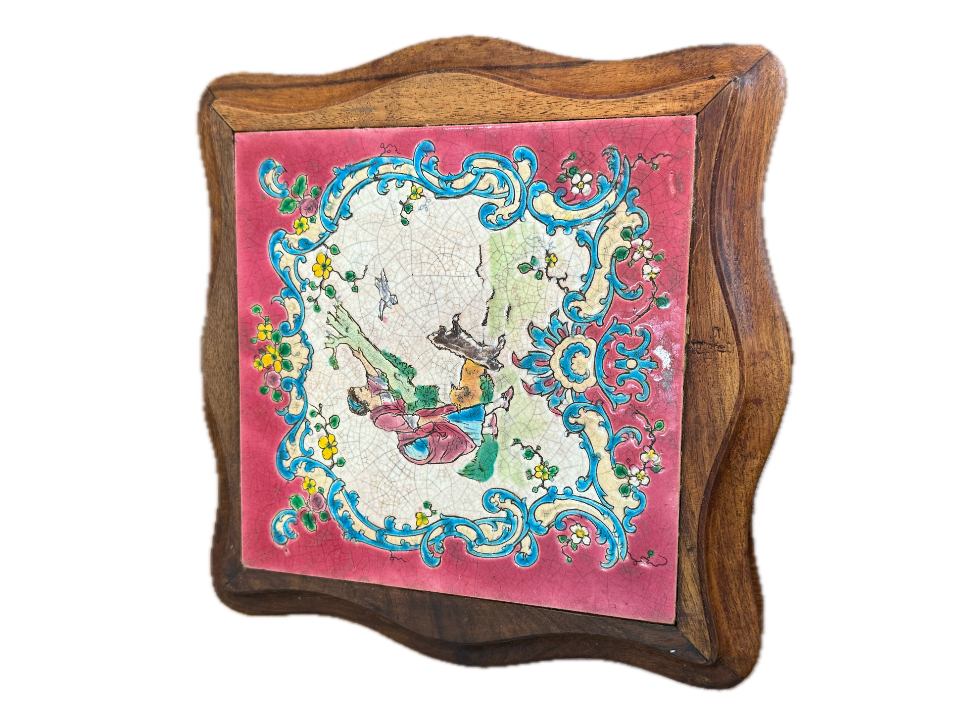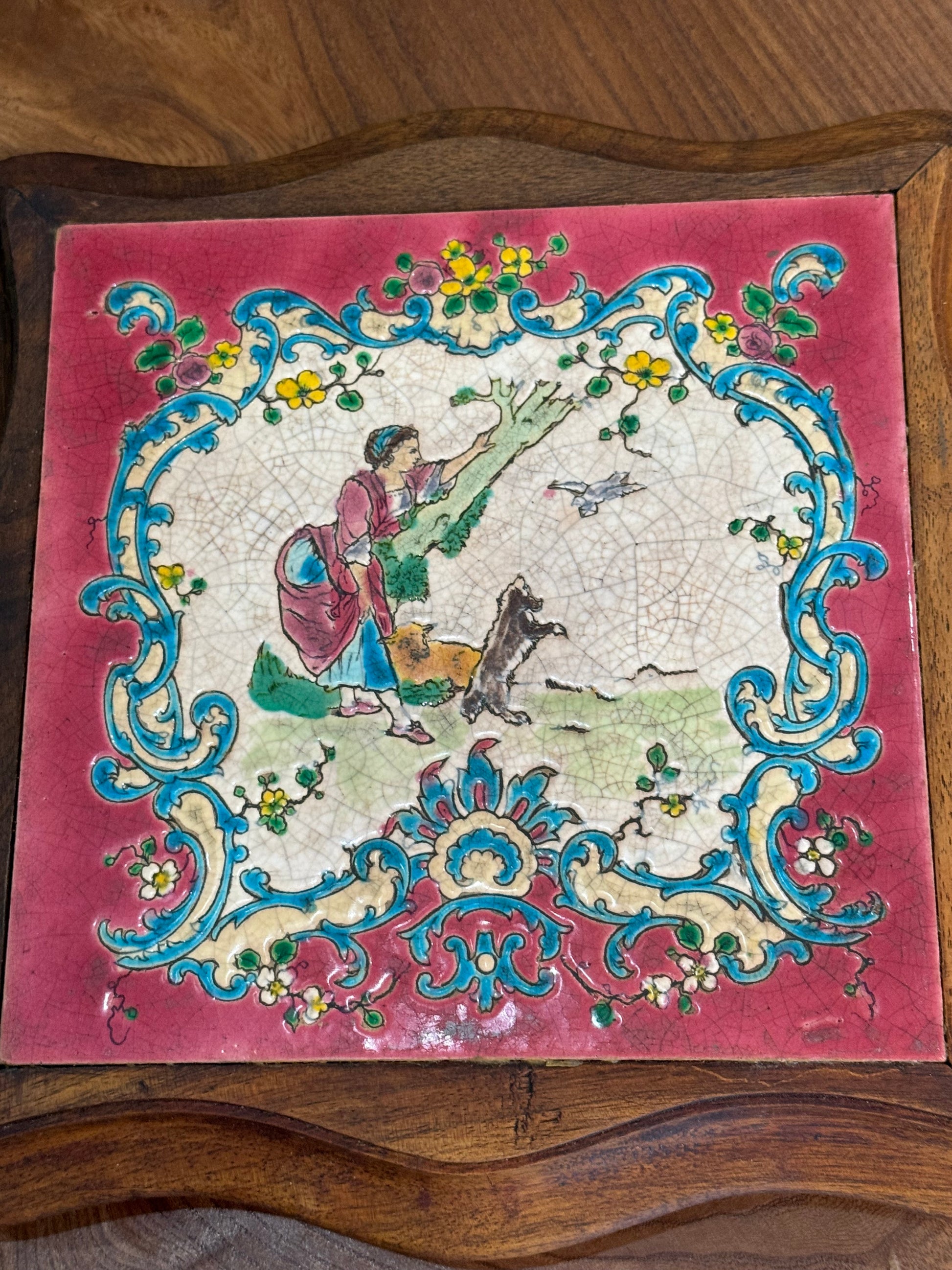 Charmant dessous de plat ancien composé d’un carreau de faïence polychrome émaillée à décor pastoral représentant une scène champêtre : une femme nourrissant des chèvres, entourée d’un encadrement floral baroque coloré. L’ensemble repose sur une monture en bois sculpté aux bords ondulés, apportant une belle touche rustique et décorative.