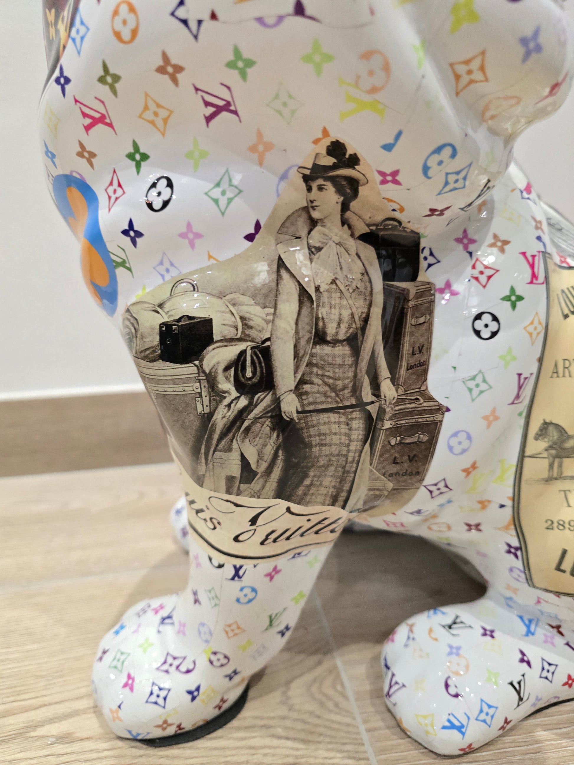 Sublime sculpture en forme de chien bulldog, entièrement customisée dans un esprit Pop Art de luxe, mêlant le graphisme emblématique de la maison Louis Vuitton à des visuels artistiques puissants : motifs multicolores “Monogram”, affiches vintage, portraits féminins détournés et visuels percutants façon street art.