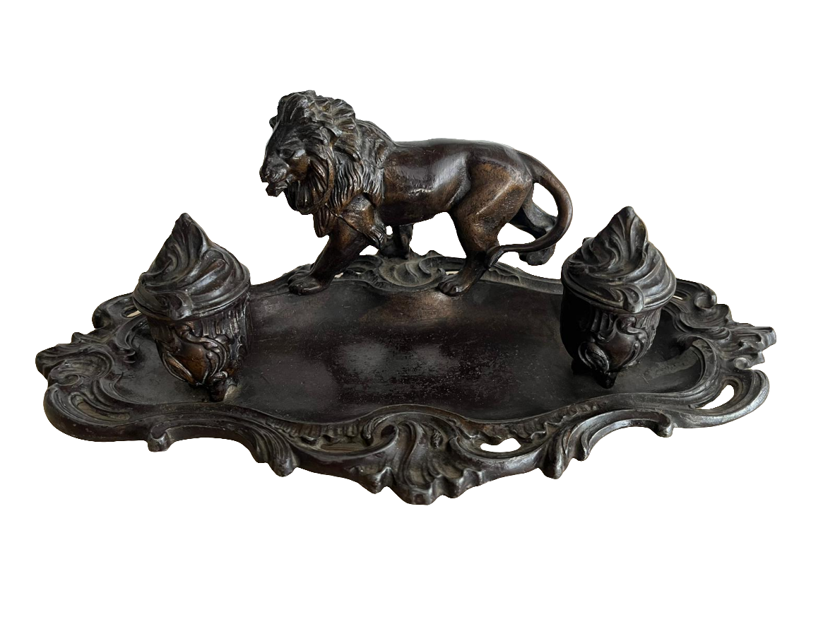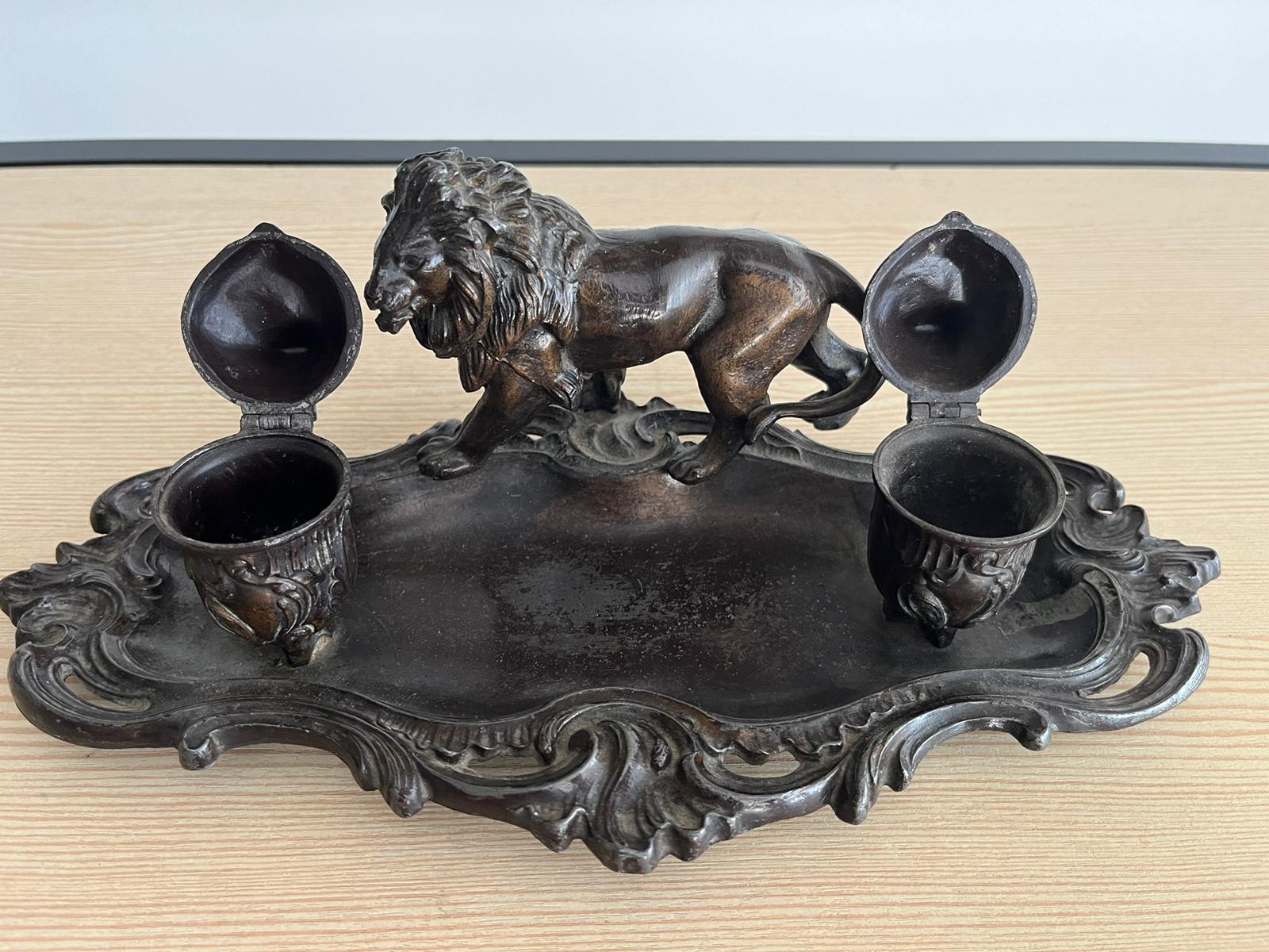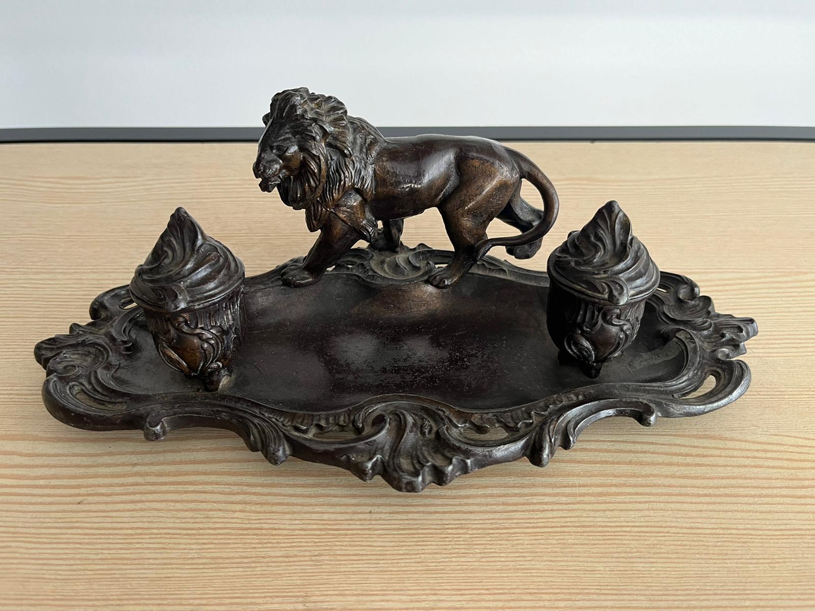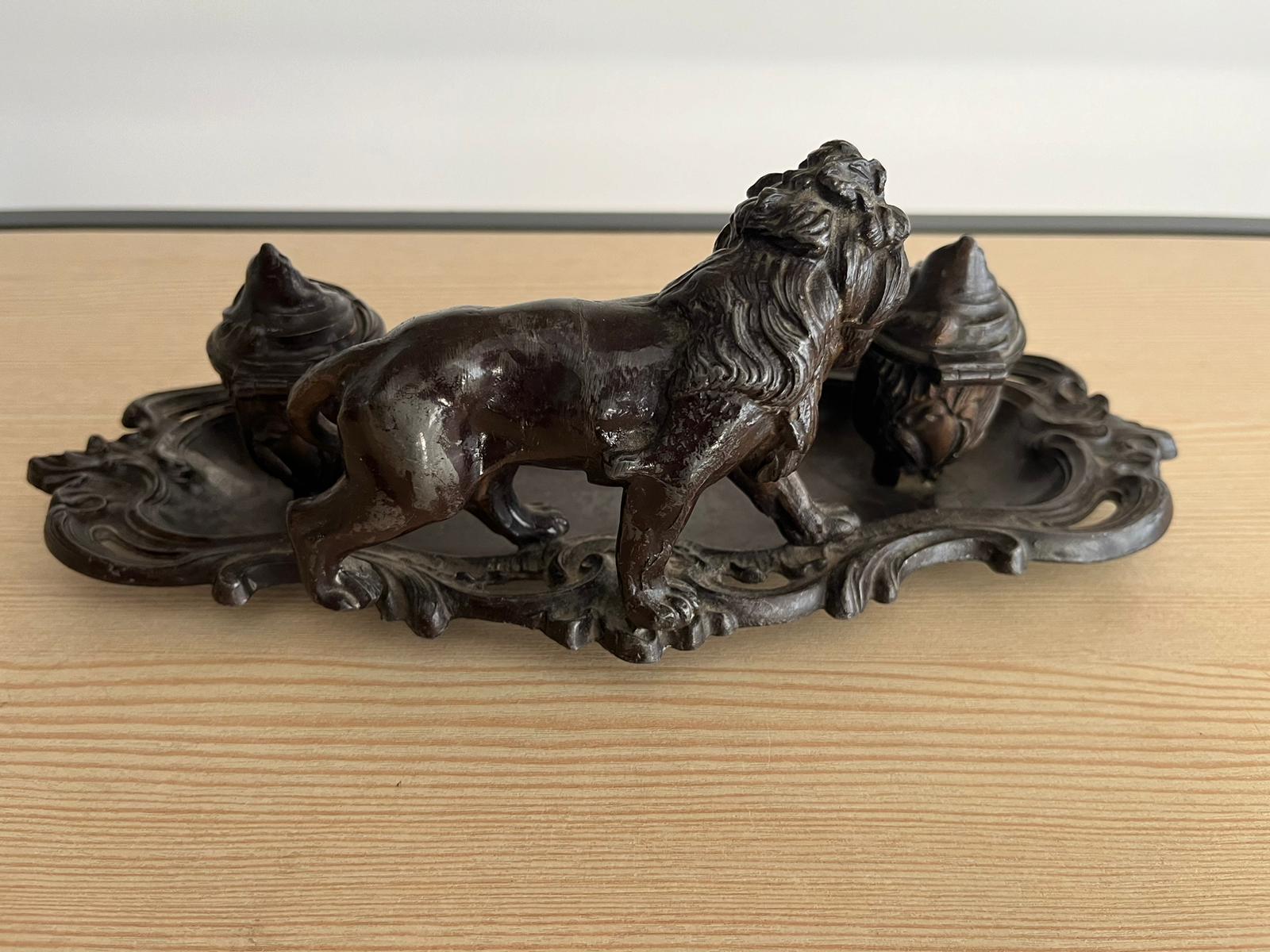 Ce magnifique encrier double en forme de lion, réalisé au 19ème siècle, est un véritable chef-d'œuvre de l'artisanat. Avec ses deux compartiments pour contenir l'encre, il offre non seulement une fonctionnalité pratique, mais aussi une touche de sophistication et d'élégance à votre bureau. Un bijou pour tout amateur d'antiquités.