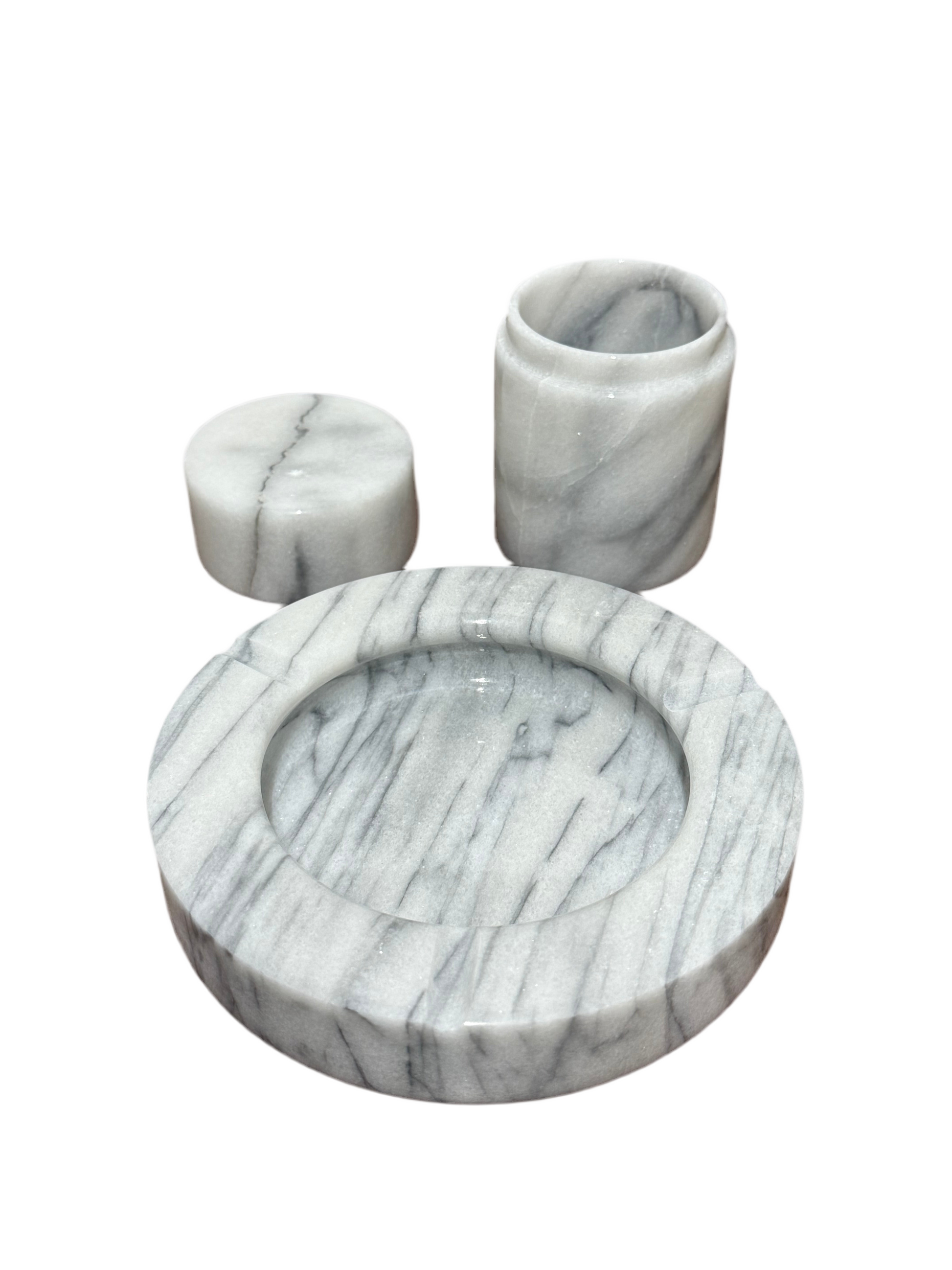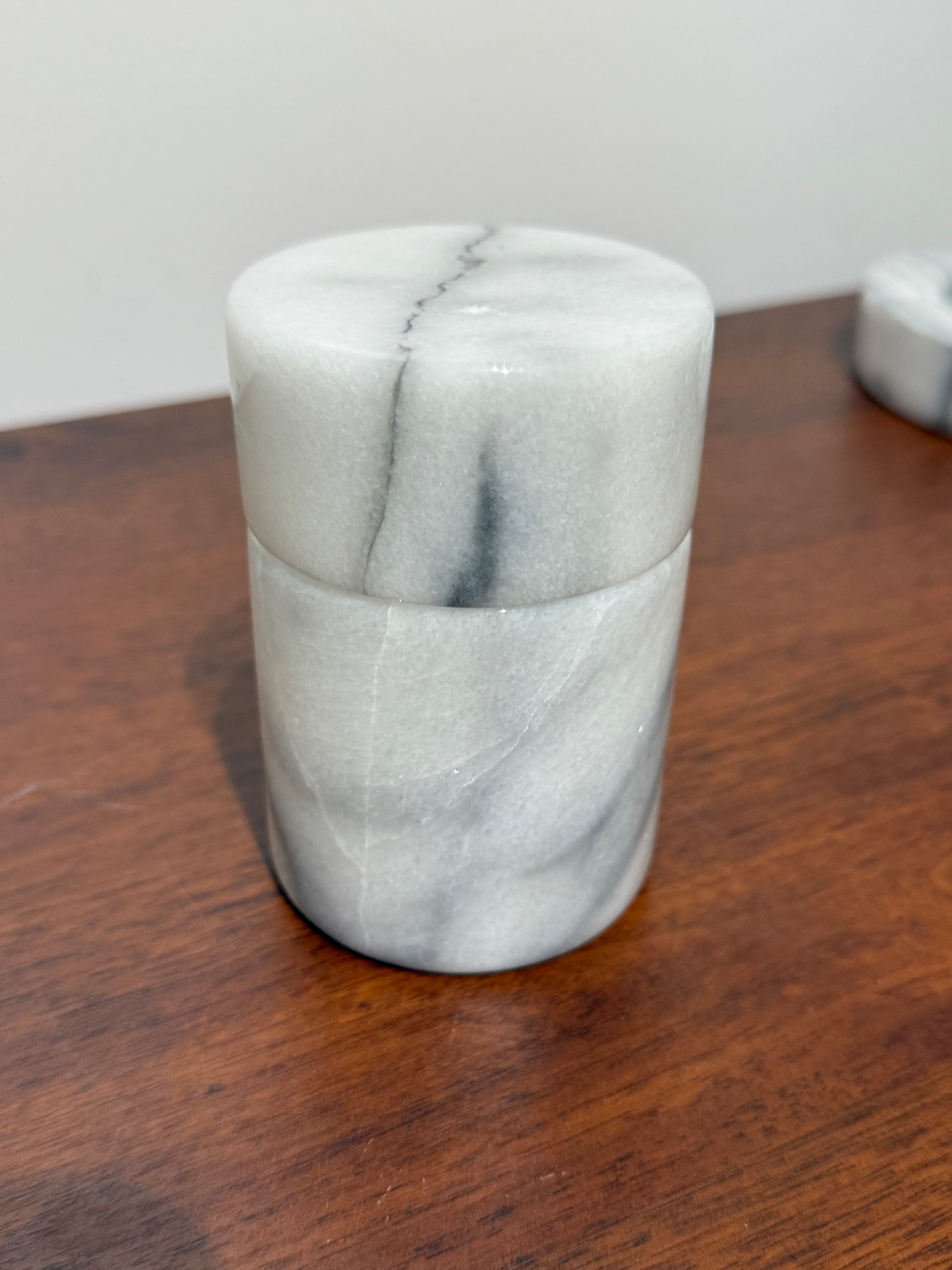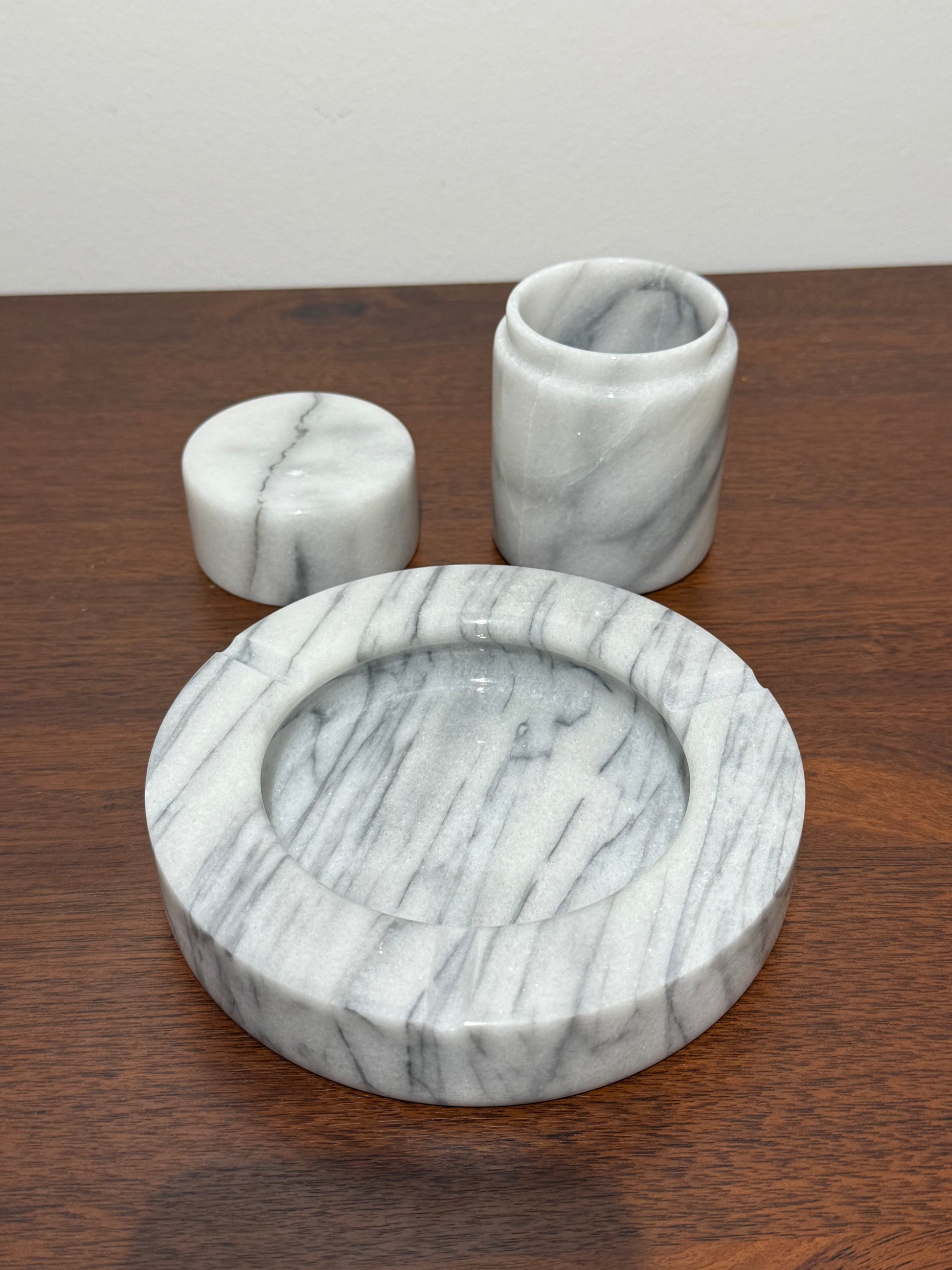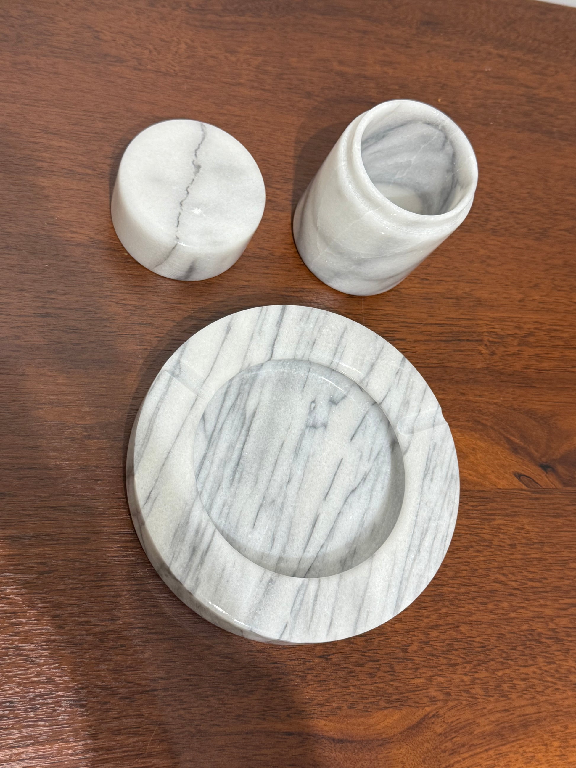 Cet ensemble en marbre se compose d’un cendrier circulaire et d’une boîte de rangement avec couvercle, offrant à la fois élégance et fonctionnalité. Le marbre veiné confère une esthétique raffinée et unique à chaque pièce, garantissant robustesse et intemporalité.