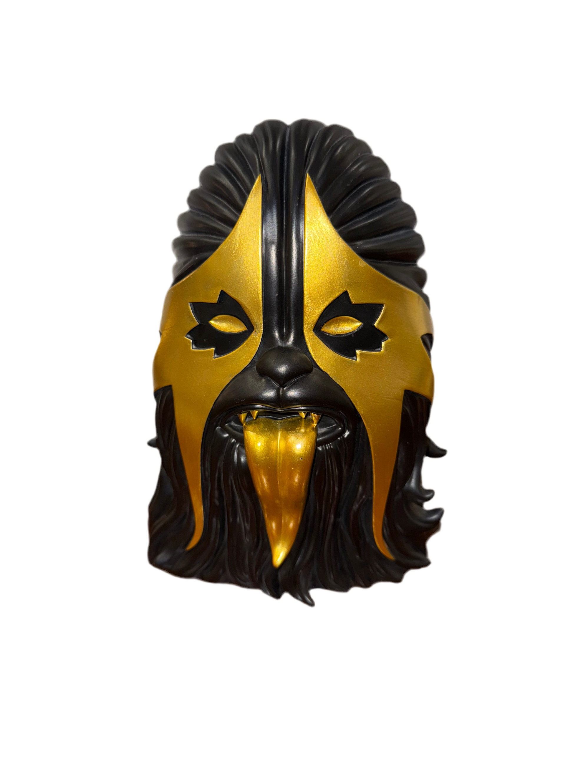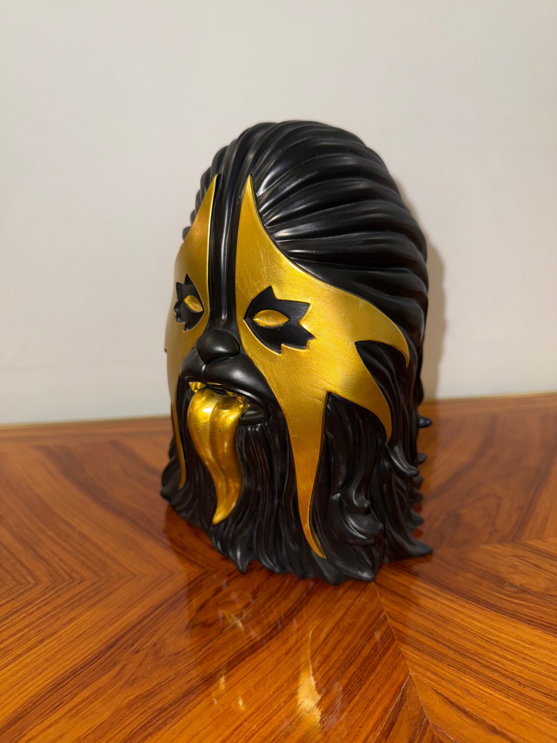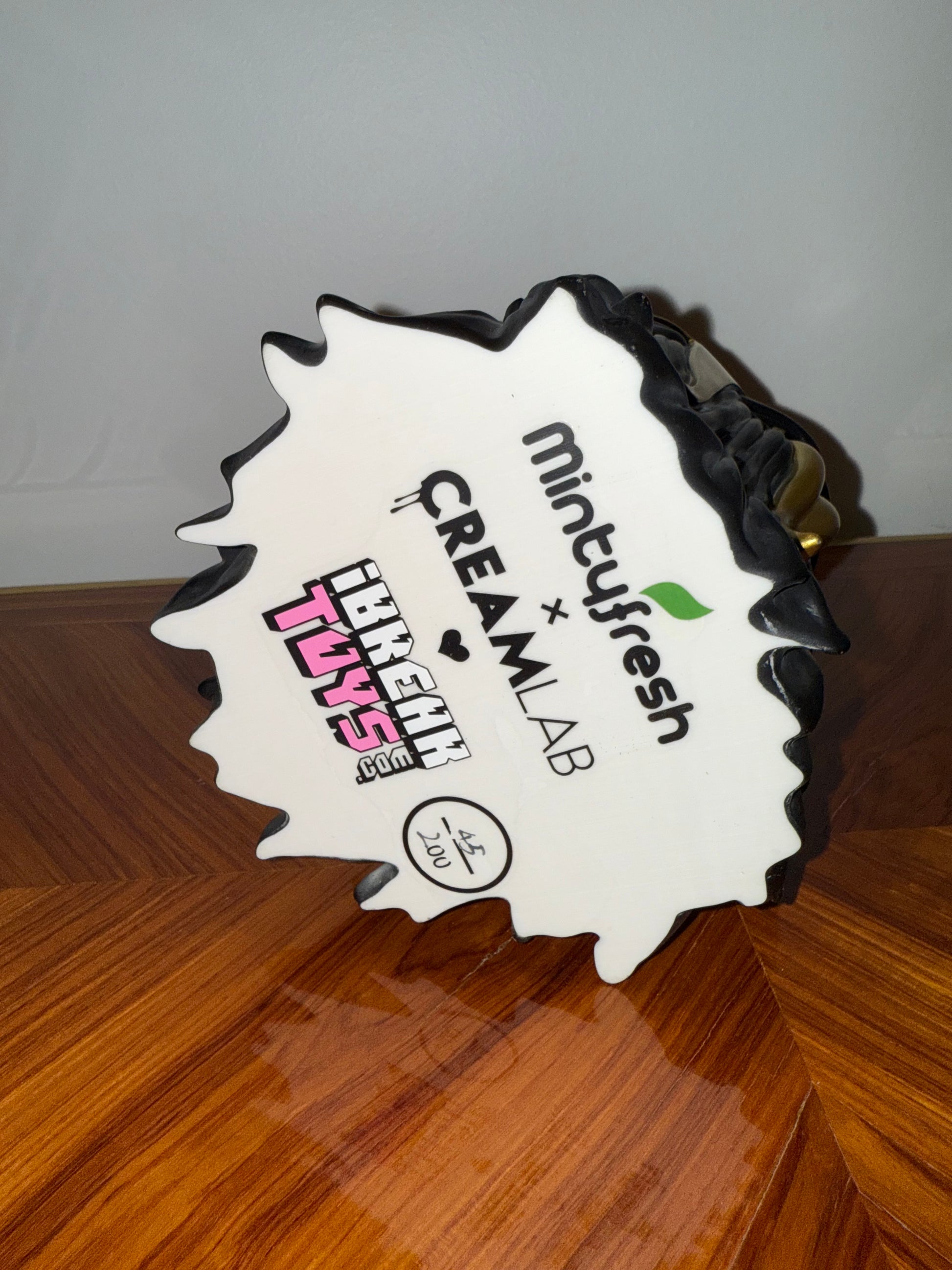 Figurine de collection contemporaine en résine peinte, représentant un personnage hybride à la croisée du monstre, du luchador et du jouet pop art. Le design audacieux mêle noir mat et doré métallisé avec une langue proéminente et menaçante. Réalisée en collaboration entre ibreaktoys, Mintyfresh et CREAMLAB, cette pièce fait partie d’une édition limitée à 200 exemplaires, celui-ci portant le numéro 45.