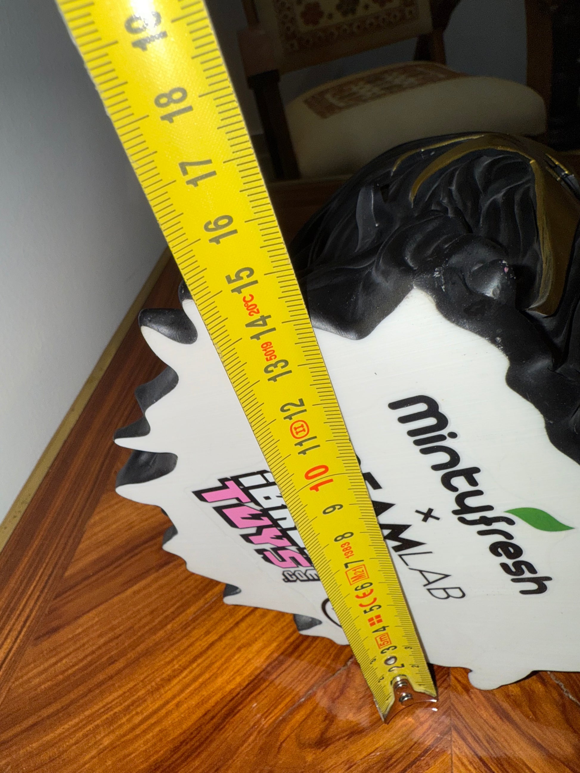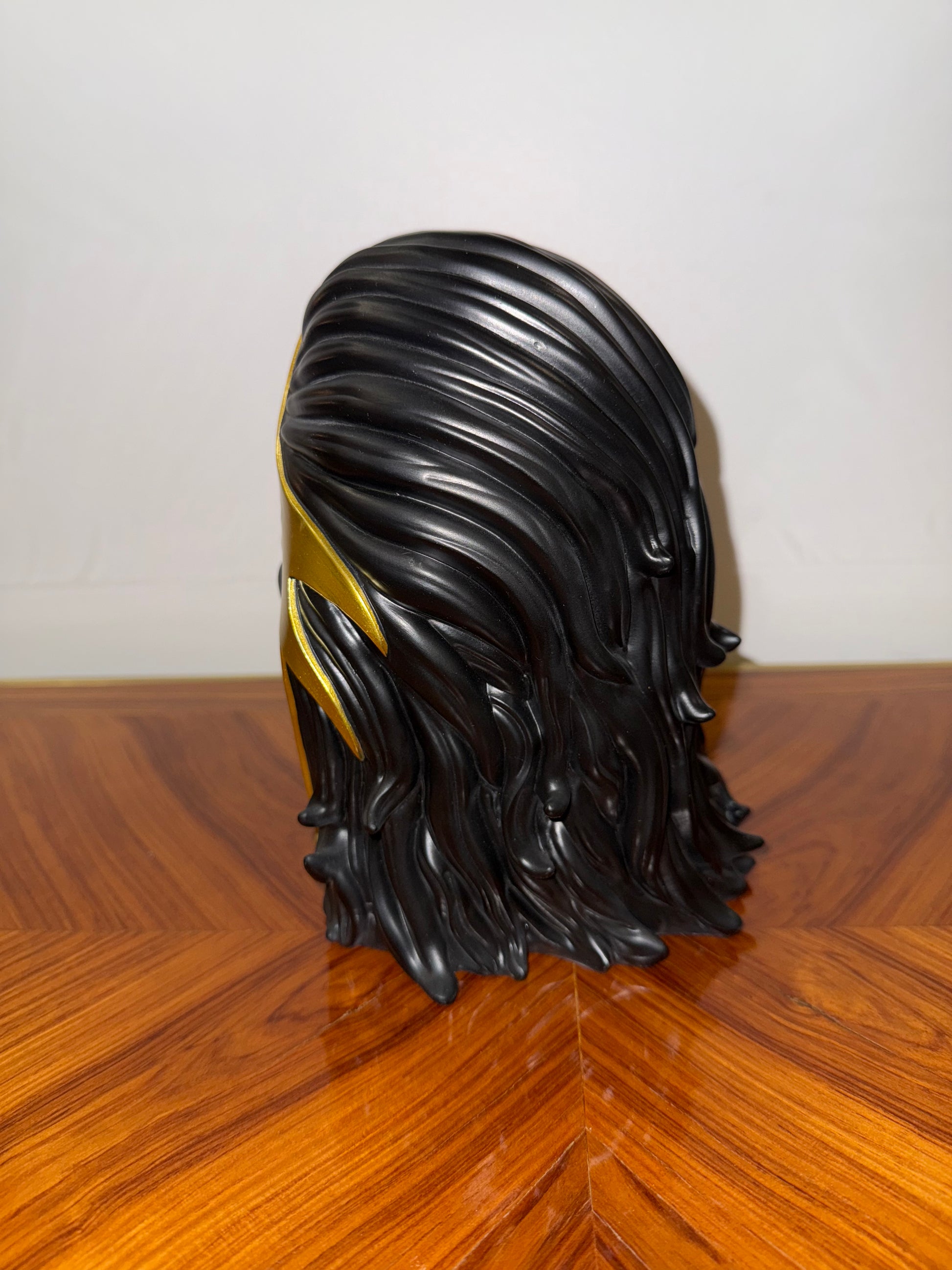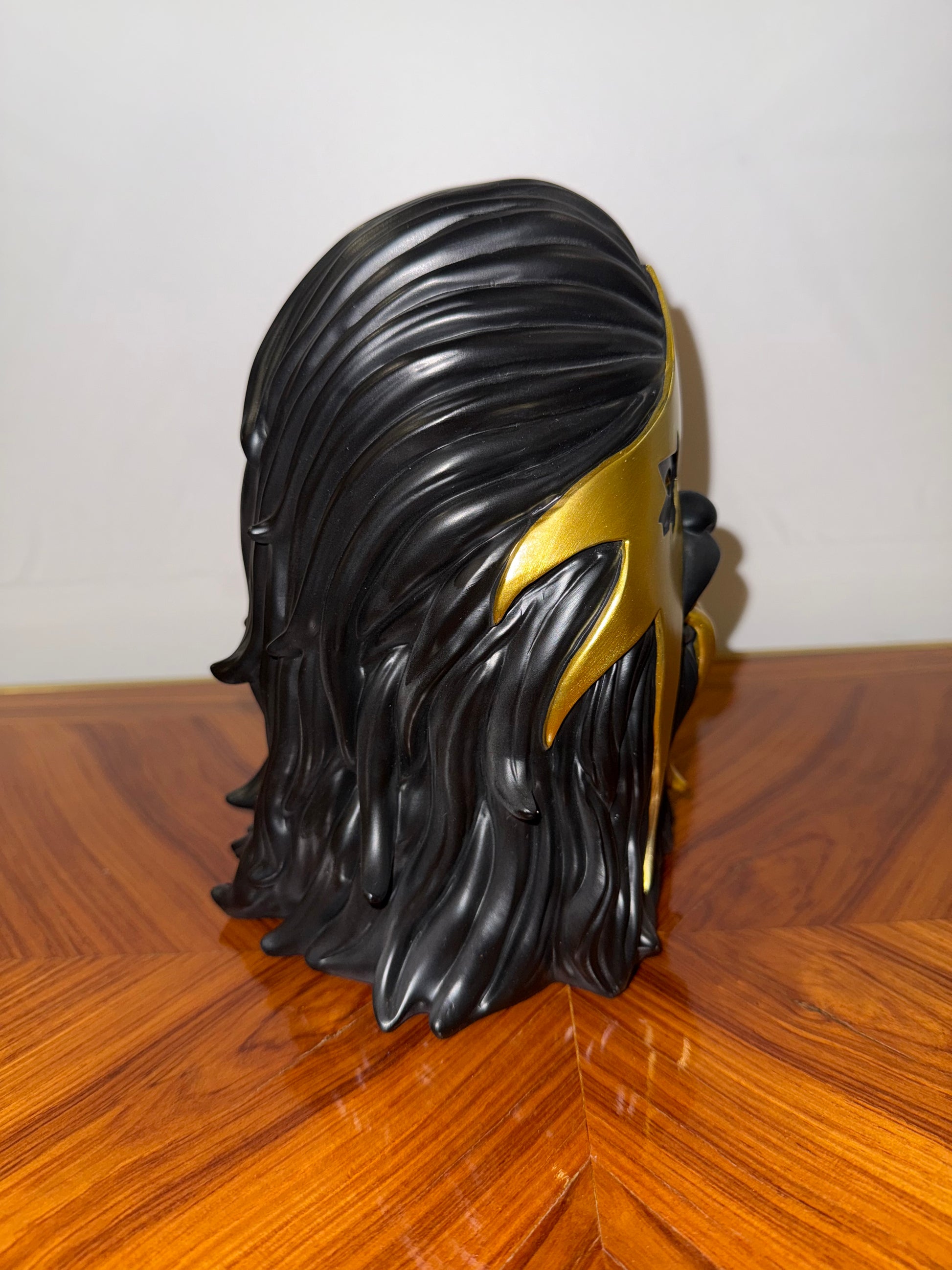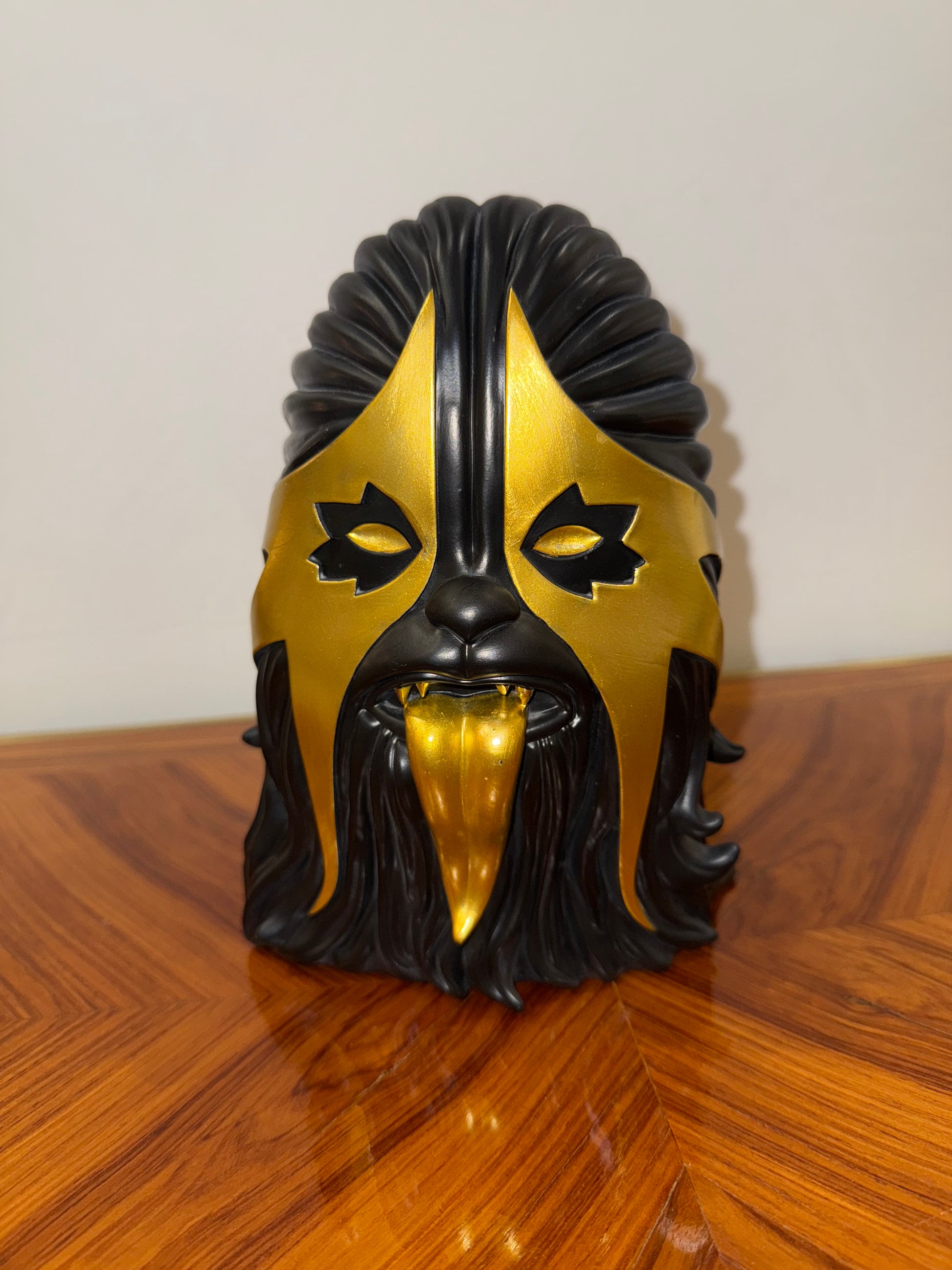 Figurine de collection contemporaine en résine peinte, représentant un personnage hybride à la croisée du monstre, du luchador et du jouet pop art. Le design audacieux mêle noir mat et doré métallisé avec une langue proéminente et menaçante. Réalisée en collaboration entre ibreaktoys, Mintyfresh et CREAMLAB, cette pièce fait partie d’une édition limitée à 200 exemplaires, celui-ci portant le numéro 45.