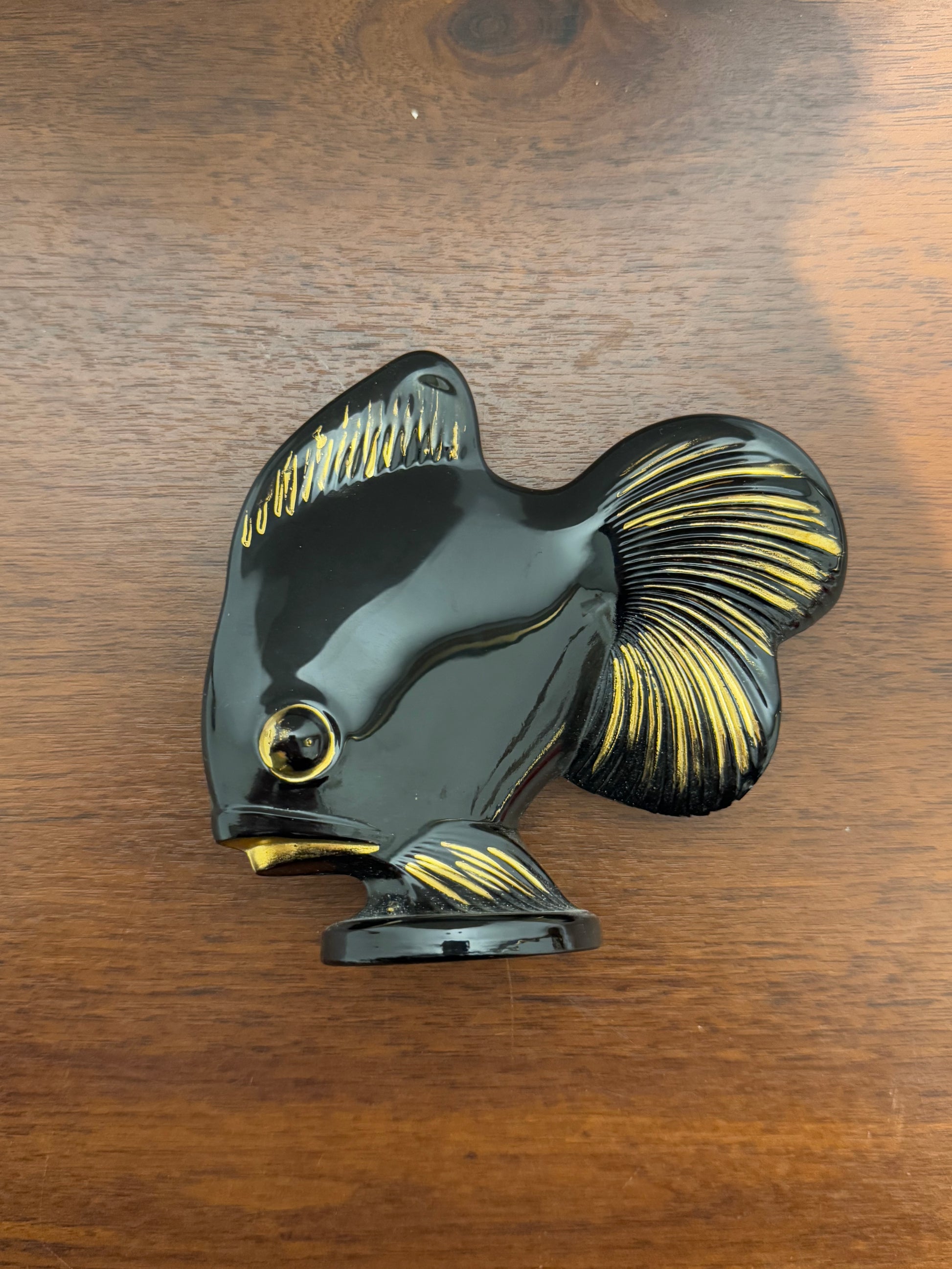 • Belle figurine décorative en céramique noire, représentant un poisson aux détails dorés sur les nageoires et les yeux.