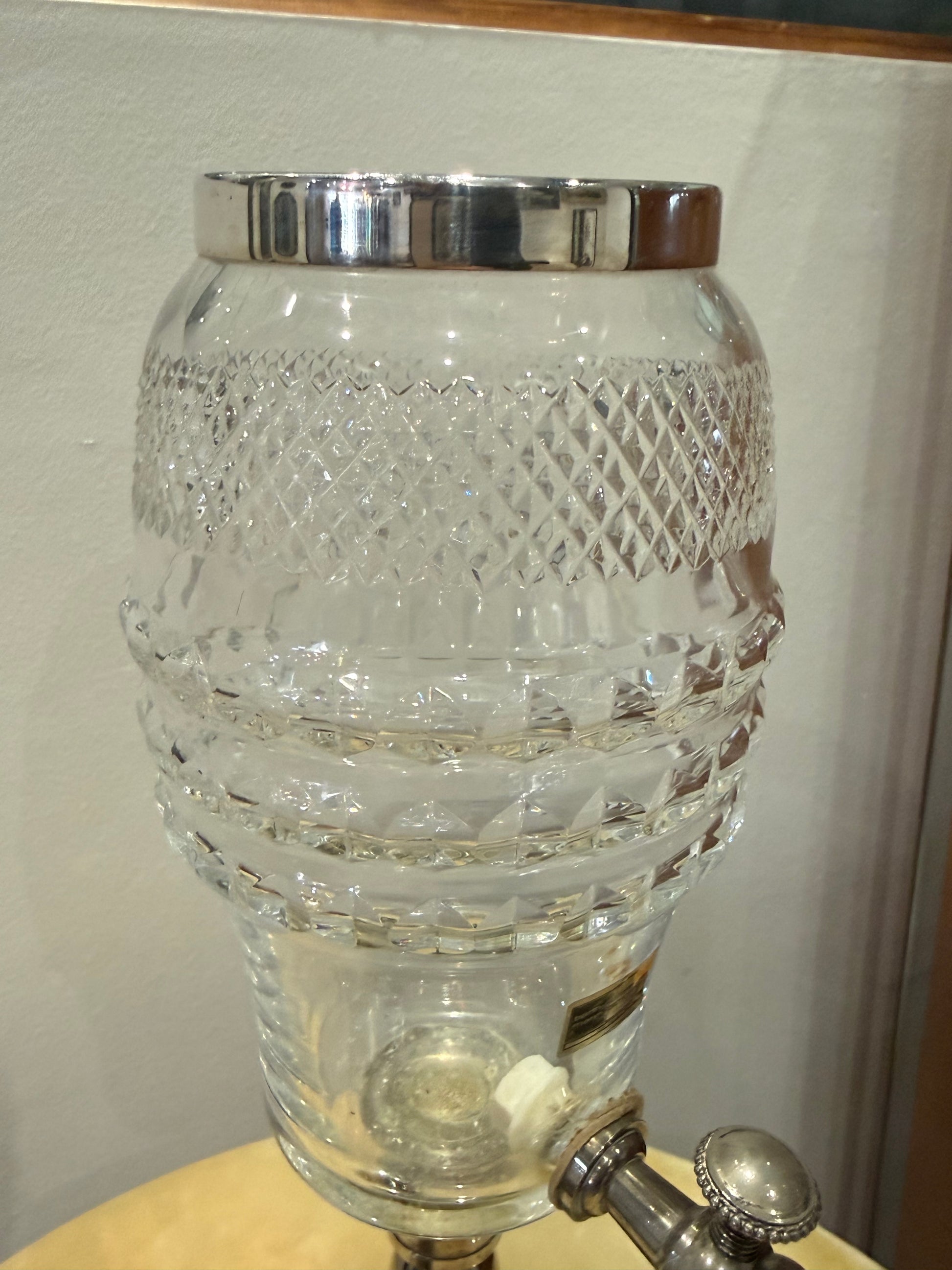 Authentique fontaine à absinthe en cristal taillé, montée sur un piétement en métal argenté, de la maison Barthmann.