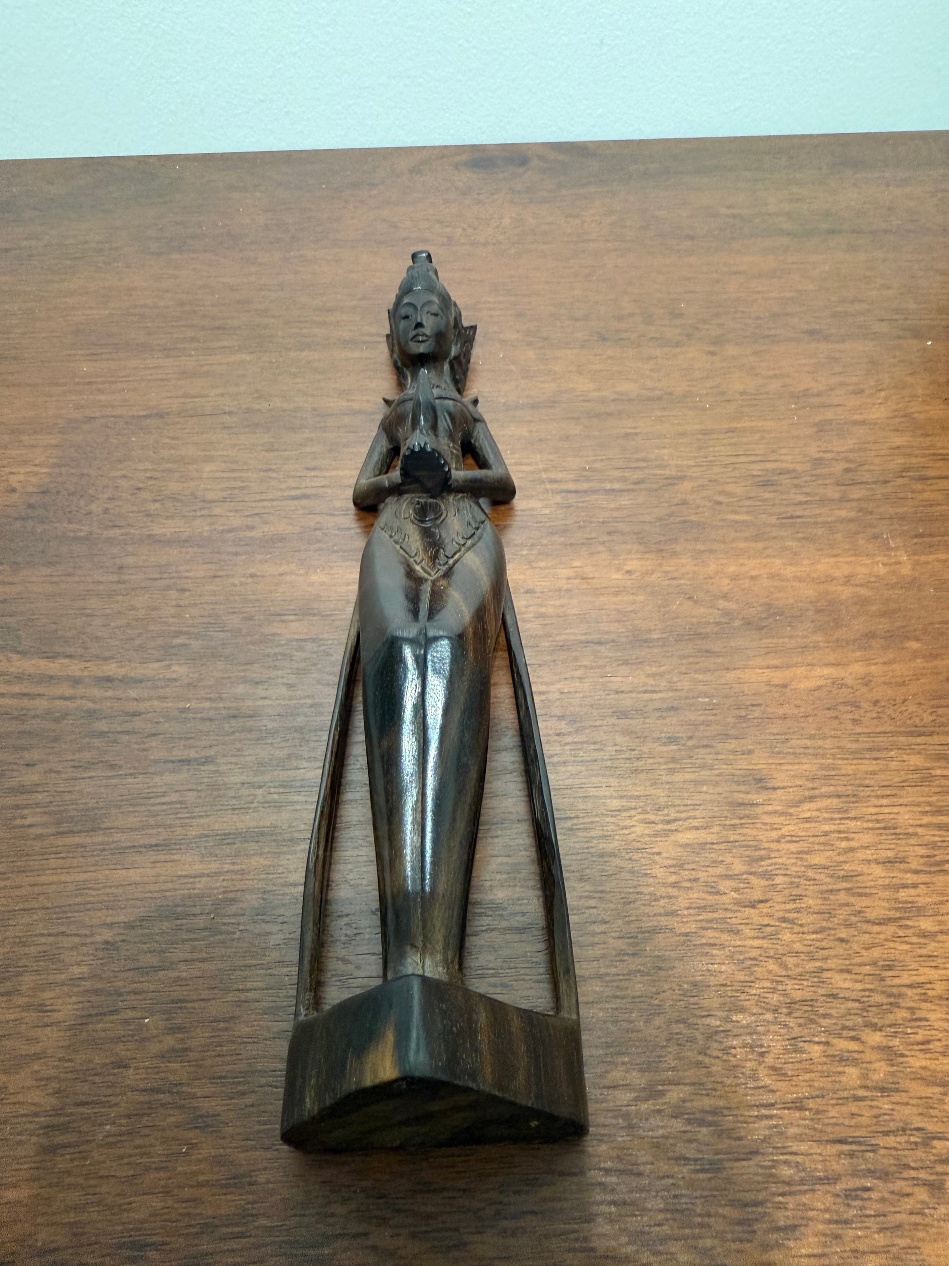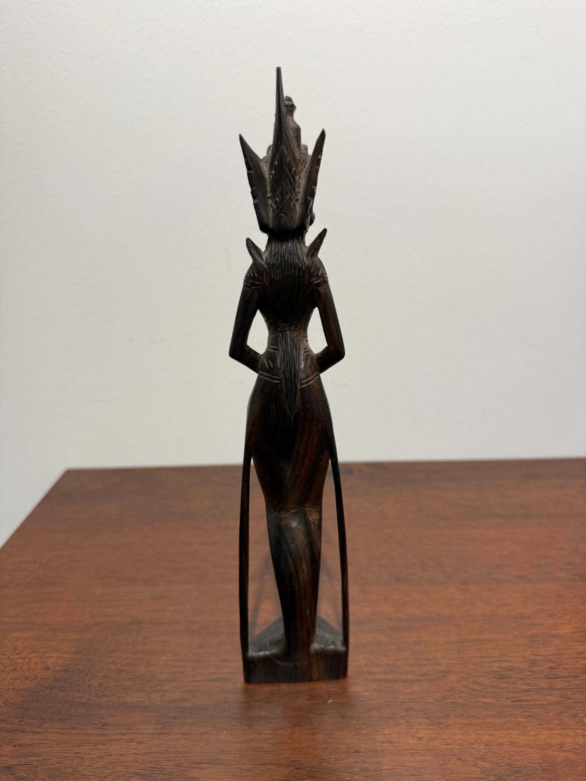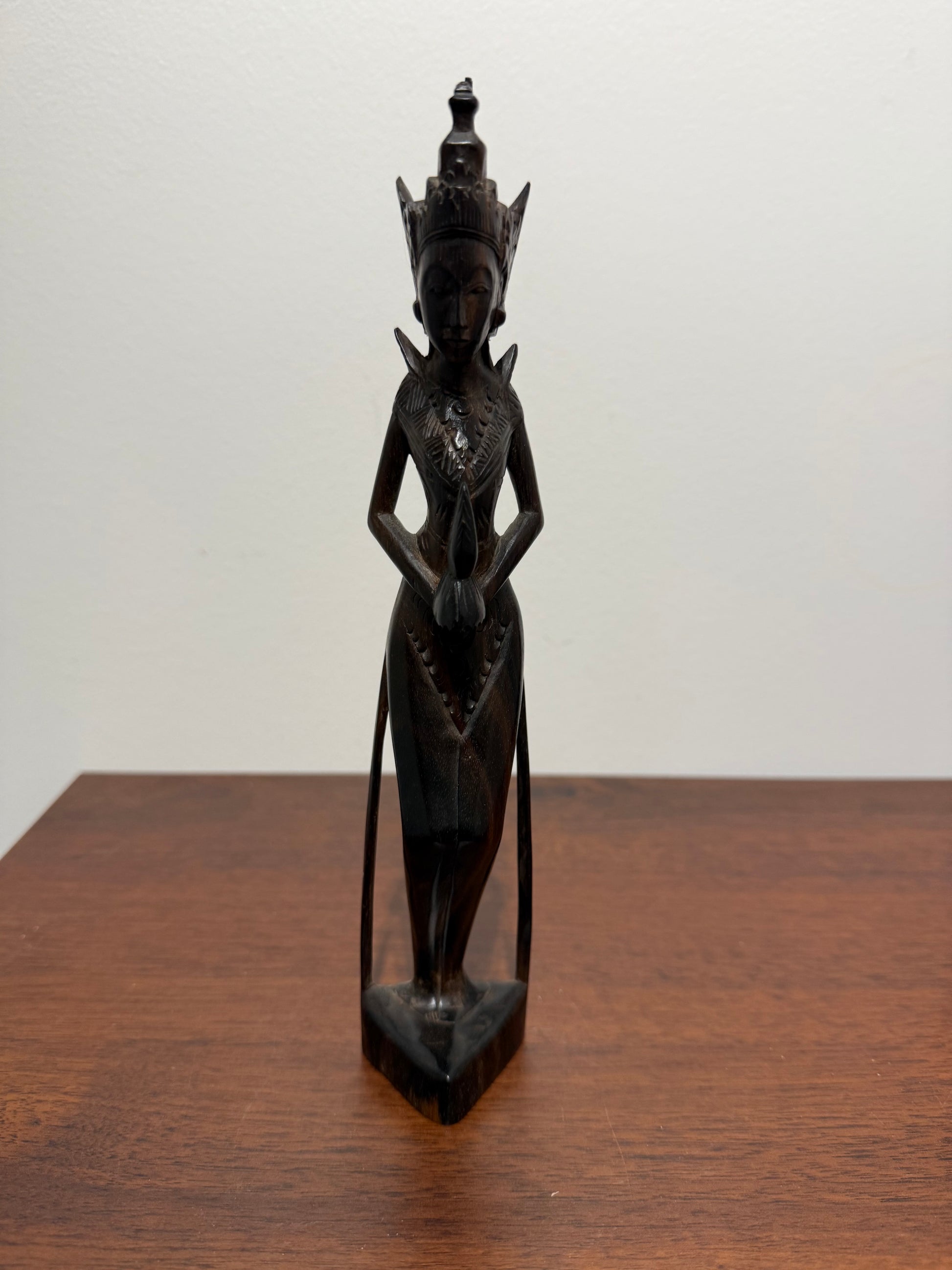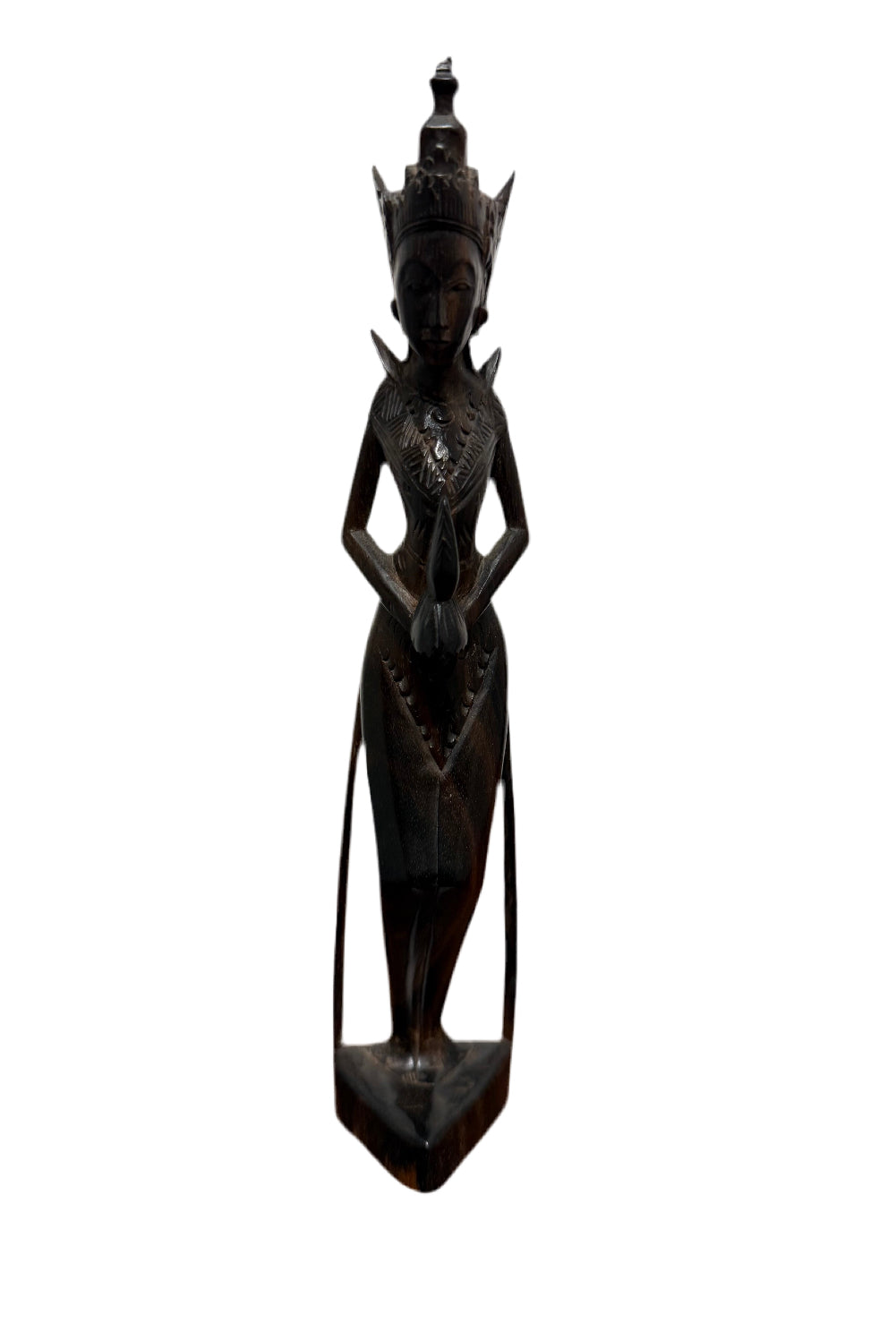 Superbe sculpture traditionnelle balinaise représentant une femme élégante en position debout, mains jointes dans une posture de salutation ou de prière. Elle est habillée d’une robe traditionnelle richement détaillée et coiffée d’une haute tiare stylisée. Les traits du visage sont finement travaillés, traduisant la finesse de l’art balinais.