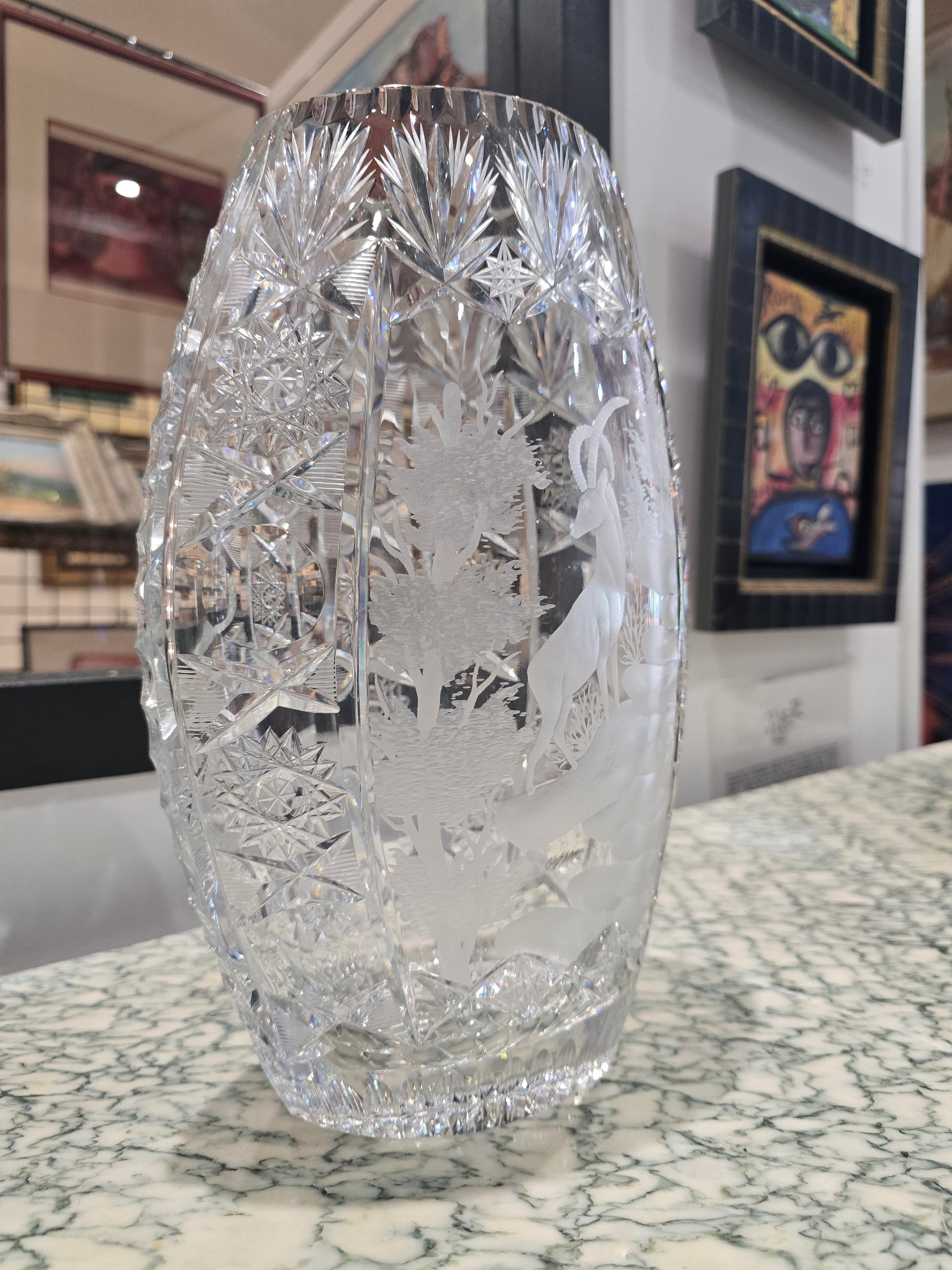 vase cristal gravé acide, déglaçage acide bouquetin, cristal Bohême, vase alpin, cristal taillé, objet verrier vintage, vase montagne, décoration chalet, vase collection XXe siècle