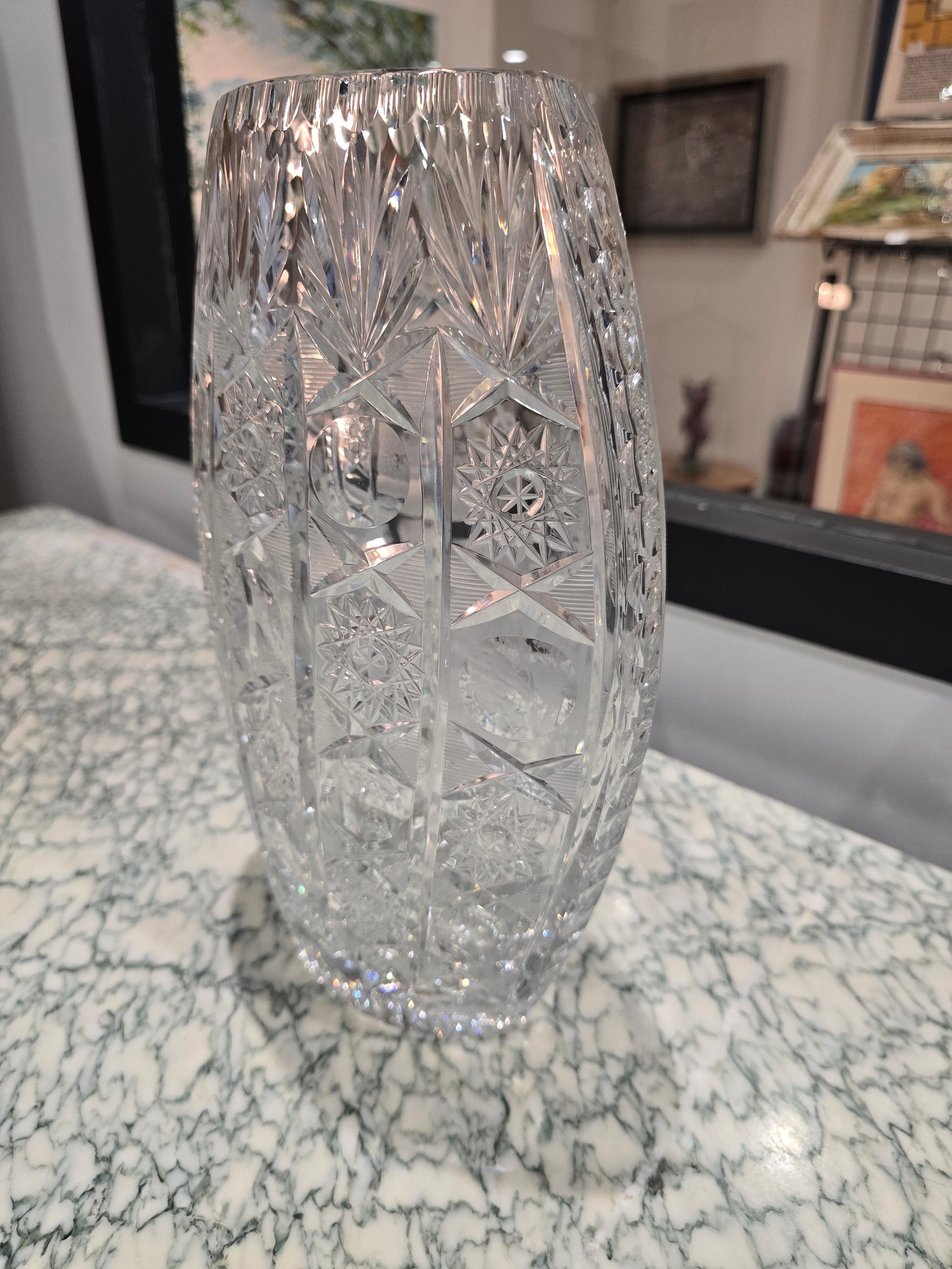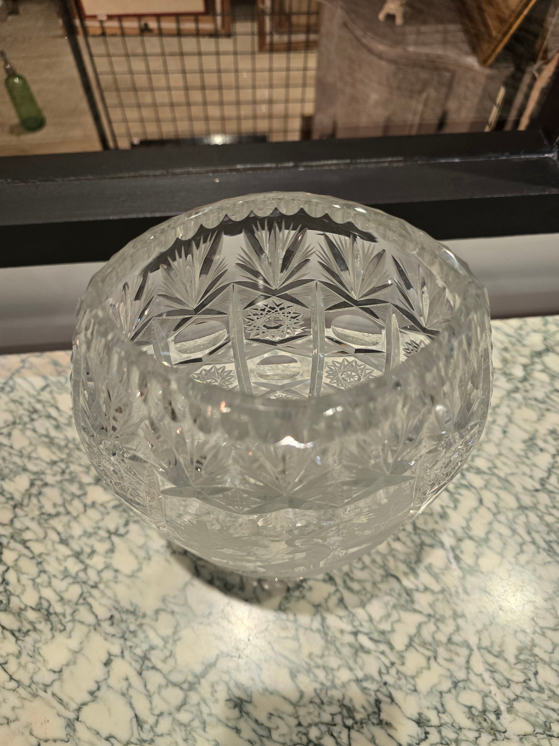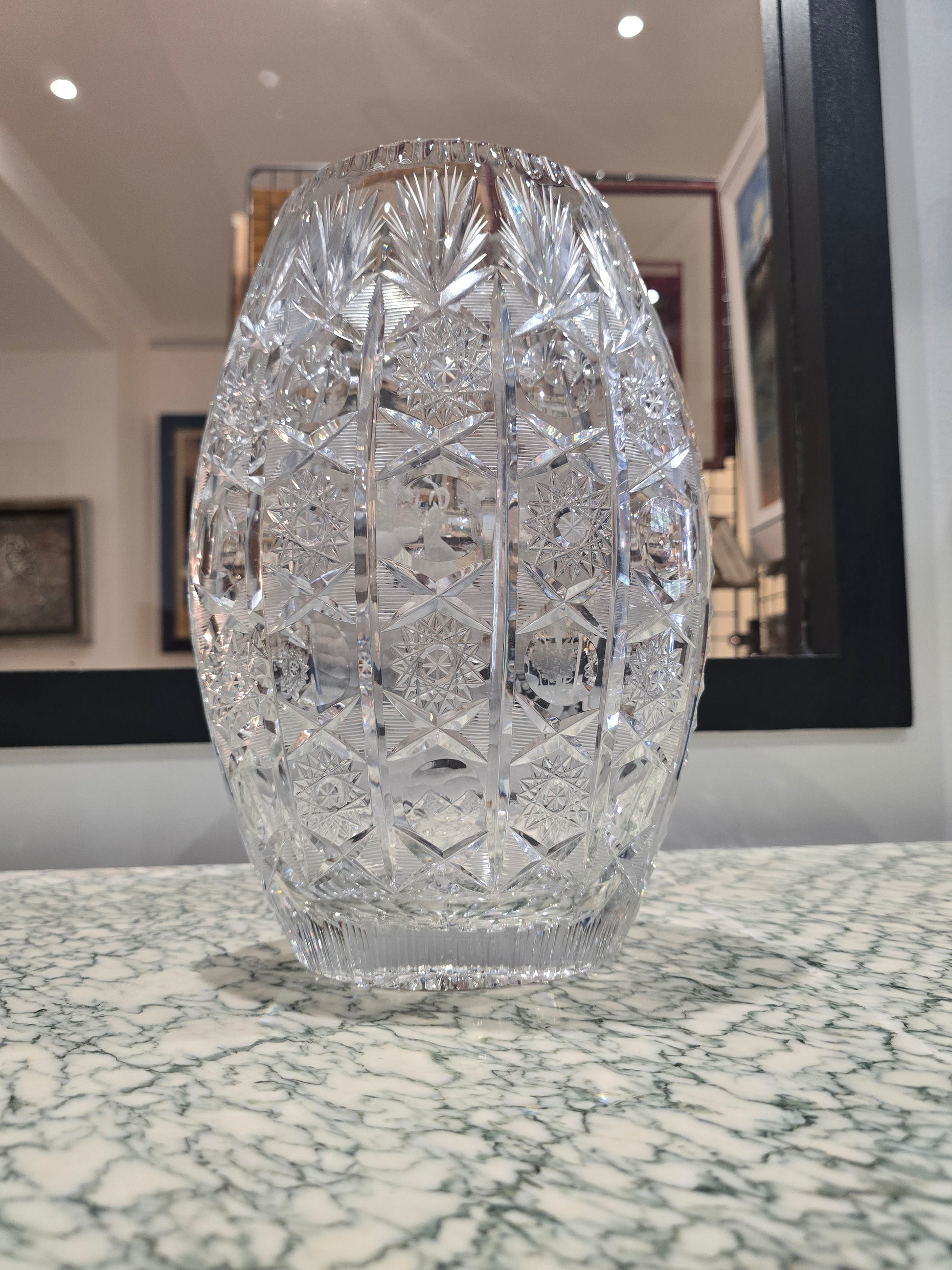 Le corps du vase est richement décoré de tailles géométriques nettes et profondes, typiques des productions de cristalleries d’Europe centrale. Un véritable objet d'art verrier, idéal en centre de table ou pour sublimer une vitrine.