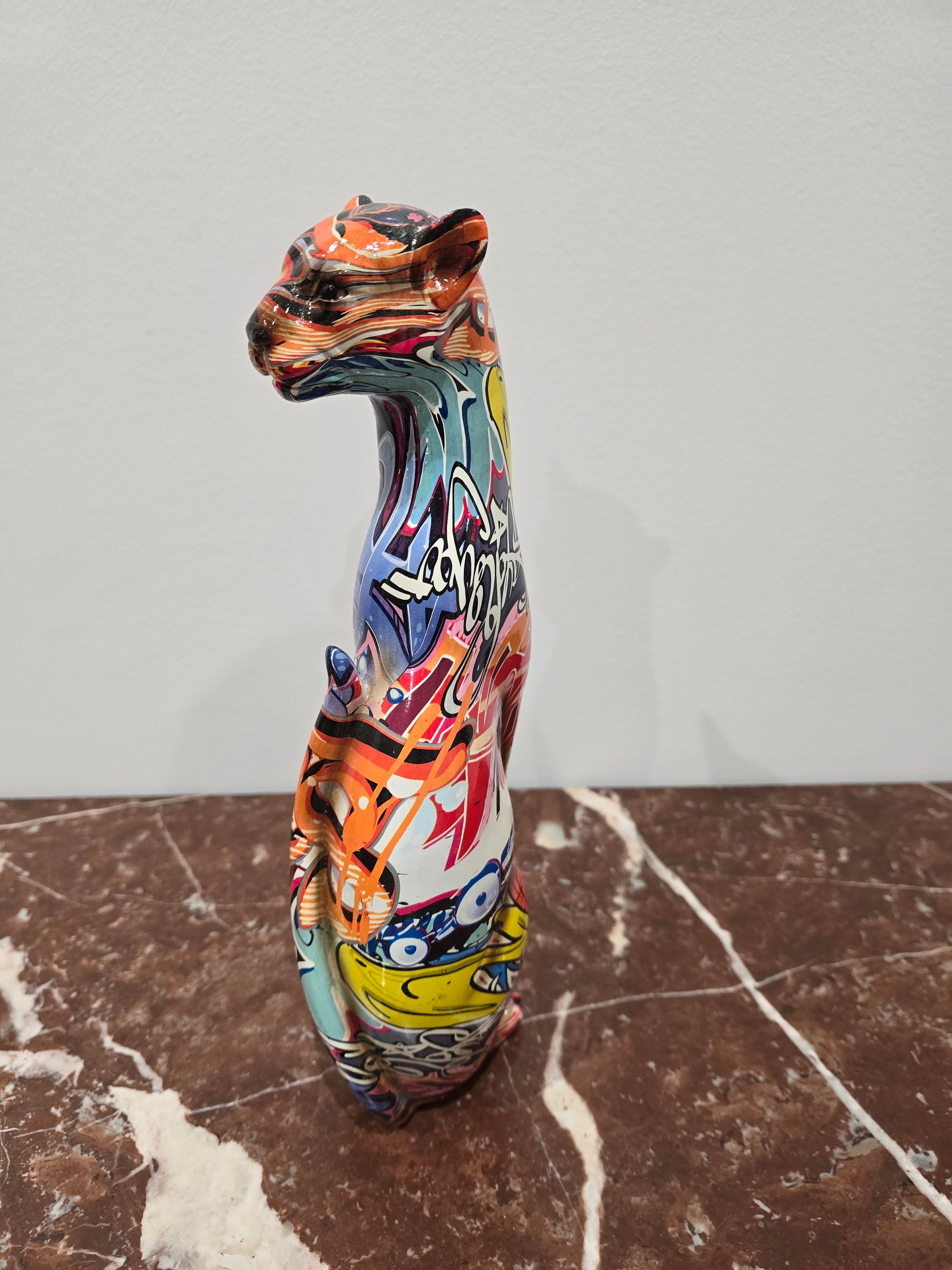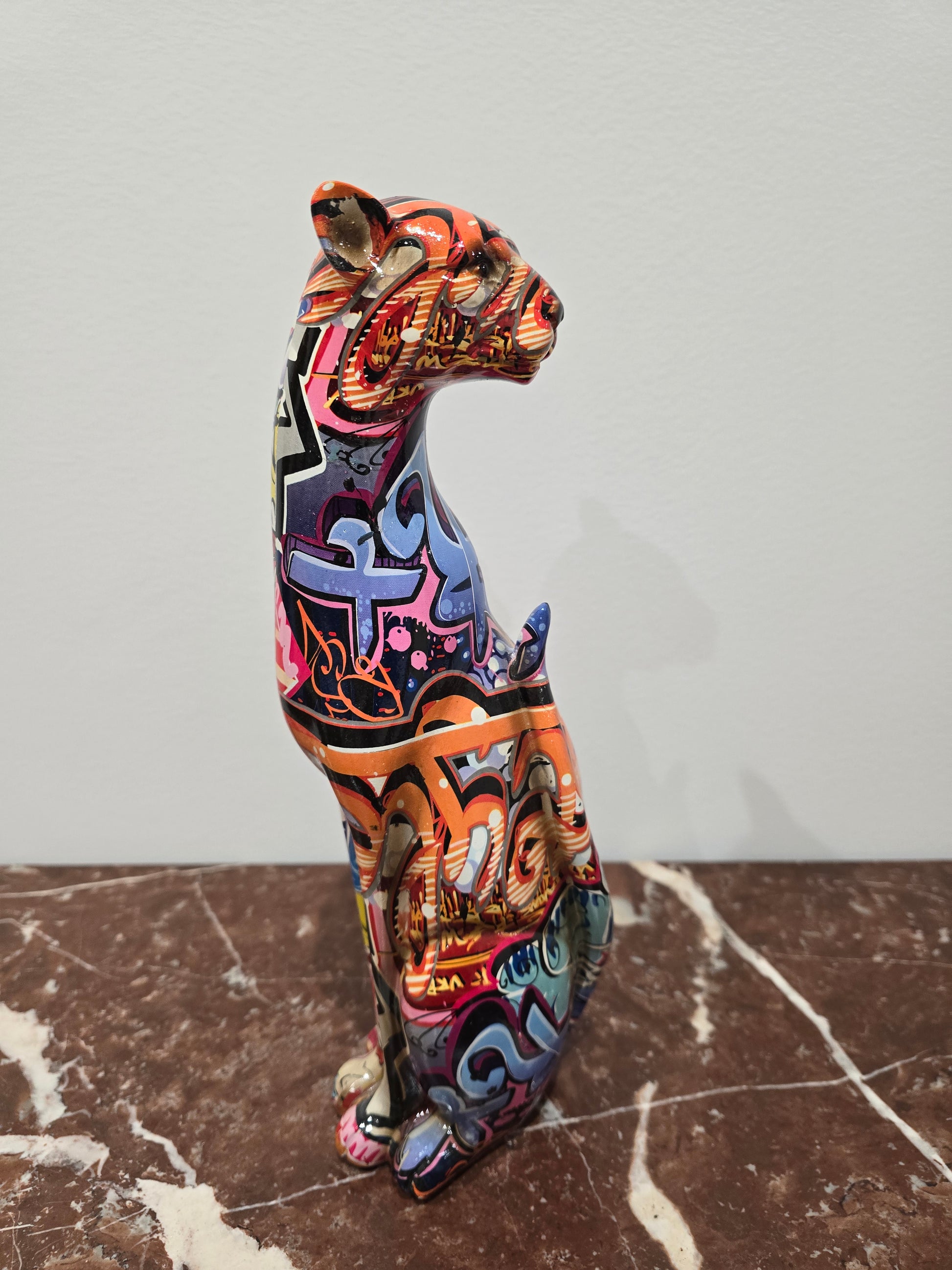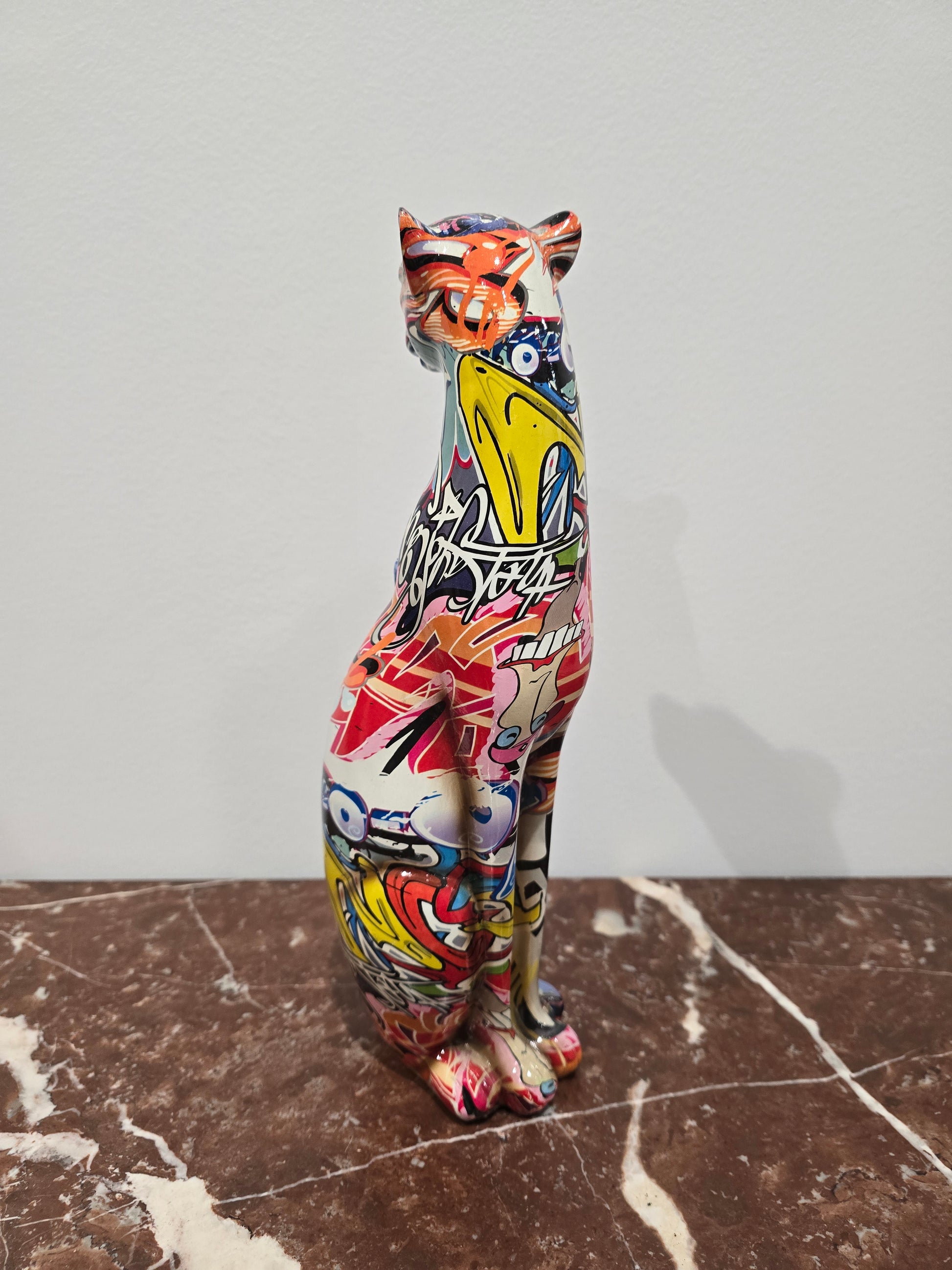 Plongez dans le monde passionnant du street art avec cette figurine artistique en résine. Le design graffiti multicolore donne au guépard une touche moderne et rebelle. Avec une taille de 8x11x34 cm, cette figurine attire tous les regards et est parfaite comme décoration pour votre maison ou votre bureau. La forme détaillée et les couleurs vives font de cette œuvre d'art un cadeau unique pour tous les amateurs d'art et d'animaux. Apportez une touche d'art urbain dans votre vie avec cette figurine street art