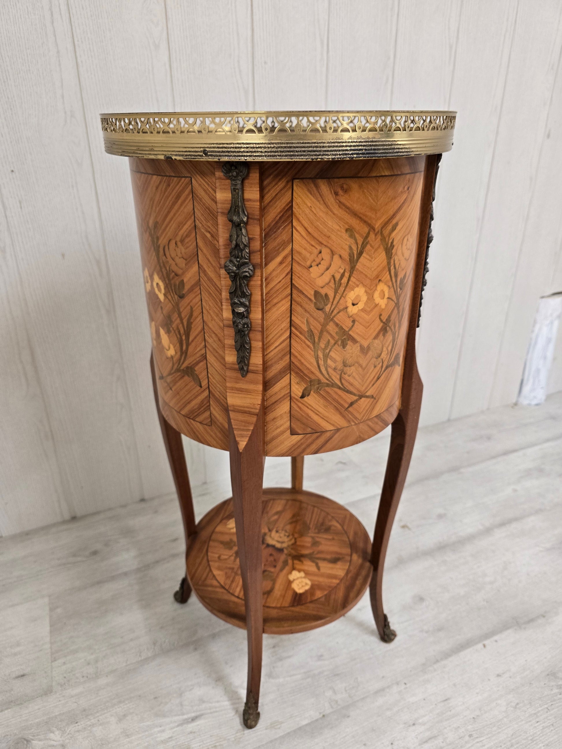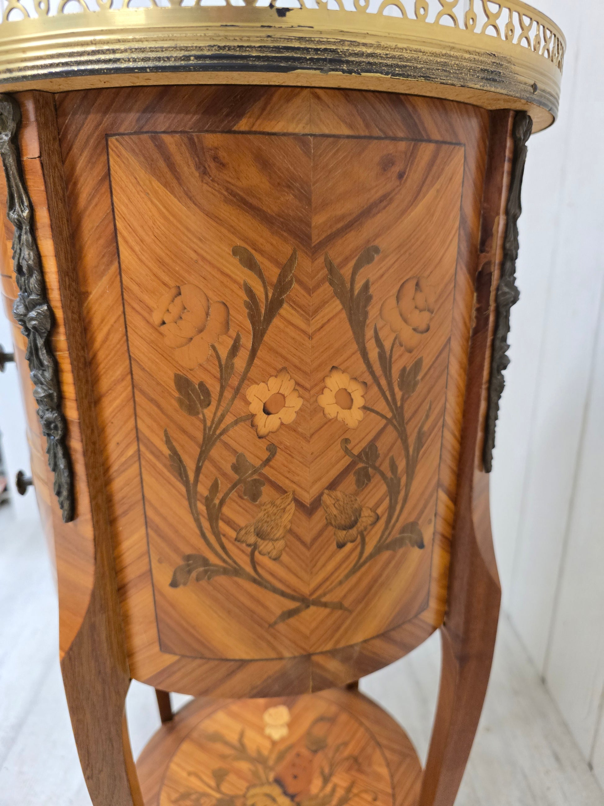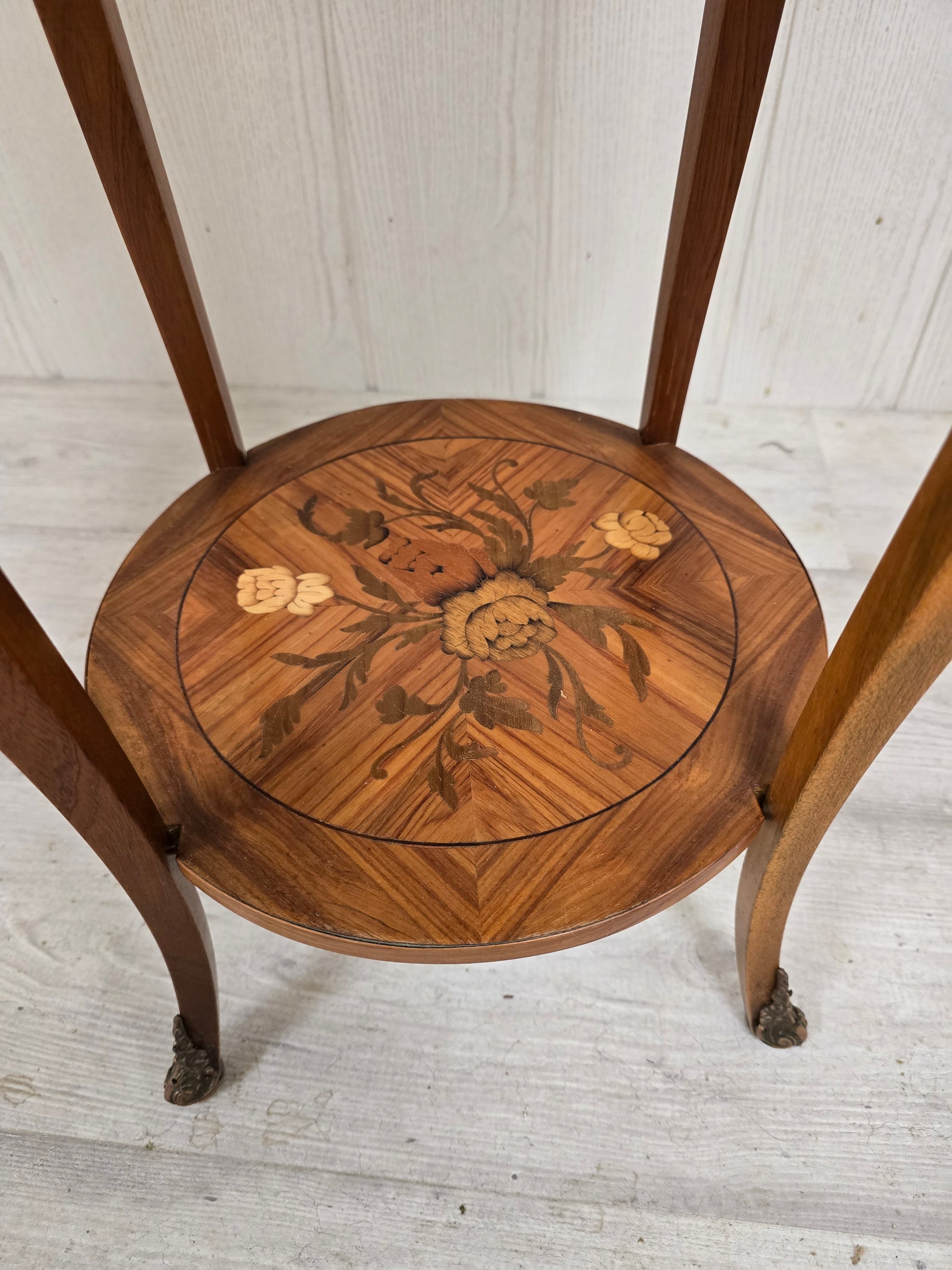 La tablette inférieure est elle aussi marquetée, un détail rare qui renforce le raffinement du meuble.