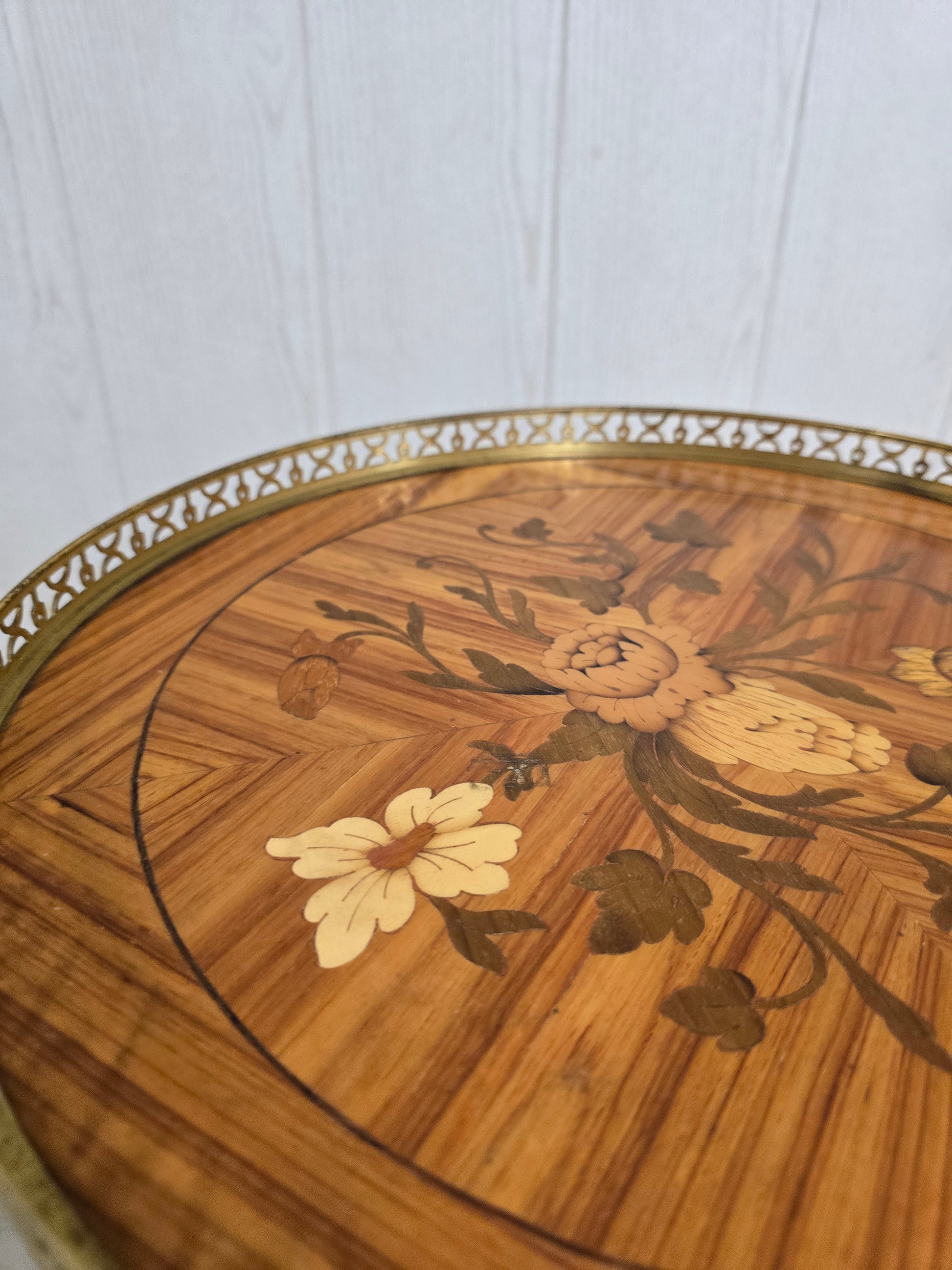 Décor : Marqueterie florale sur le plateau et tablette basse