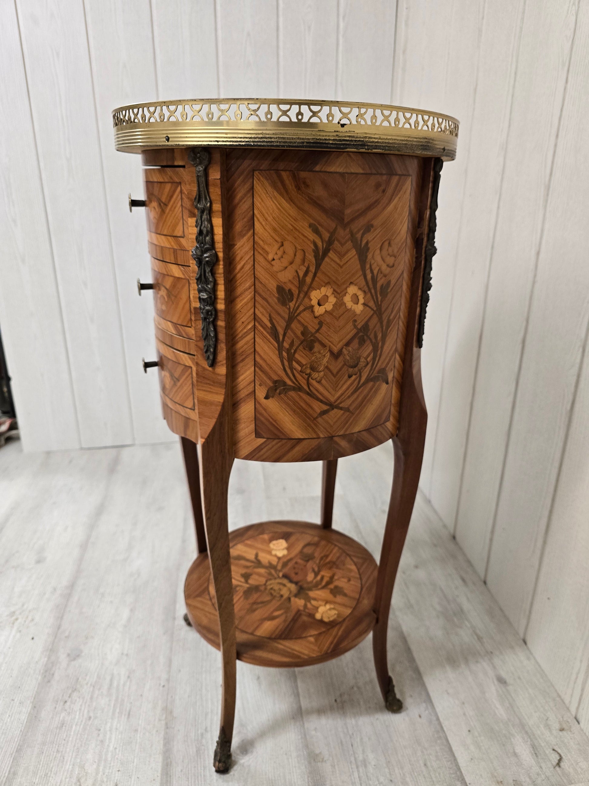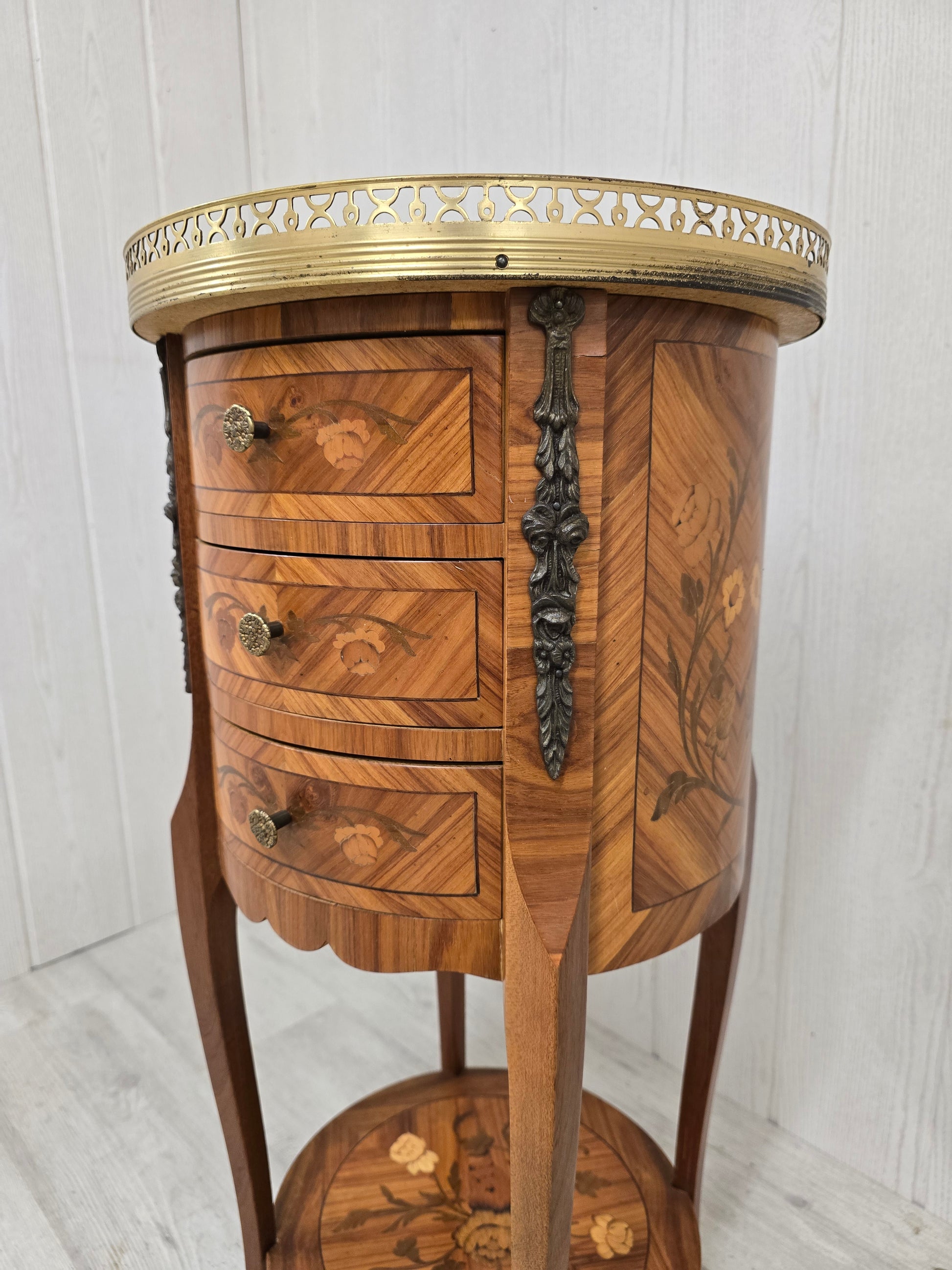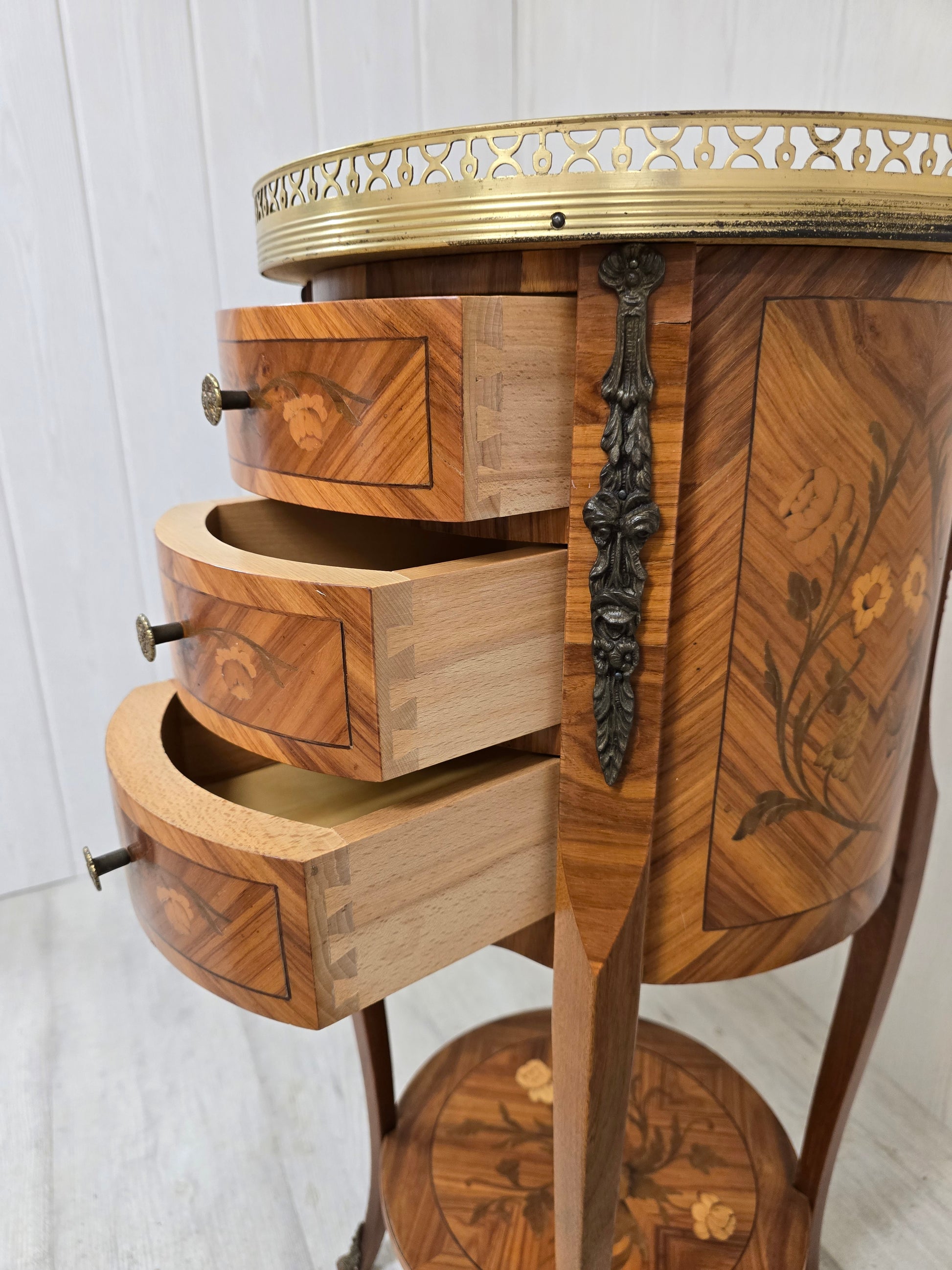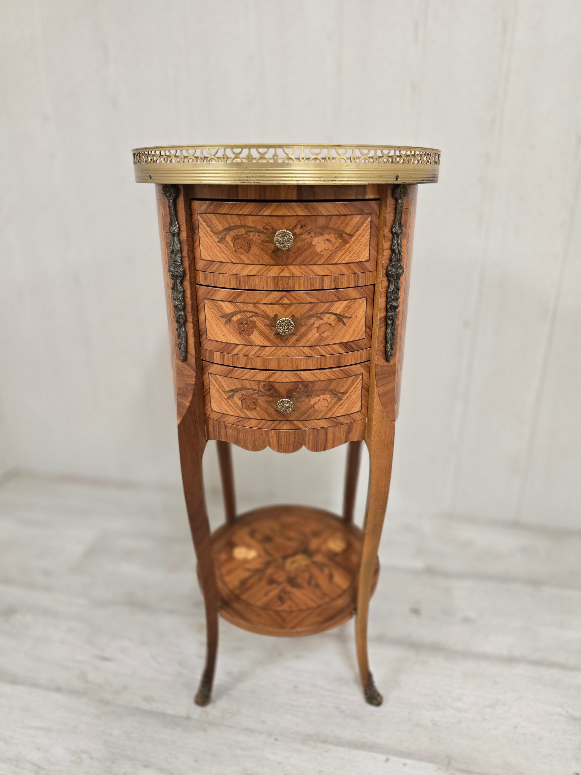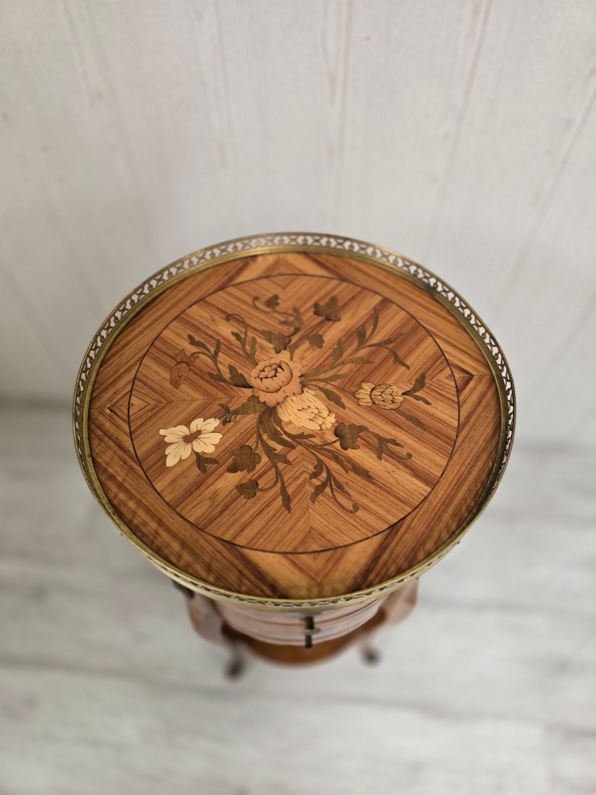 Guéridon marqueté à trois tiroirs – Style Louis XV – Bronze & plateau ajouré
