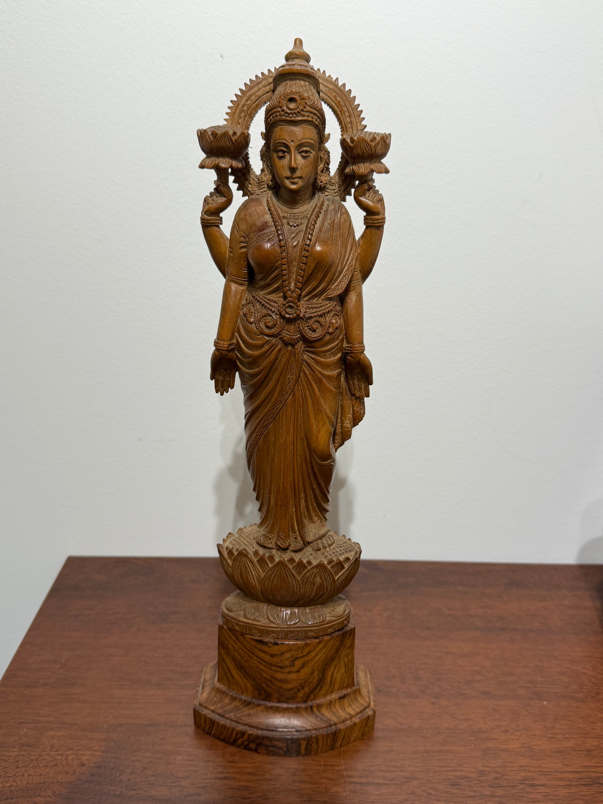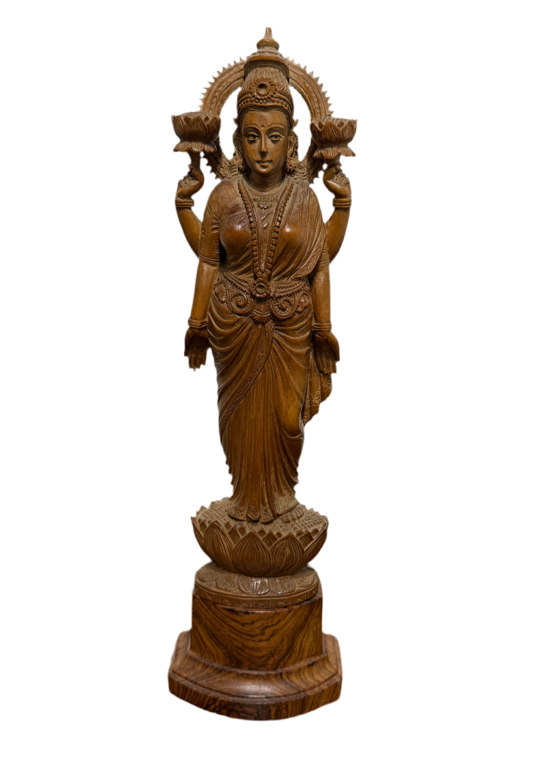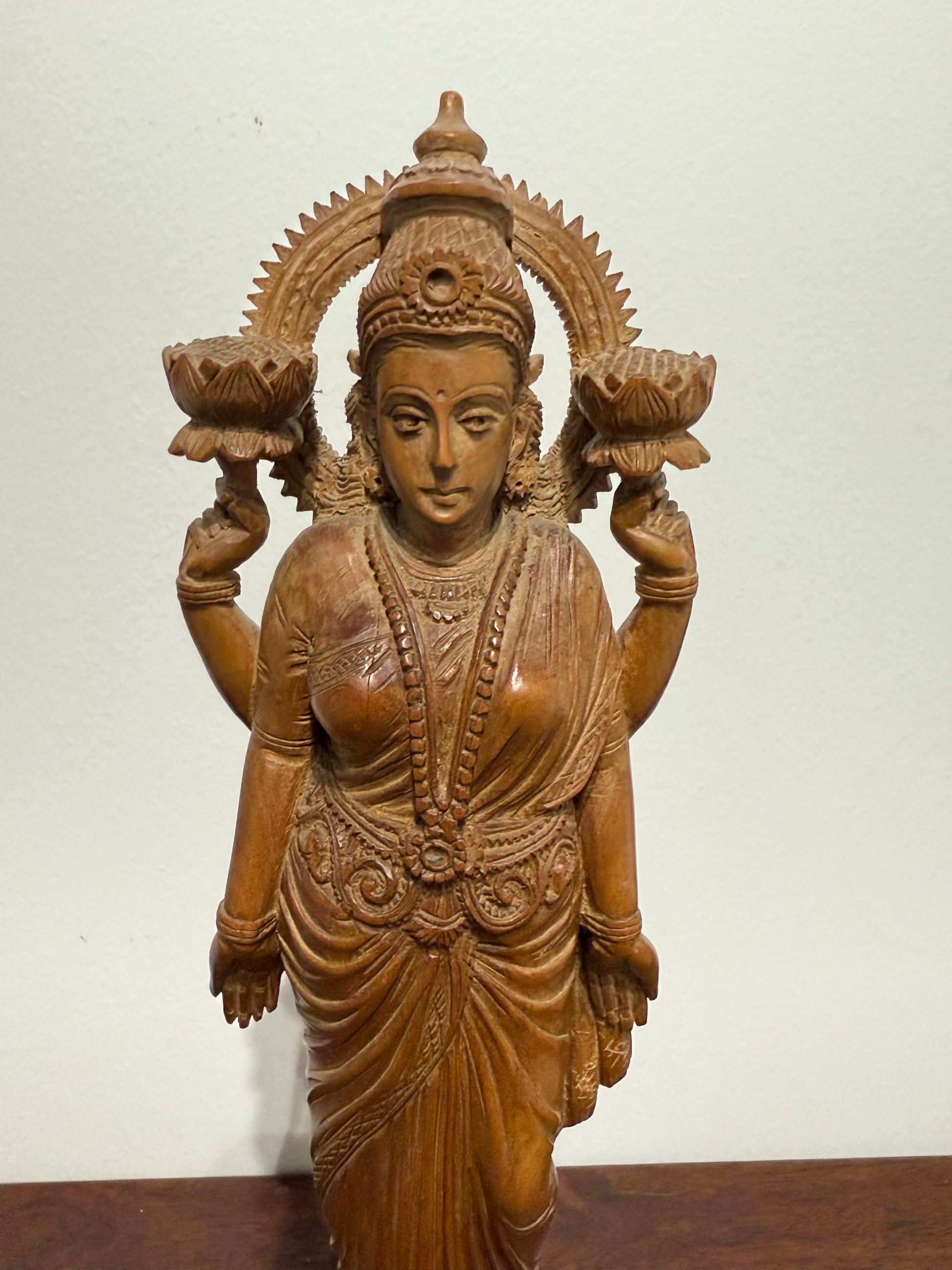 Superbe sculpture traditionnelle représentant la déesse hindoue Lakshmi, divinité de la fortune, de la prospérité et de la beauté. La divinité est représentée debout, majestueuse, tenant des lotus dans deux de ses quatre mains. Les détails minutieux des habits, des bijoux et de la coiffe sont finement sculptés, témoignant d’un savoir-faire artisanal remarquable.