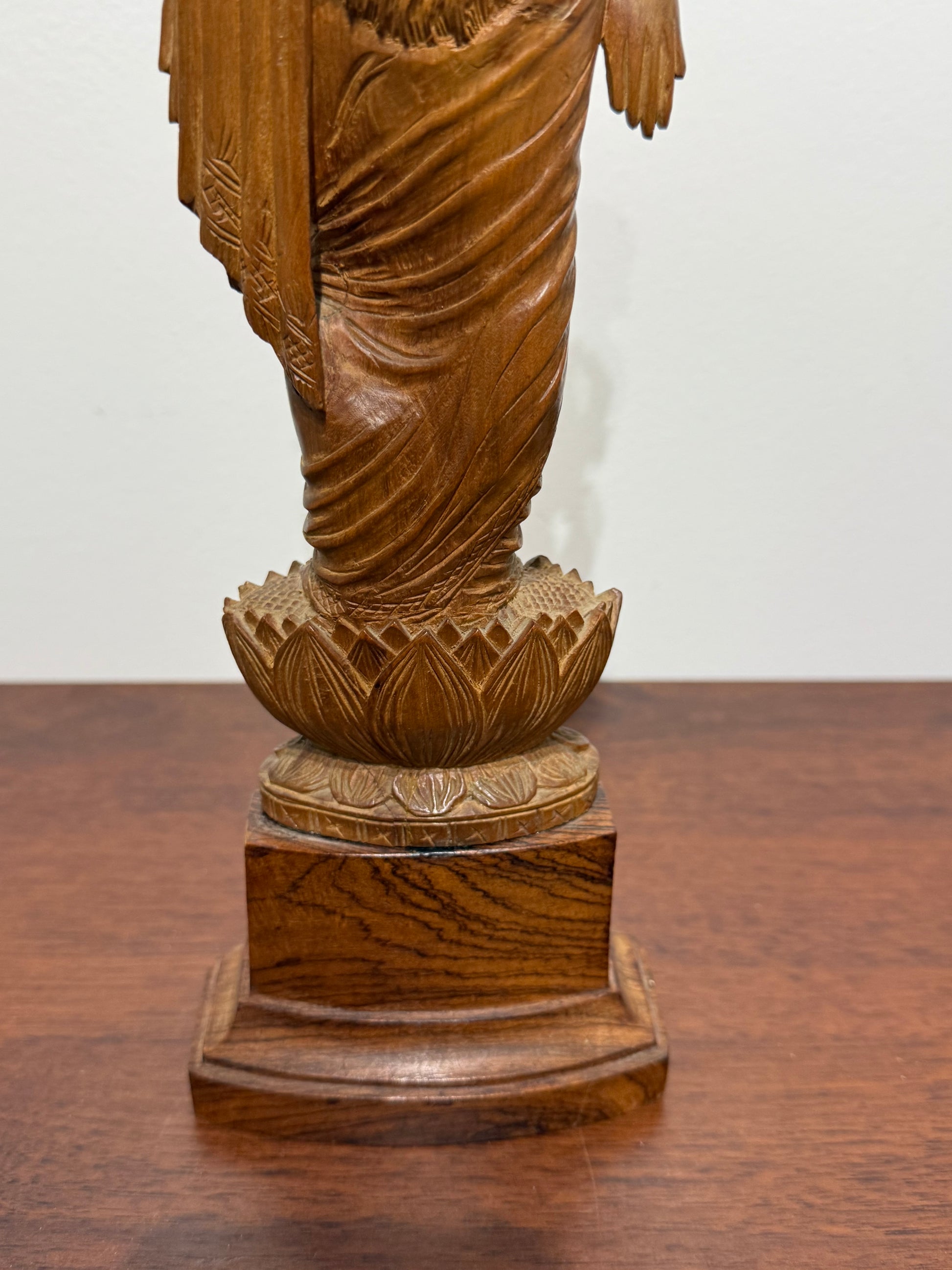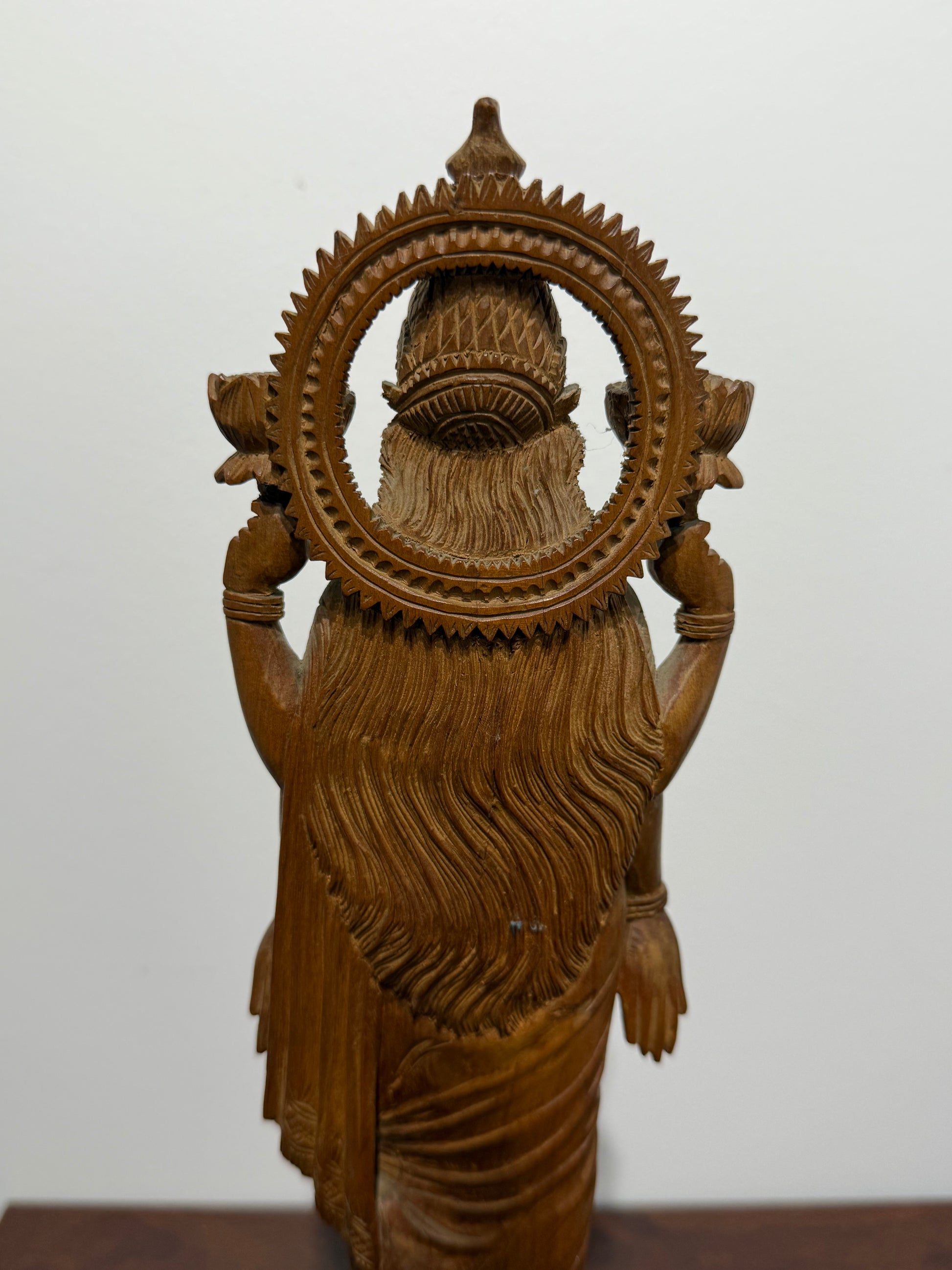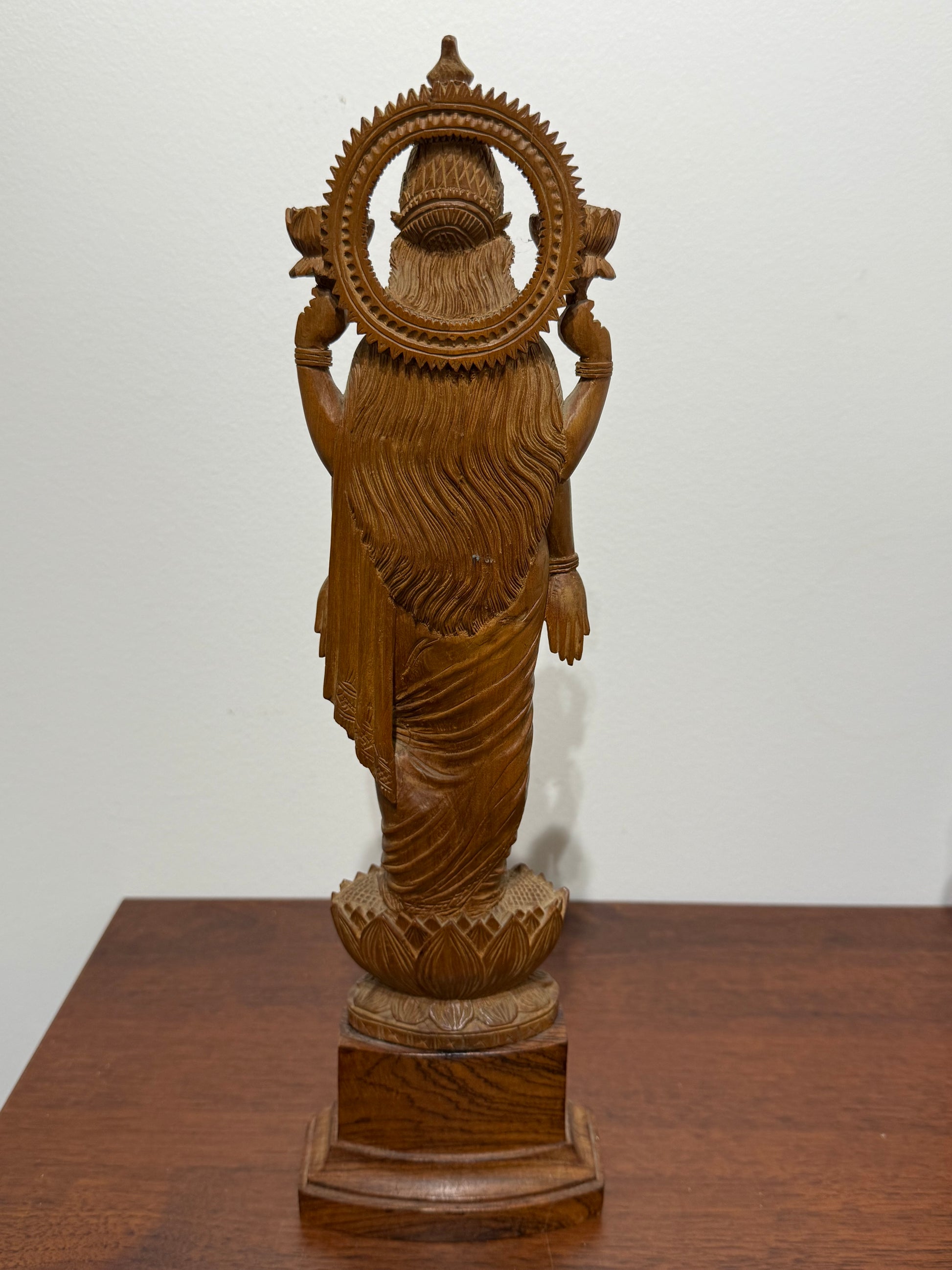 Superbe sculpture traditionnelle représentant la déesse hindoue Lakshmi, divinité de la fortune, de la prospérité et de la beauté. La divinité est représentée debout, majestueuse, tenant des lotus dans deux de ses quatre mains. Les détails minutieux des habits, des bijoux et de la coiffe sont finement sculptés, témoignant d’un savoir-faire artisanal remarquable.