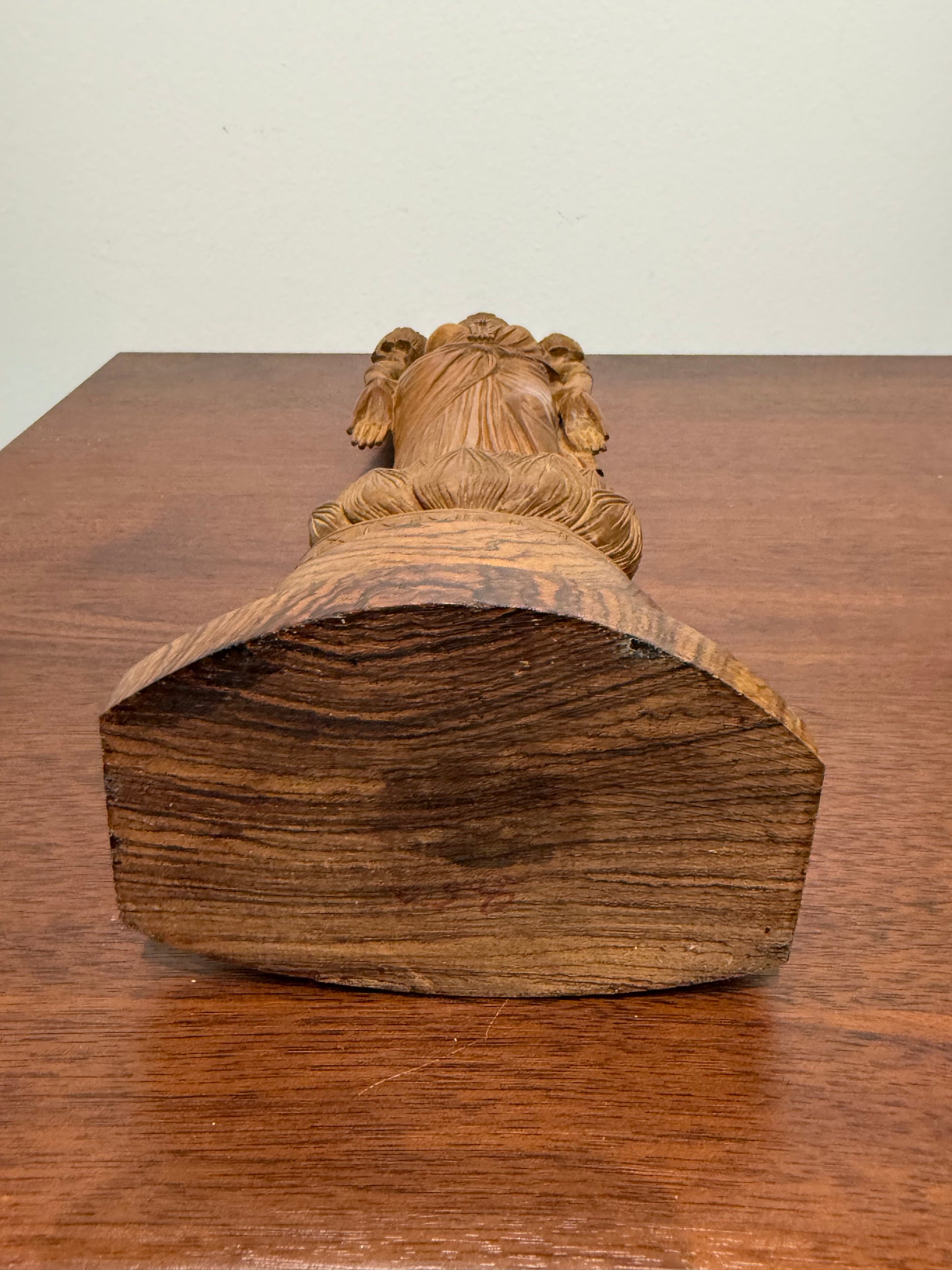 - Bois sculpté à la main (essence probablement bois de rose ou bois tropical dur)
