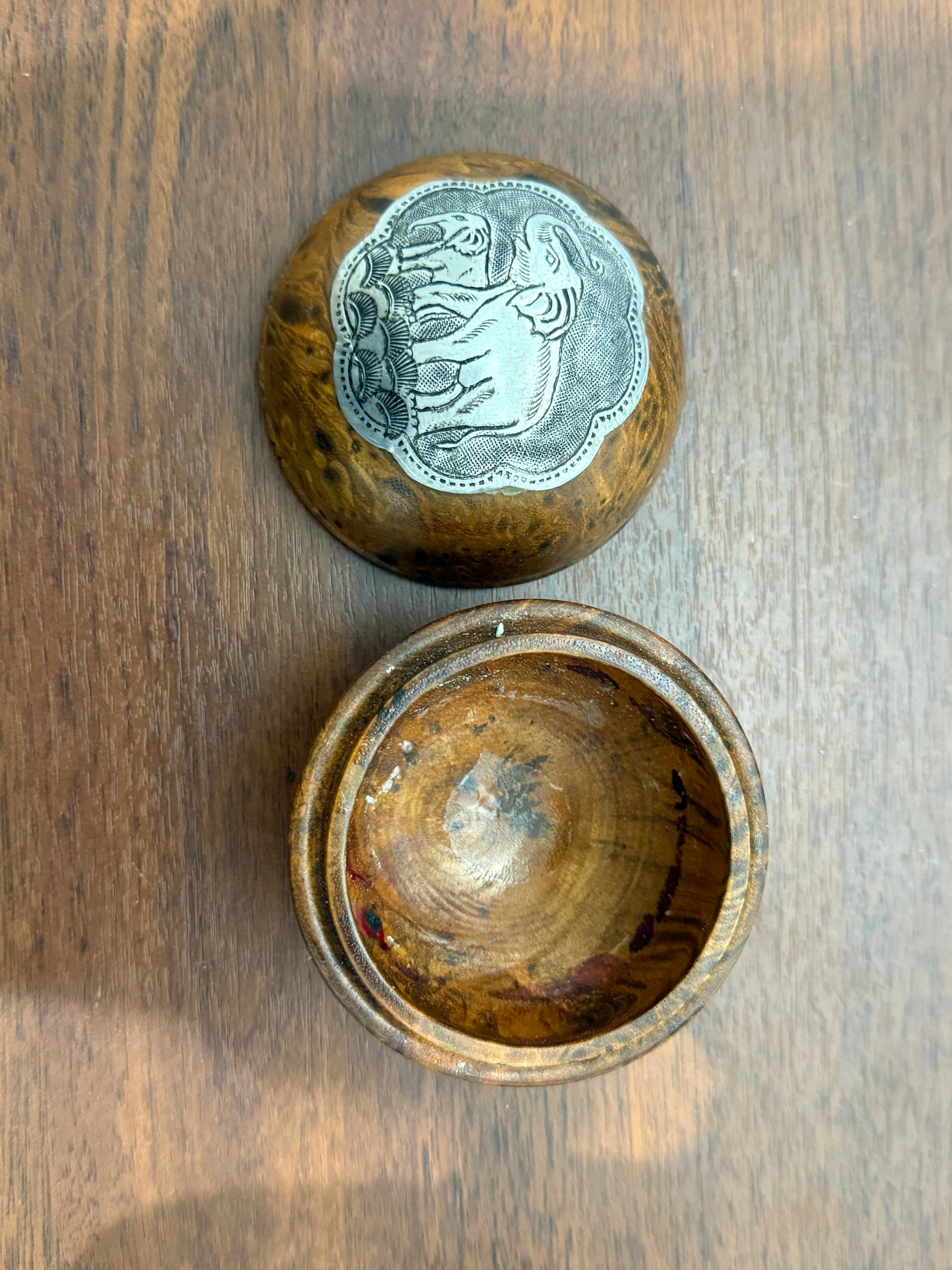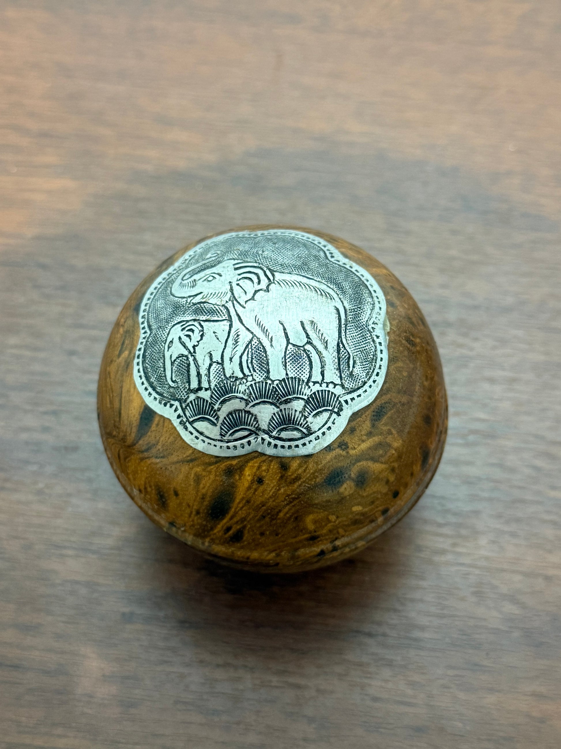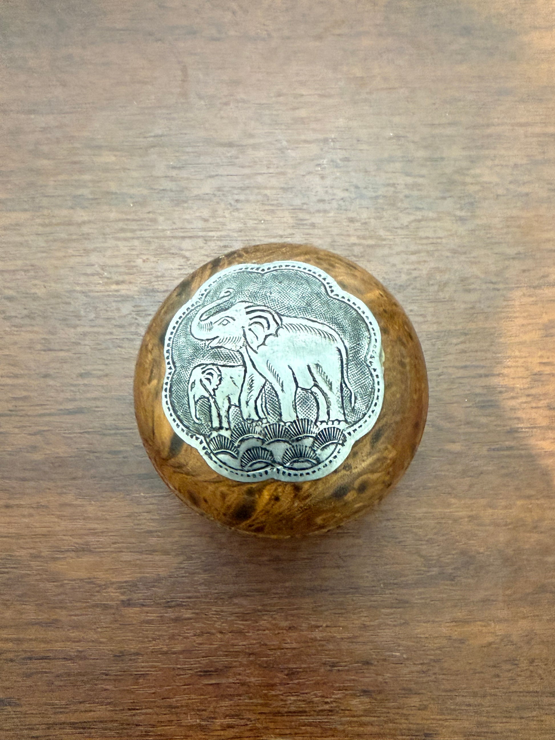 Charmante petite boîte ronde artisanale, réalisée en bois naturel, au veinage riche et unique. Le couvercle est finement orné d’un médaillon en métal ciselé représentant deux éléphants en pleine marche, symbole de sagesse et de prospérité dans la culture asiatique.