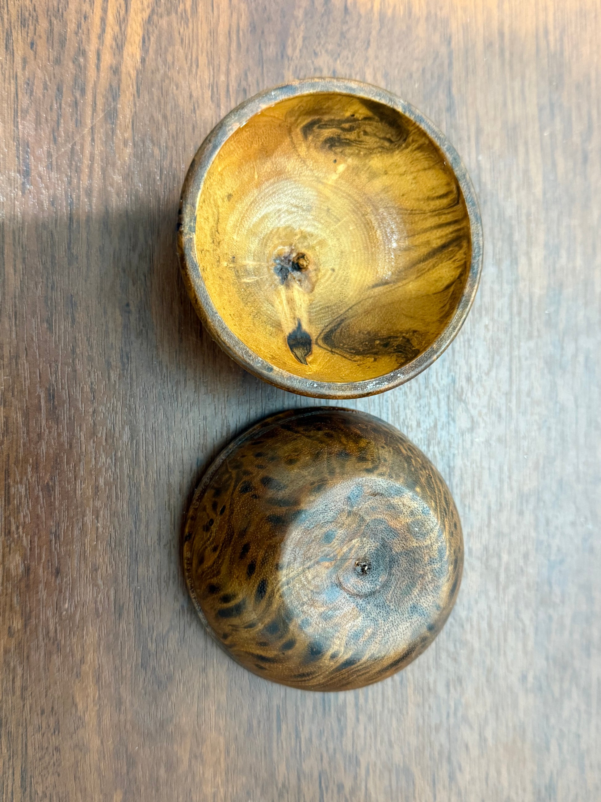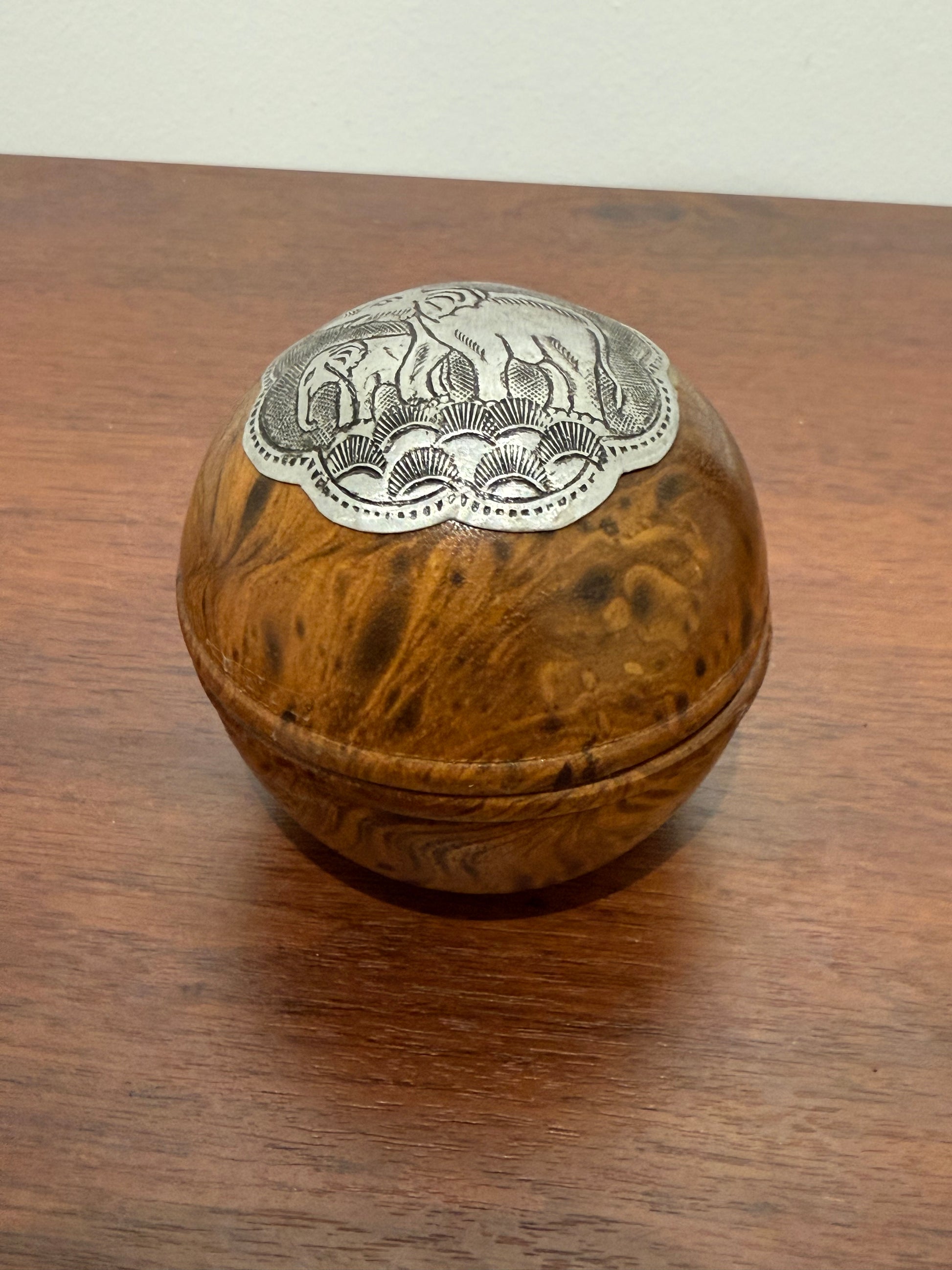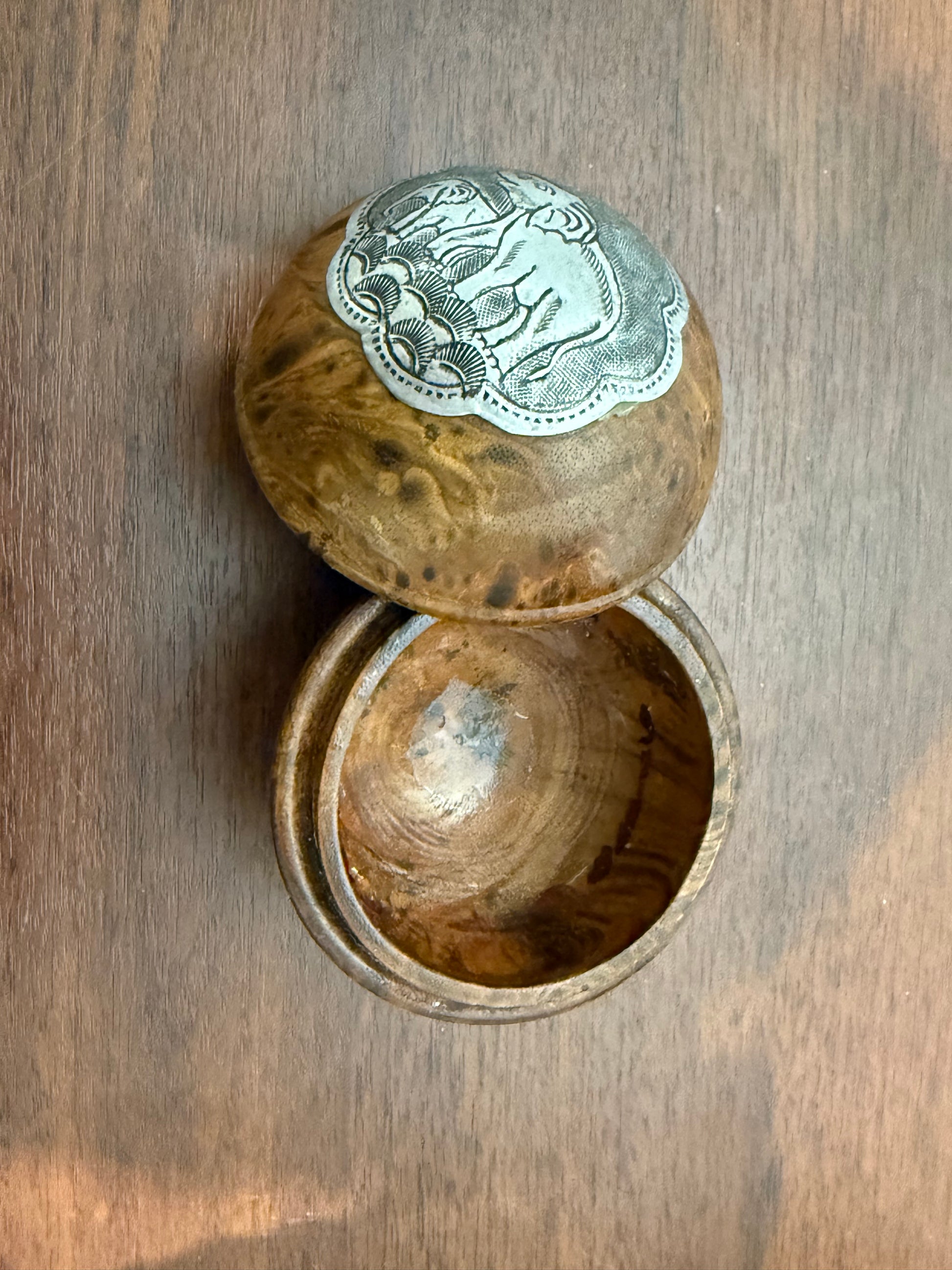 Charmante petite boîte ronde artisanale, réalisée en bois naturel, au veinage riche et unique. Le couvercle est finement orné d’un médaillon en métal ciselé représentant deux éléphants en pleine marche, symbole de sagesse et de prospérité dans la culture asiatique.