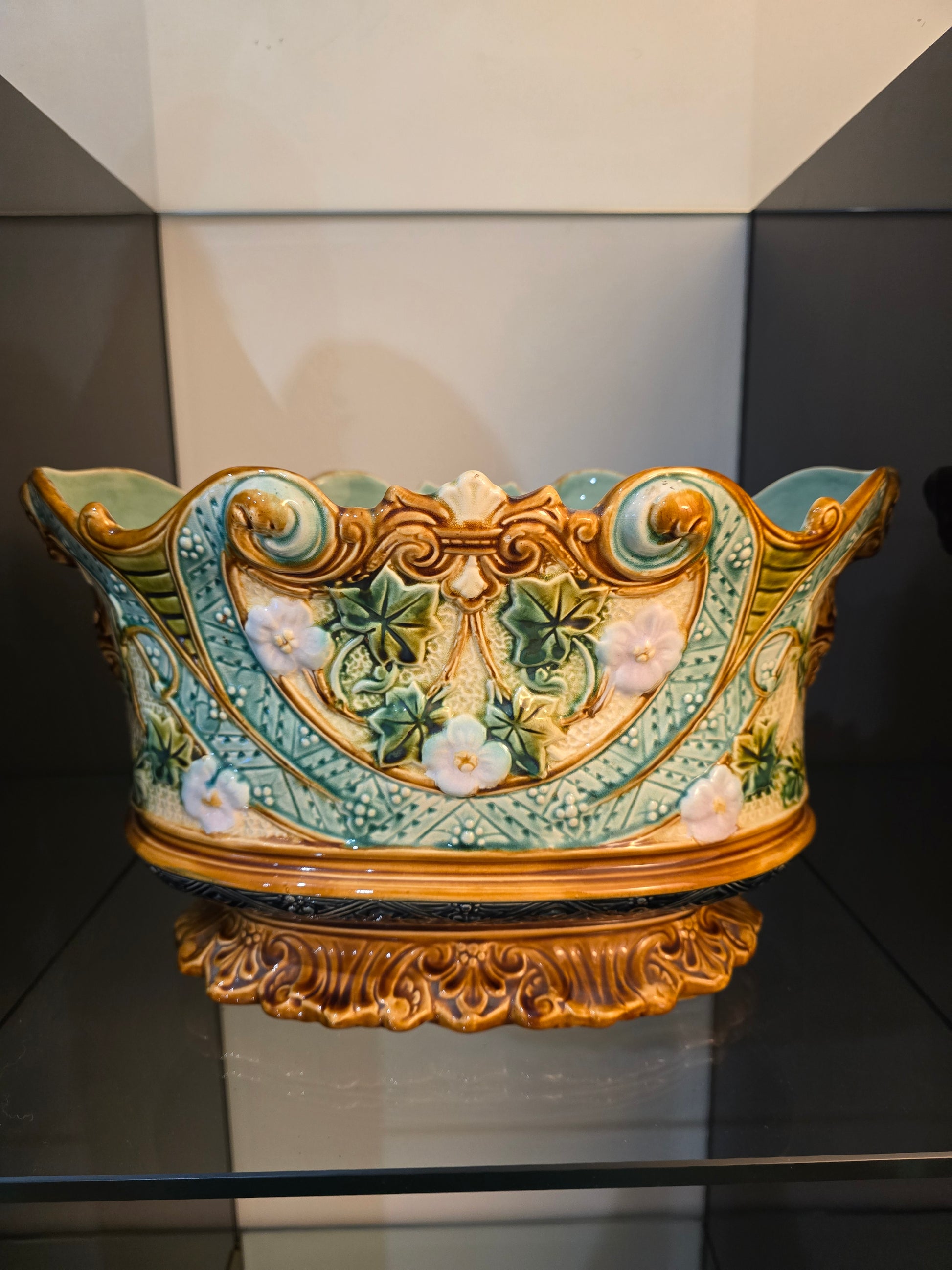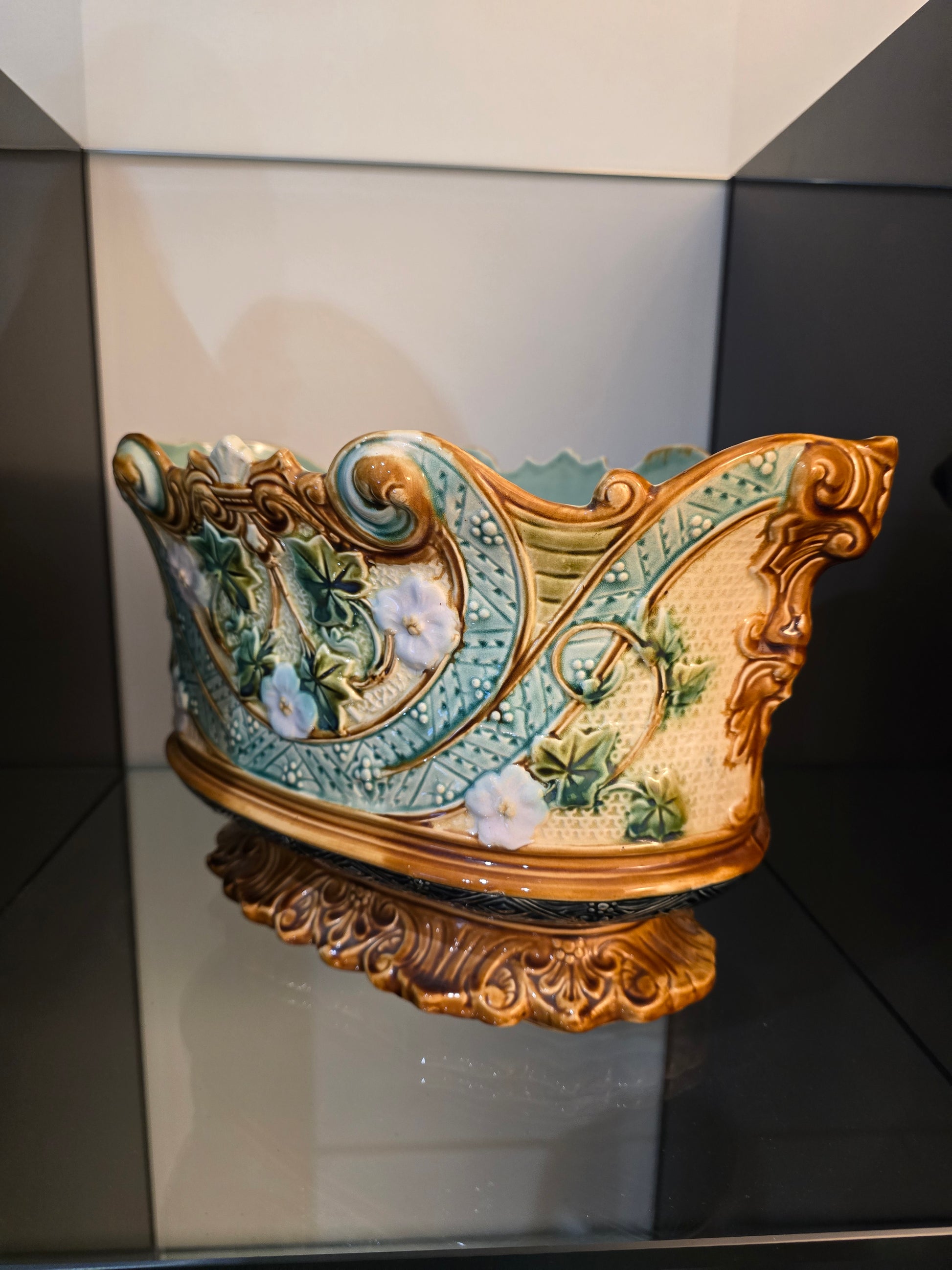 Superbe jardinière en barbotine de la période Art Nouveau, présentant un décor richement moulé de liserons en fleurs, feuillages stylisés et volutes architecturales.