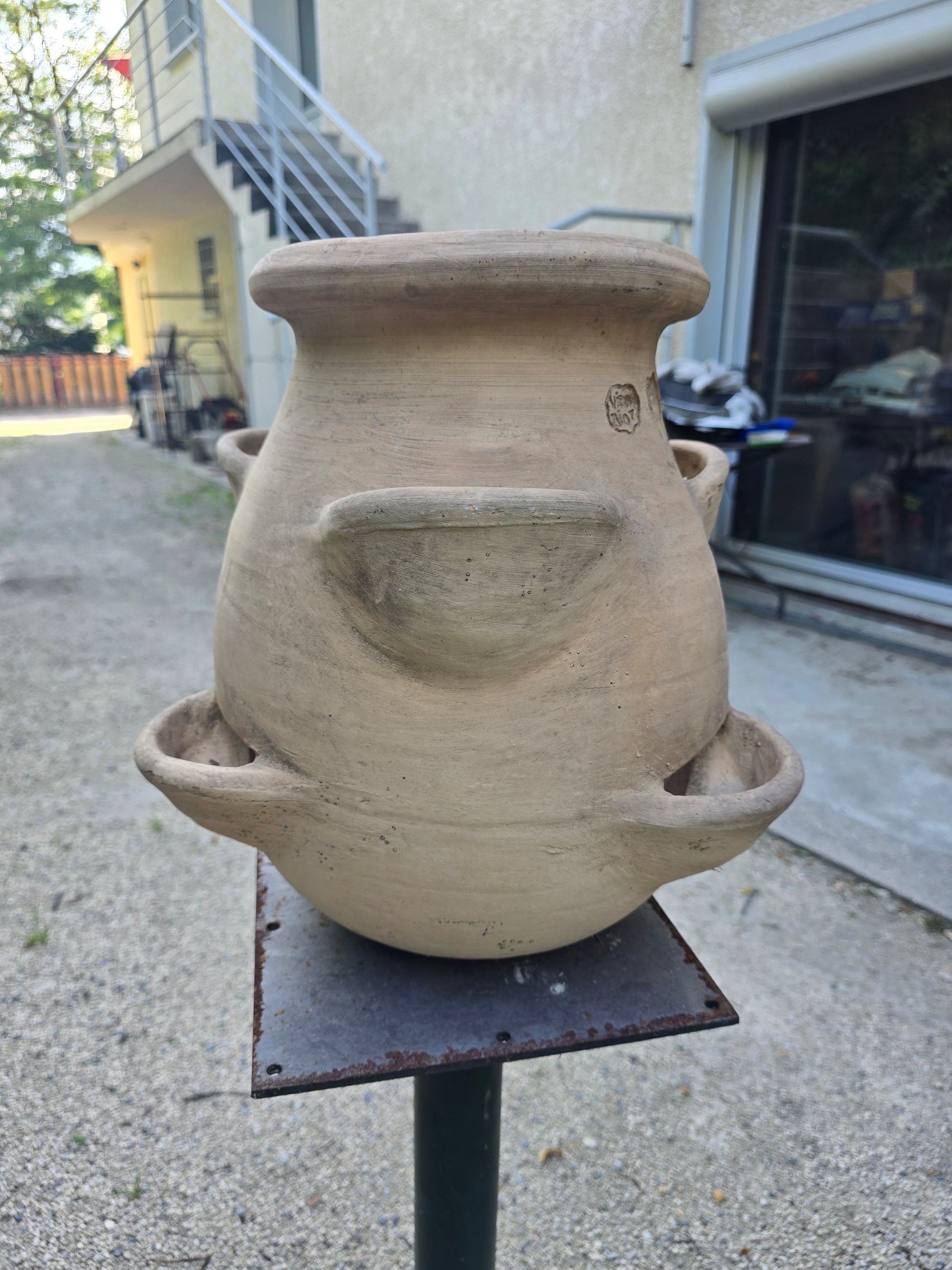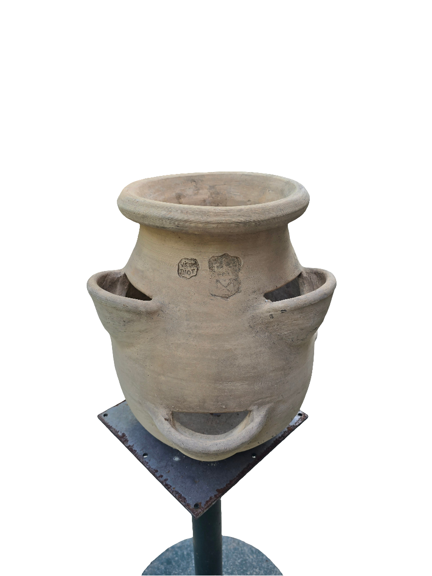 Authentique jarre à fraisiers en terre cuite brute, fabriquée artisanalement à la Manufacture de Biot, dans les Alpes-Maritimes. Ce modèle à six poches latérales est typique de la production provençale, pensé pour la culture de fraises, de plantes aromatiques ou comme pot décoratif pour le jardin ou une terrasse.