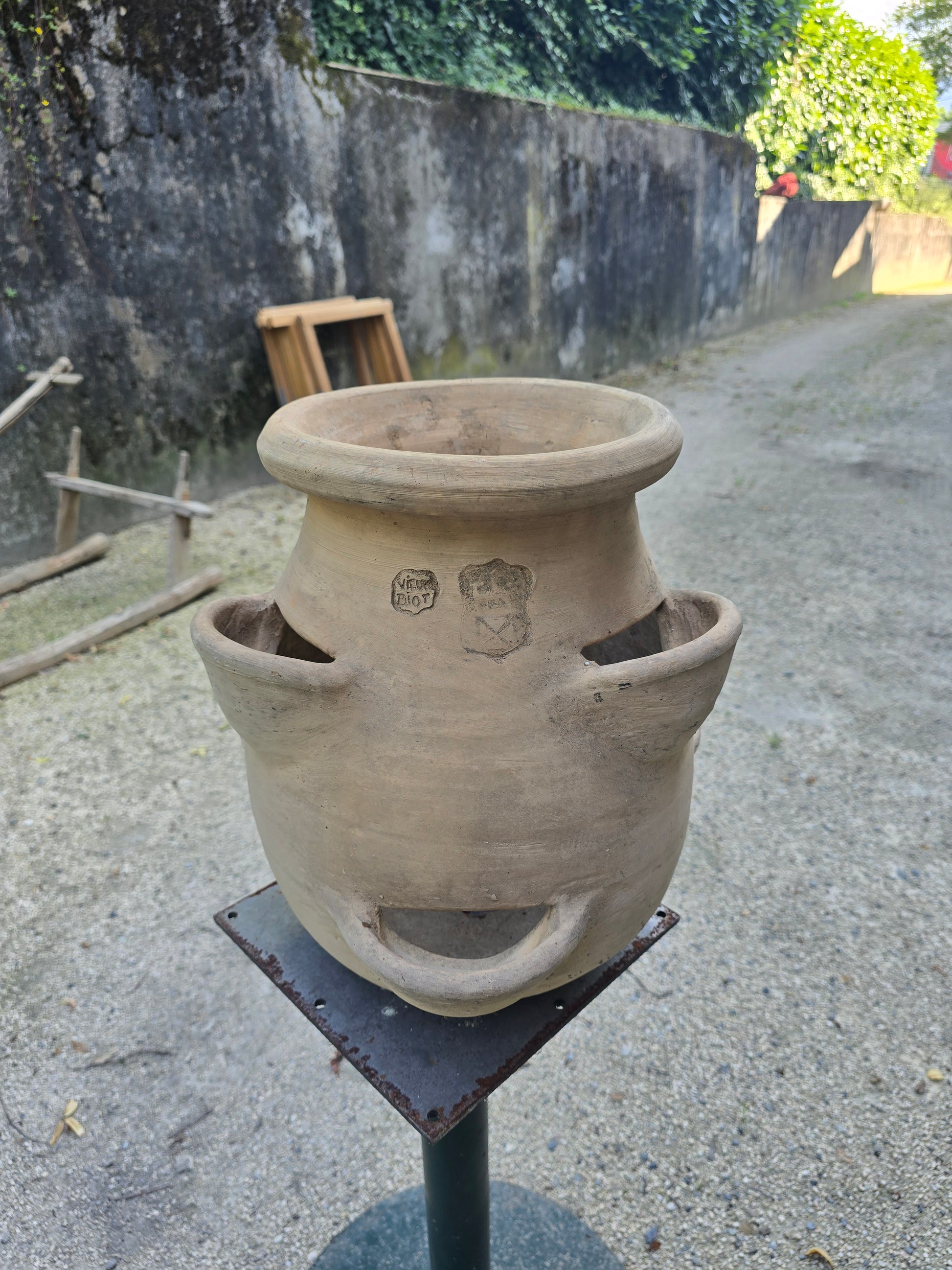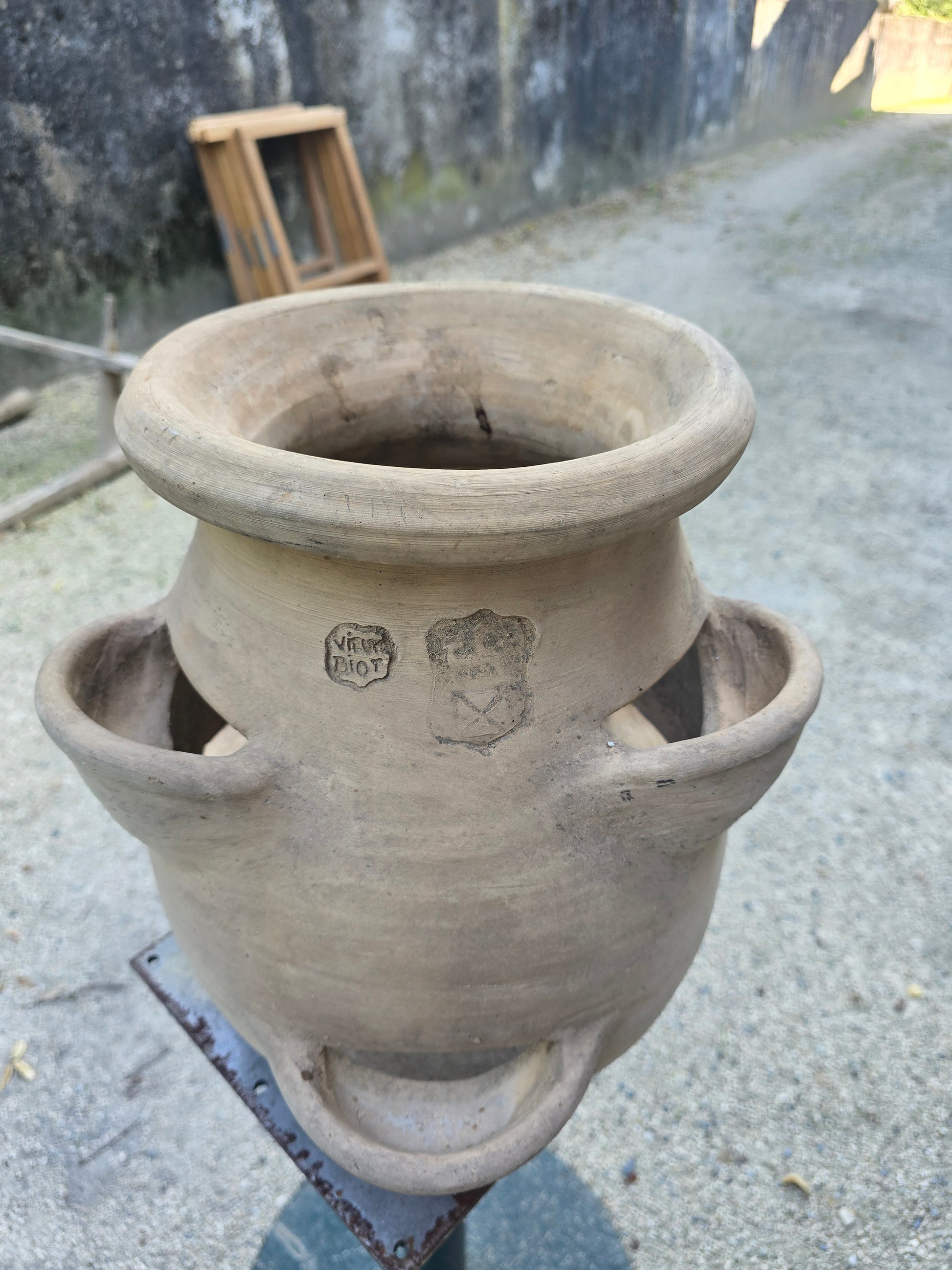 La signature "Vieux Biot" est estampillée sur la panse, garantissant son origine artisanale. Le ton naturel légèrement patiné et la forme arrondie évoquent le charme des poteries méridionales traditionnelles.