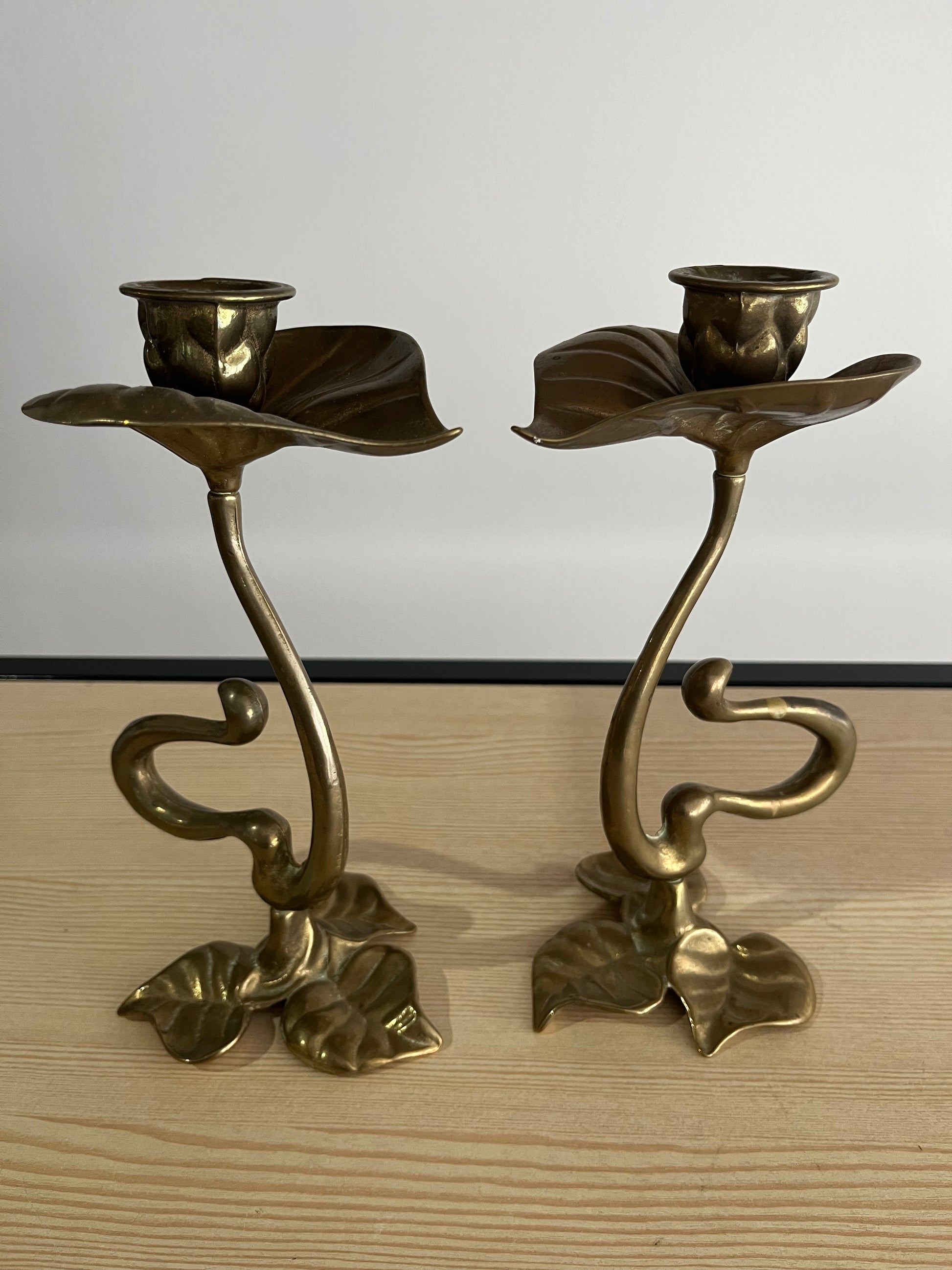 Lot de deux chandeliers en bronze pailleté, une décoration d'intérieur de style Art nouveau. Les feuilles et les ornements donnent un lustre élégant, avec une poignée pratique et un bougeoir en métal de l'époque du milieu du siècle.
