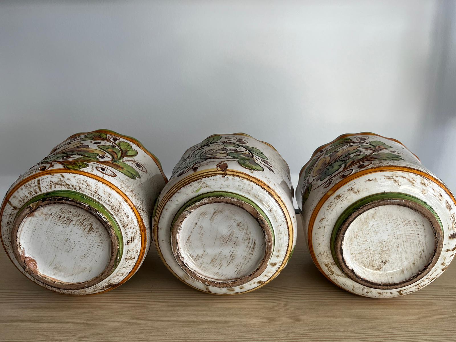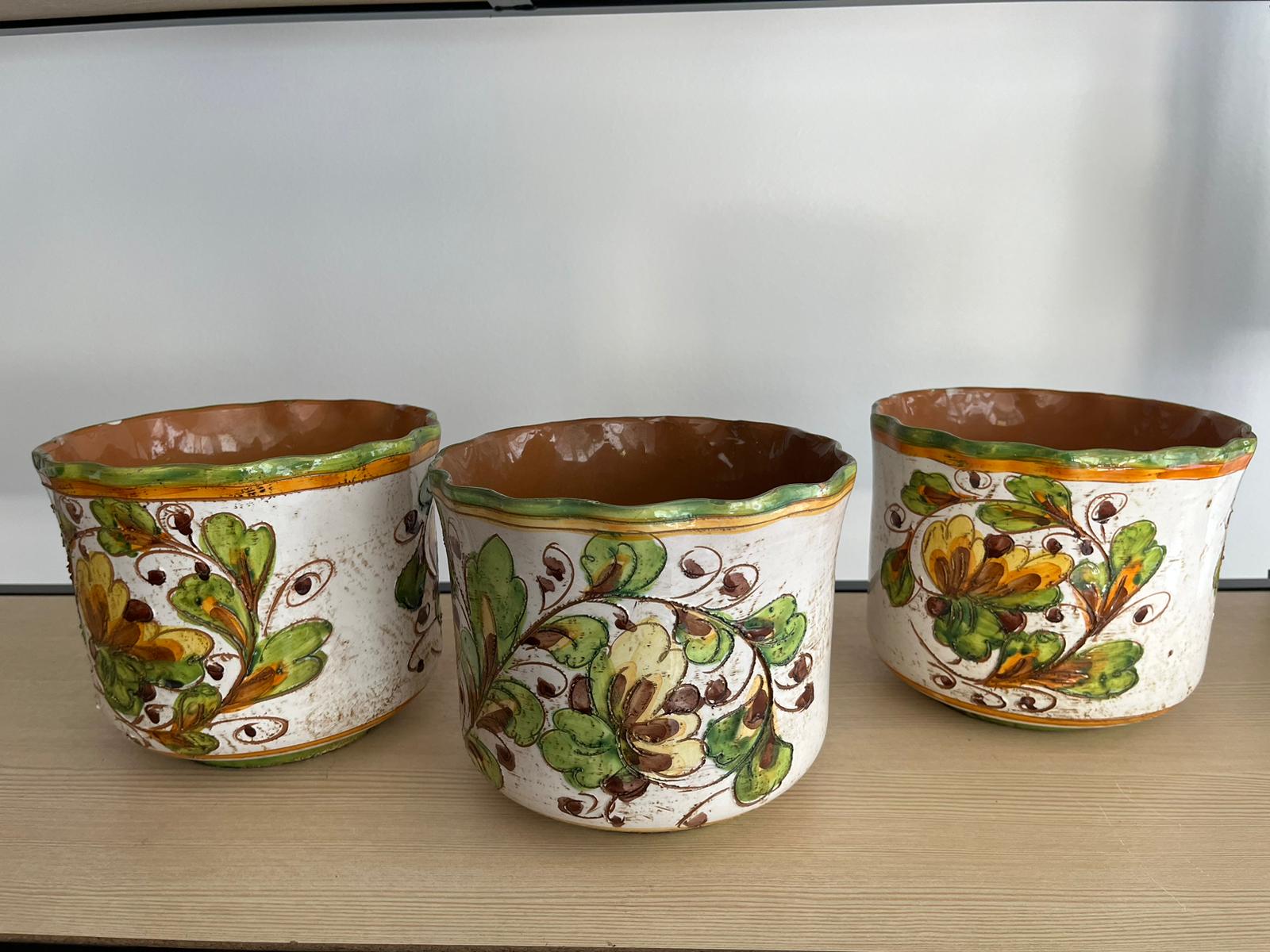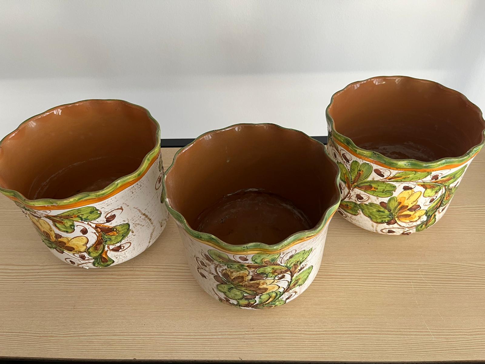 Ensemble de 3 pots vintage en céramique peint à la main, datant des années 1960. Idéal pour ajouter une touche rétro et élégante à votre décoration intérieure. Vos plantes seront mises en valeur dans ces pots uniques et durables. Ne manquez pas l'opportunité d'ajouter cette pièce de collection à votre maison.