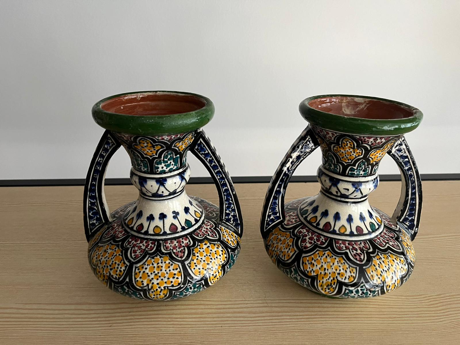 Ce lot de 2 vases du Maroc signé Safi en céramique peint mains apporteront une touche artisanale et authentique à votre intérieur. Fabriqués à partir d'argile locale et décorés à la main, ces vases uniques reflètent le savoir-faire traditionnel de la ville de Safi. Ajoutez une touche de culture et d'élégance à votre décoration avec ces magnifiques vases marocains.