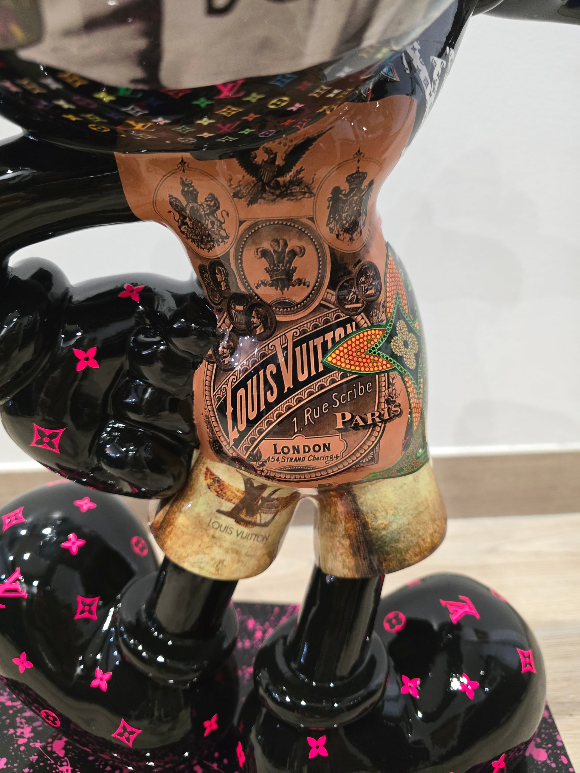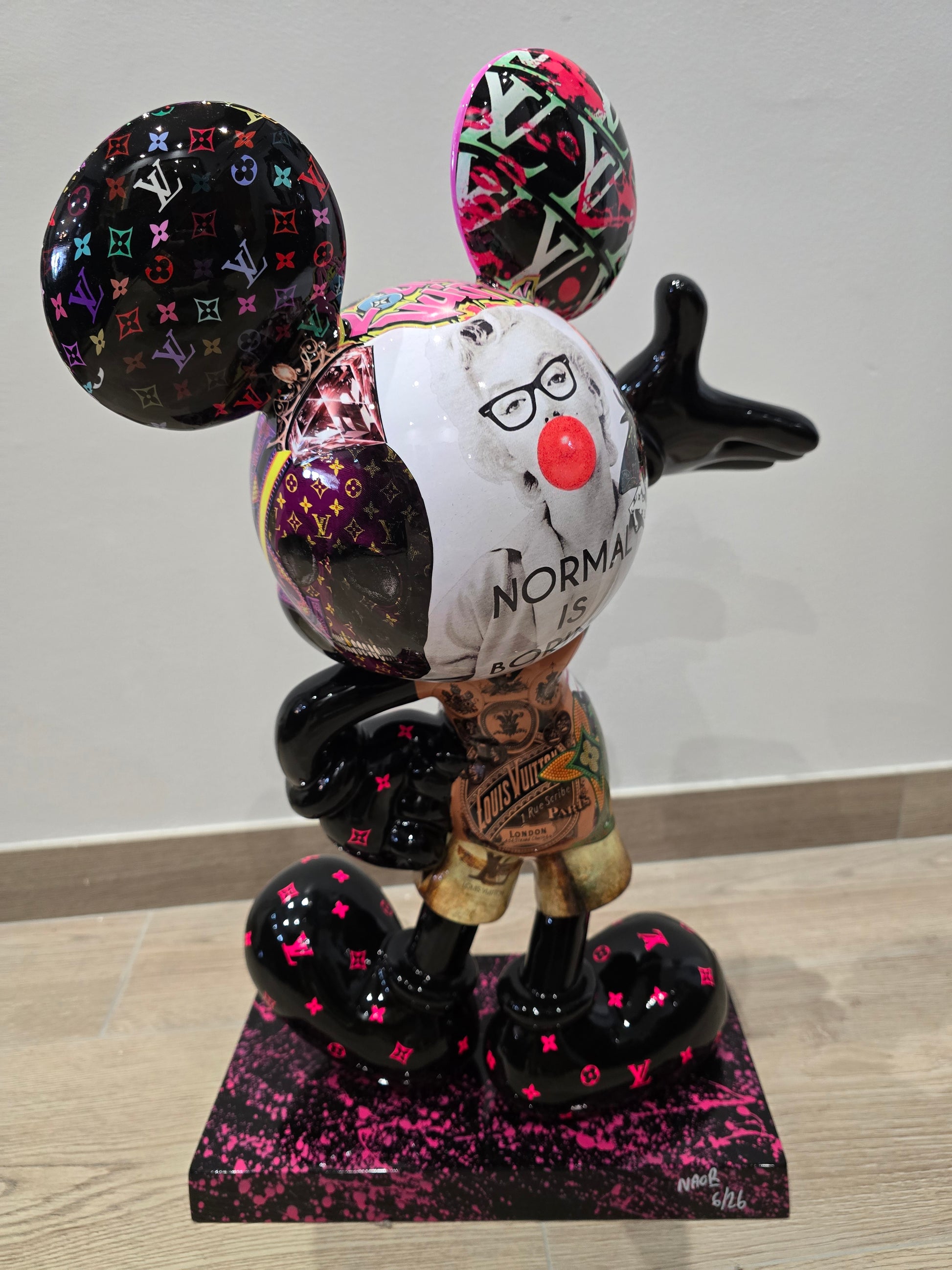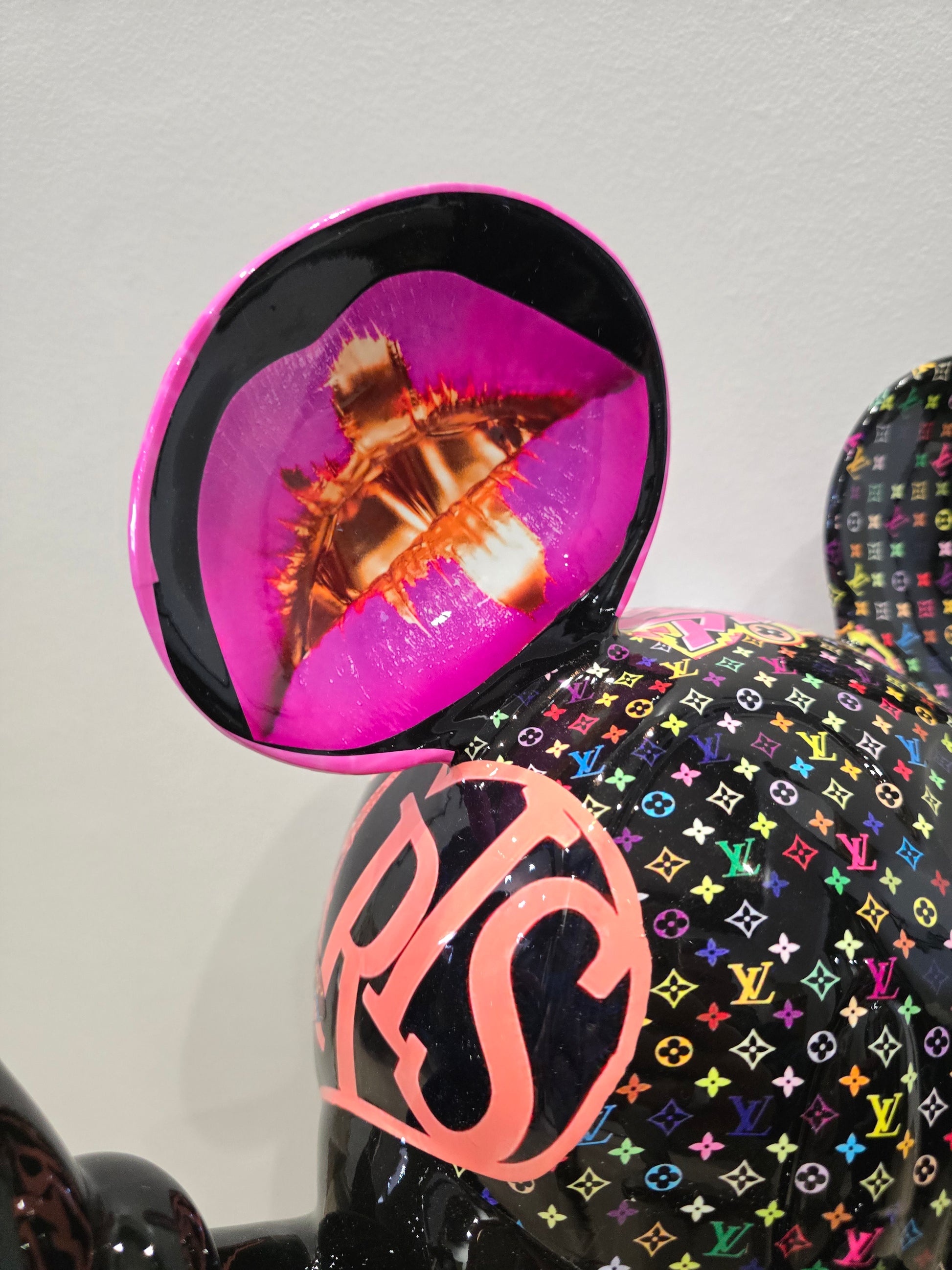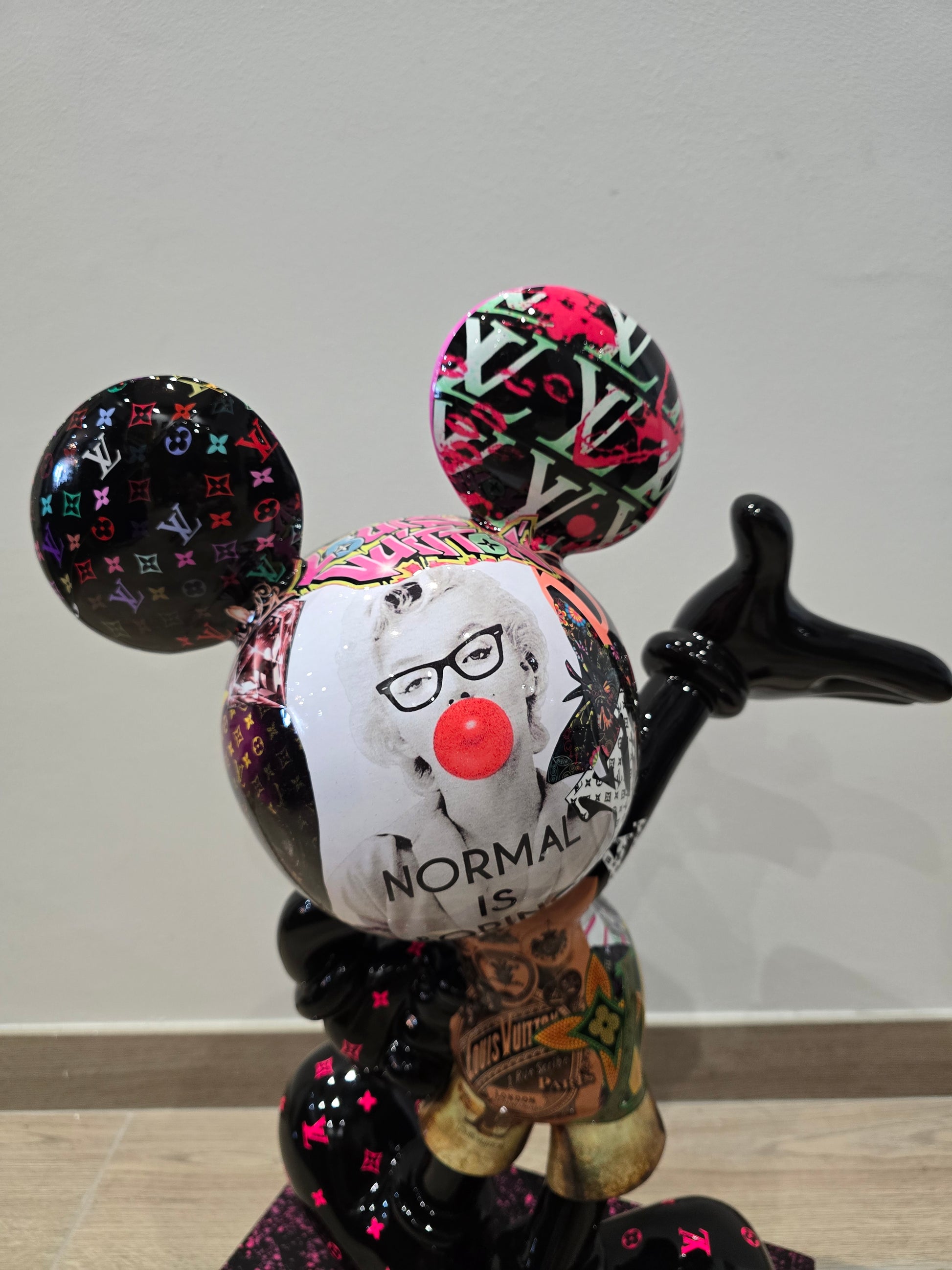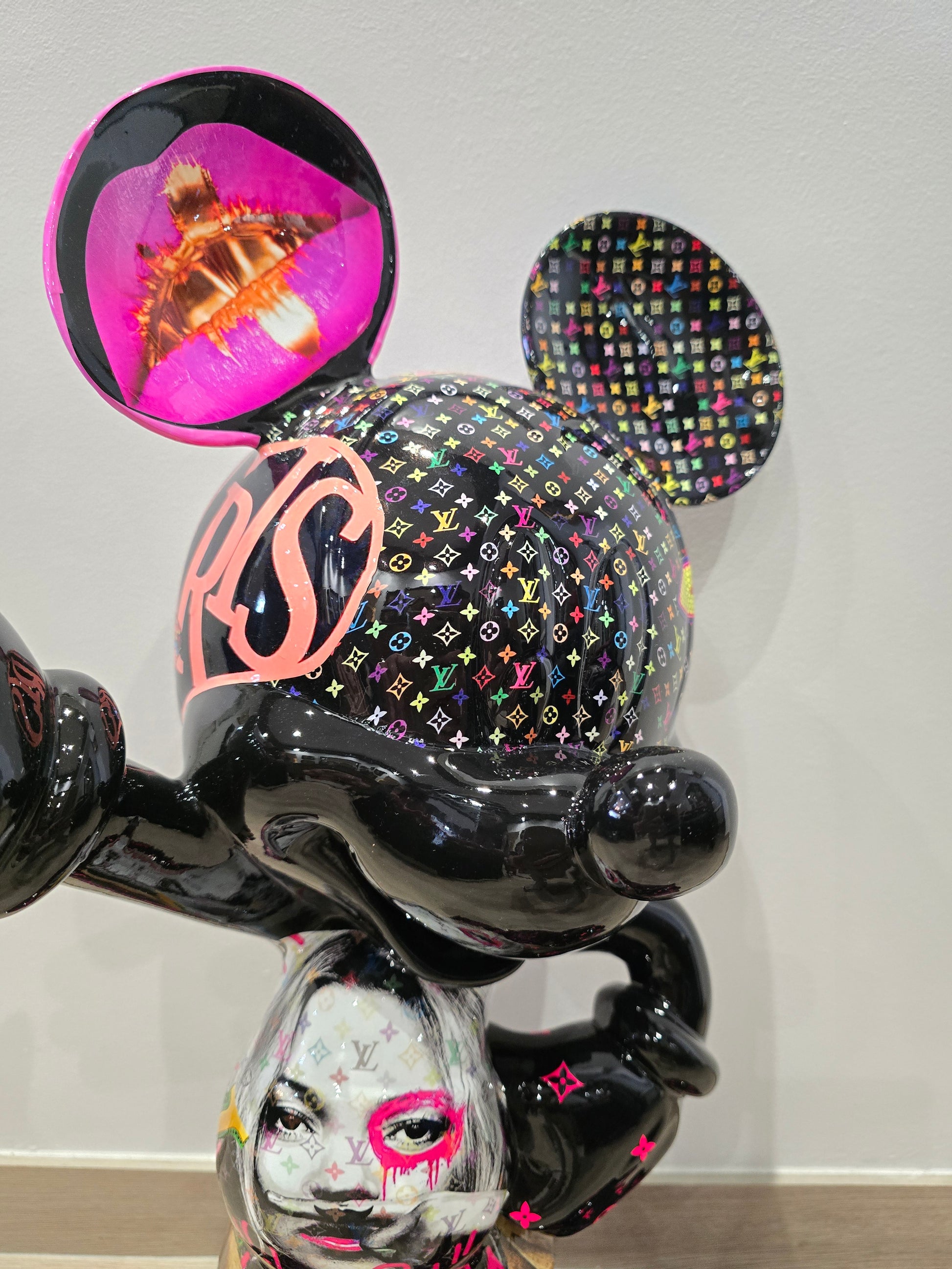 Cette sculpture de 60 cm réinvente Mickey dans une version Pop Art ultra-luxueuse, intégrant les codes graphiques de Louis Vuitton et de la culture urbaine contemporaine. Véritable pièce d’art décoratif, cette œuvre est recouverte d’un covering spectaculaire mêlant :