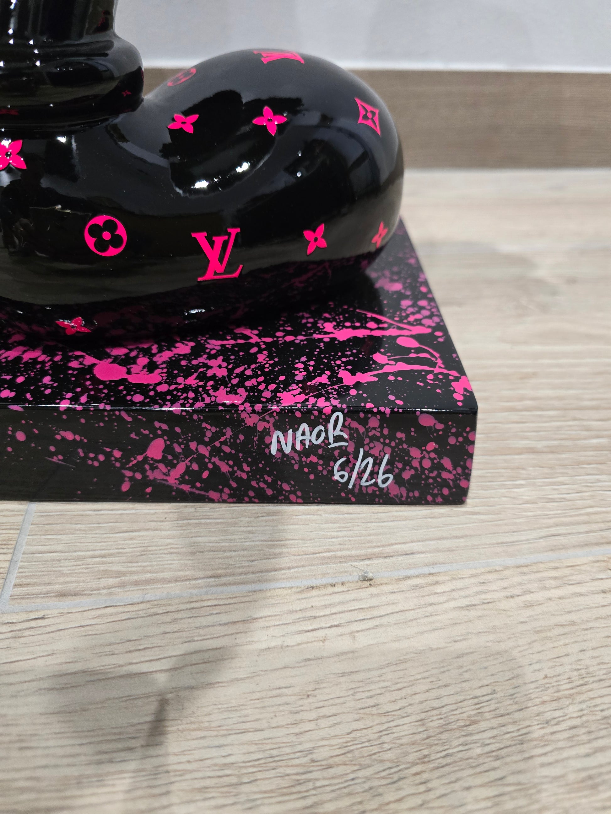 La sculpture repose sur un socle noir éclaboussé de peinture rose, qui renforce l’effet galerie/street art. Chaque centimètre carré est pensé pour attirer l’œil et provoquer l’admiration.