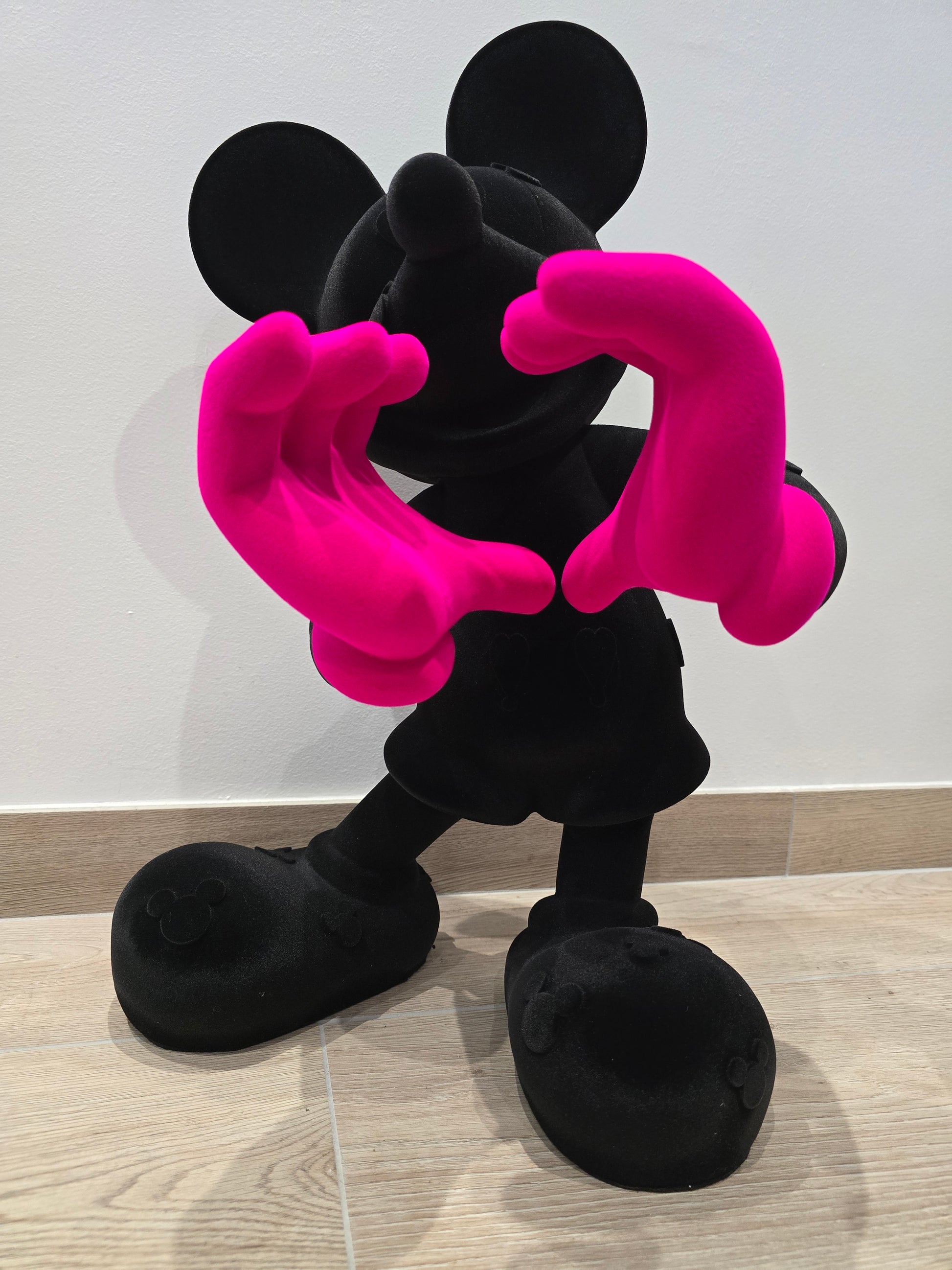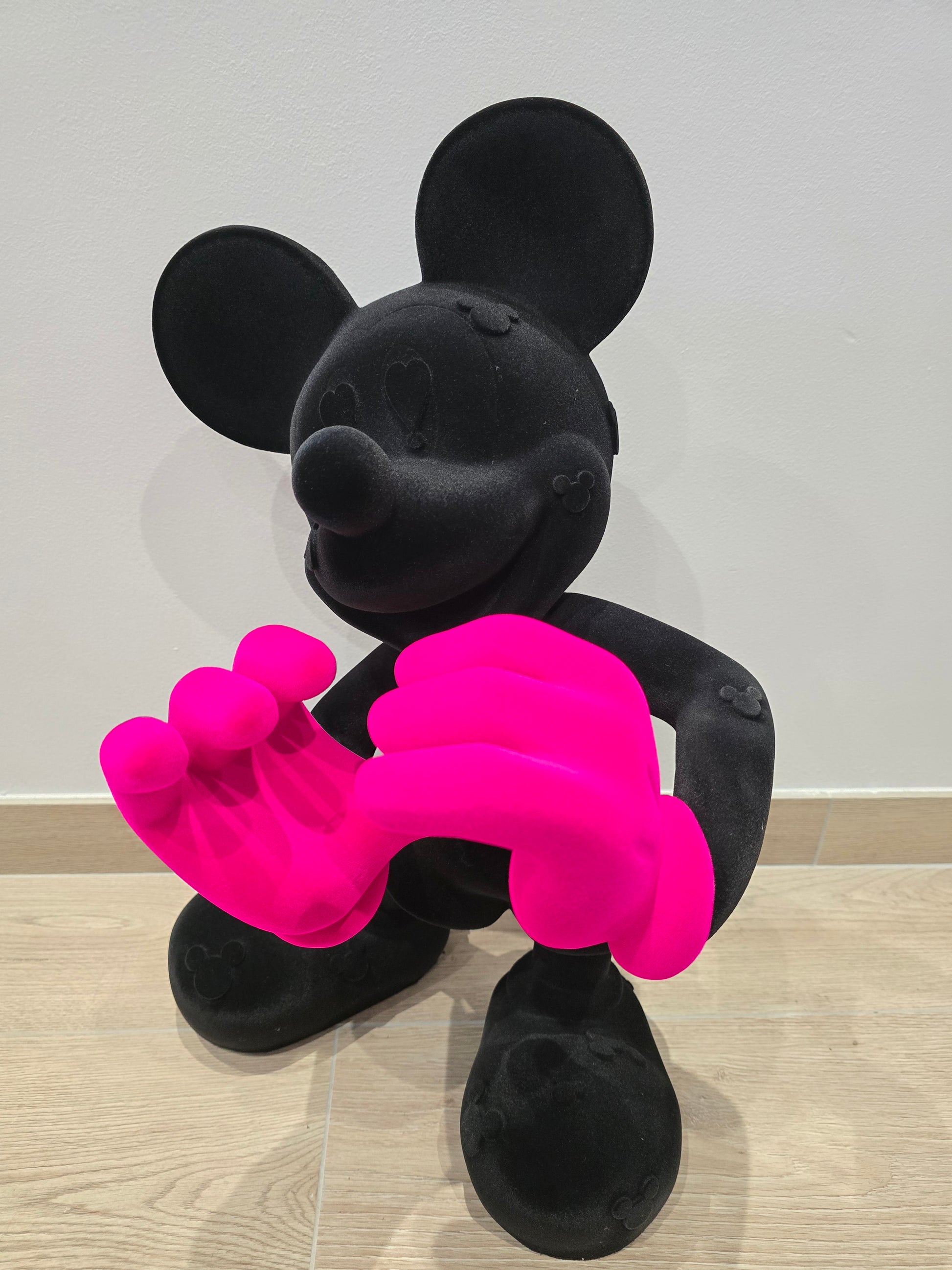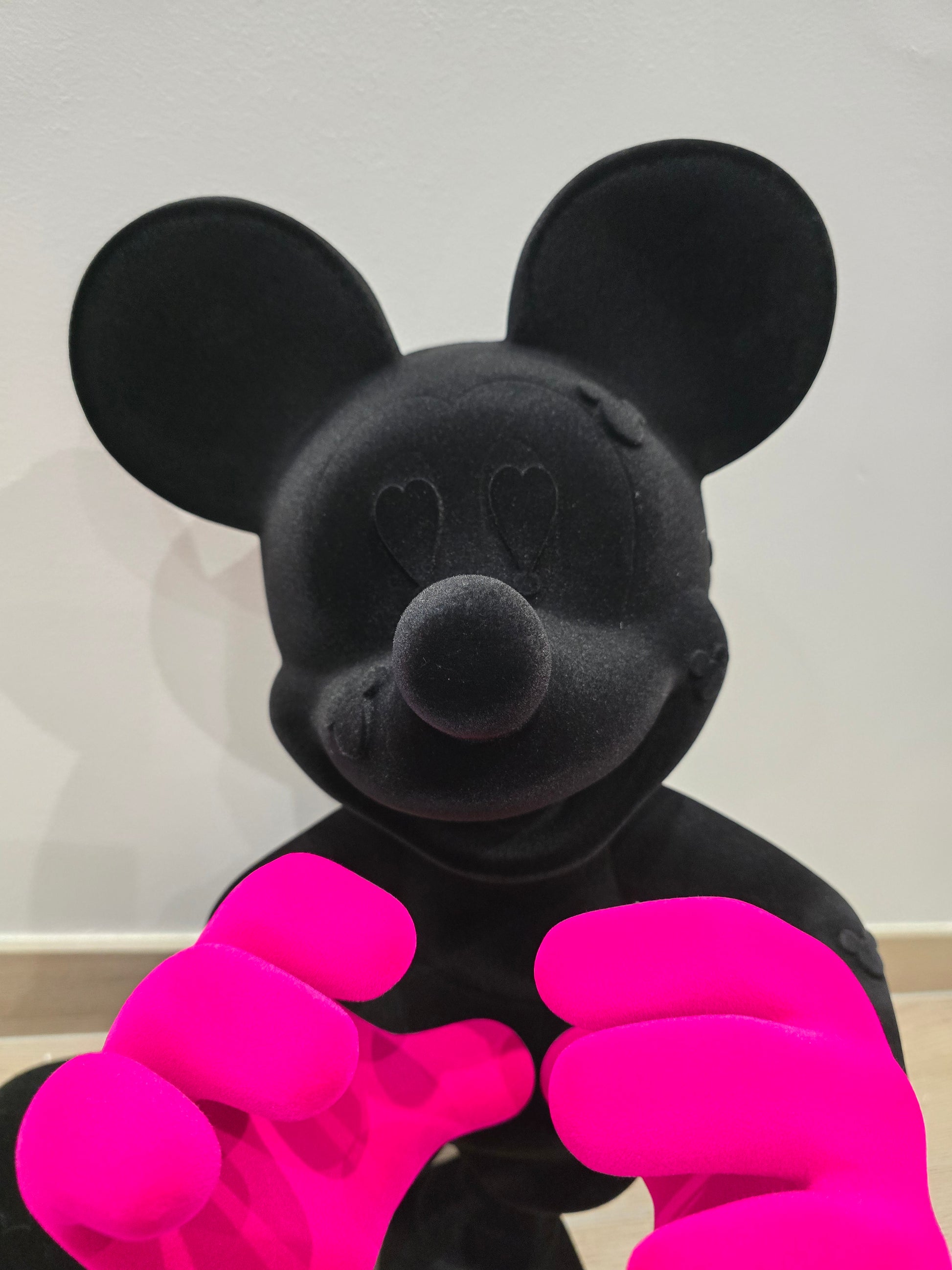 Cette sculpture imposante de 60 cm réinvente Mickey dans un style contemporain et décalé. Recouvert d’un velours noir profond et mat, ce Mickey arbore des gants rose fluo texturés qui attirent immédiatement le regard. Son regard en forme de cœur et sa posture joviale en font une pièce unique et expressive, parfaite pour un intérieur moderne ou une collection Pop Art.