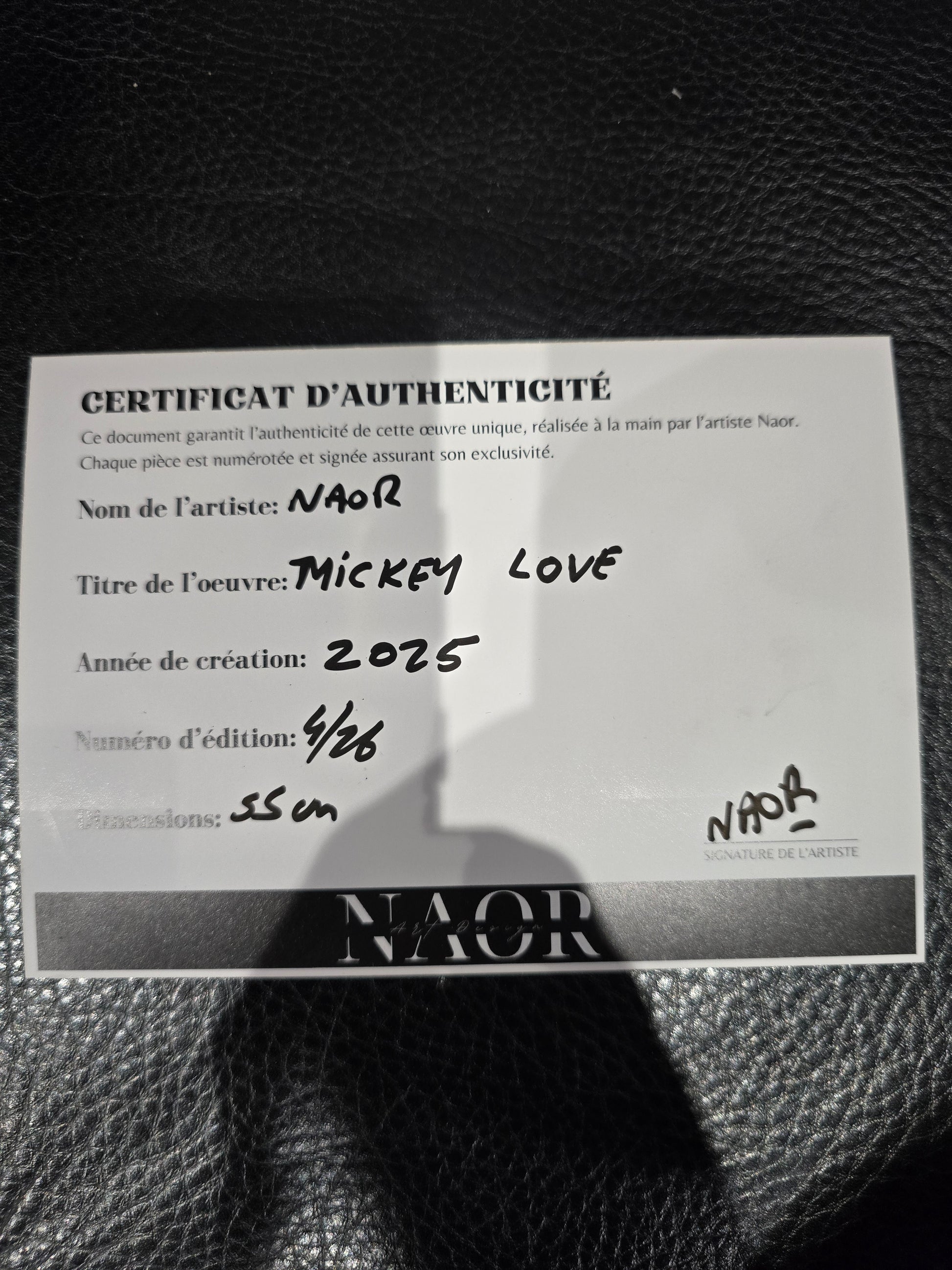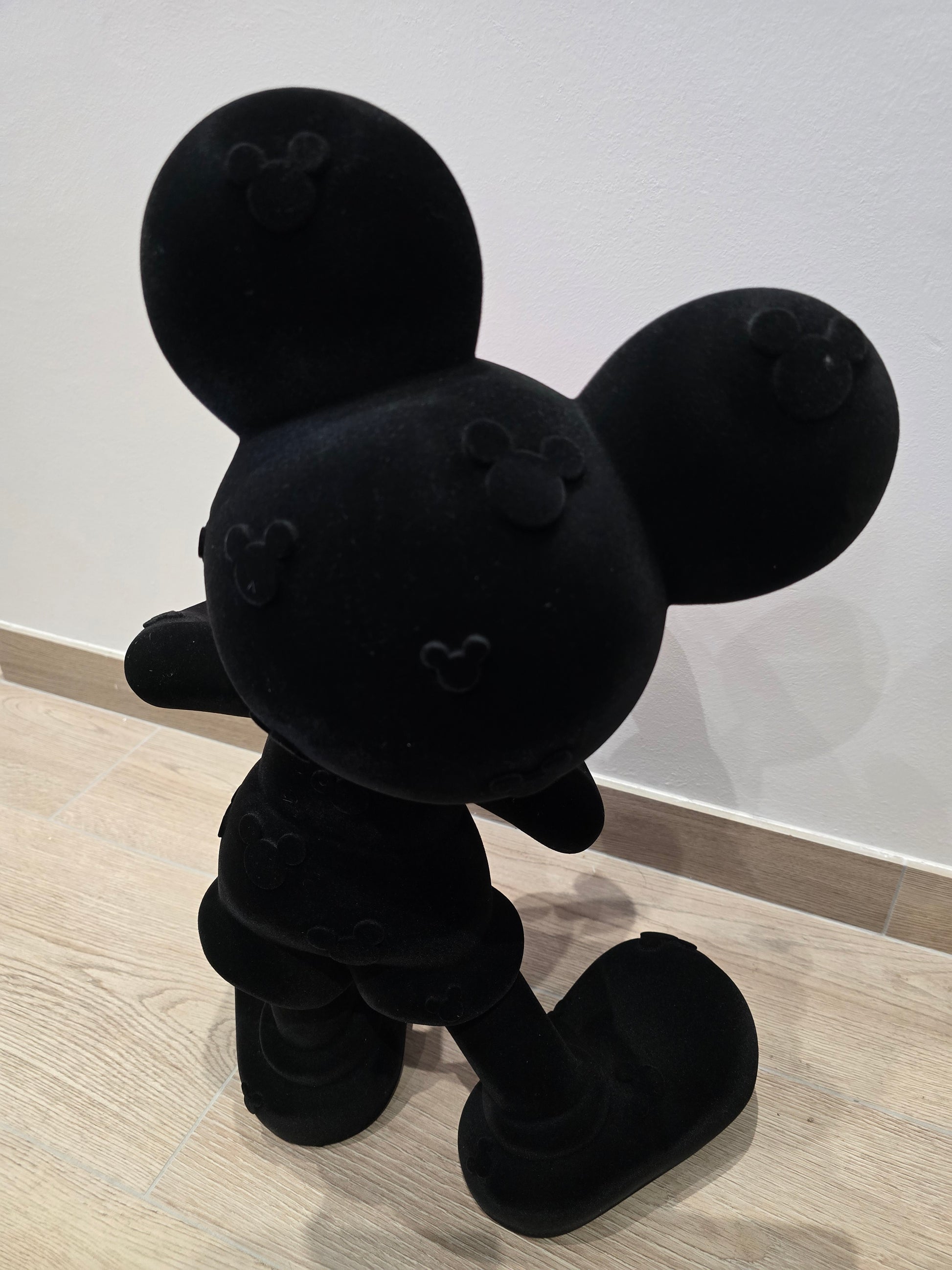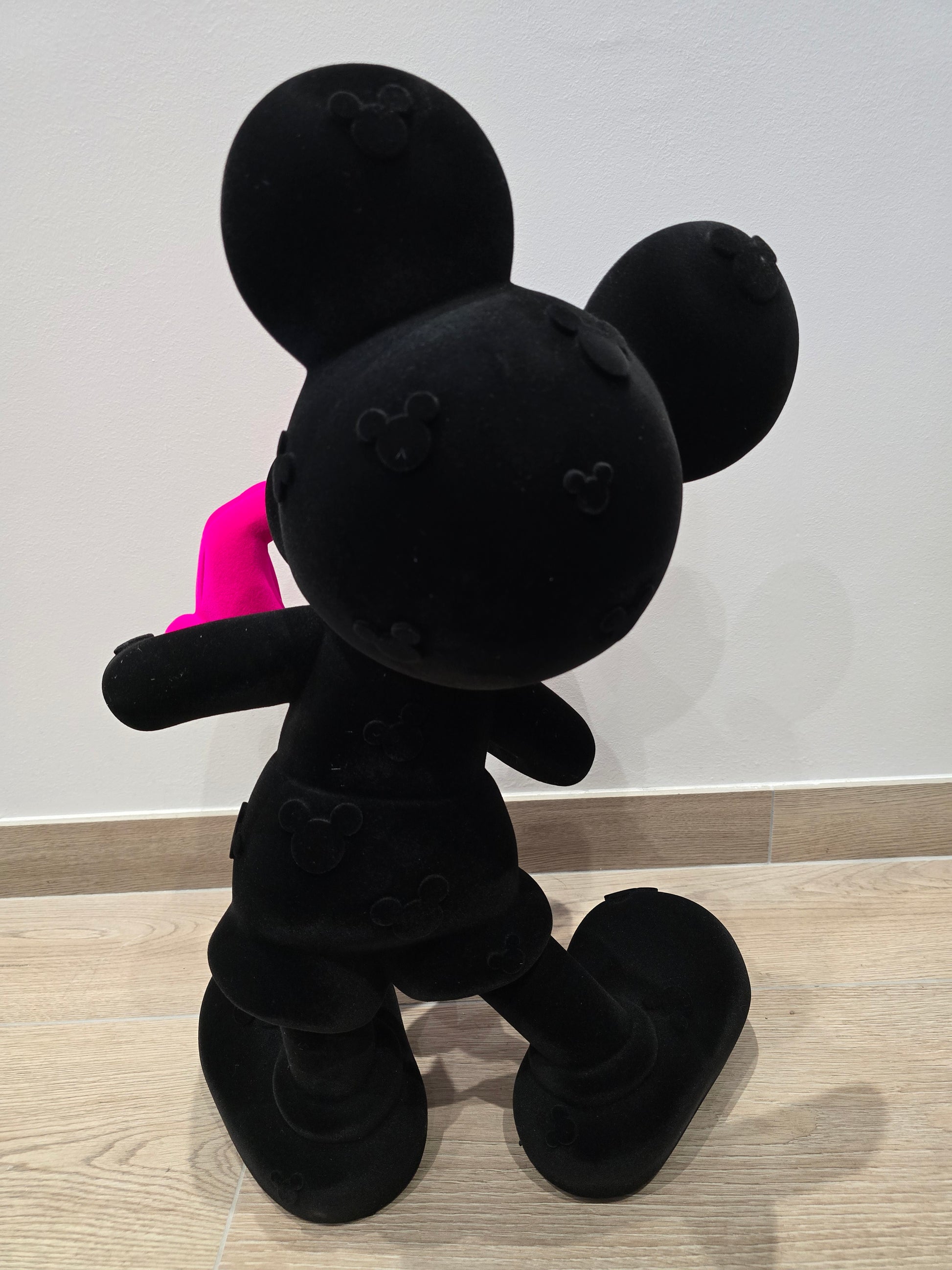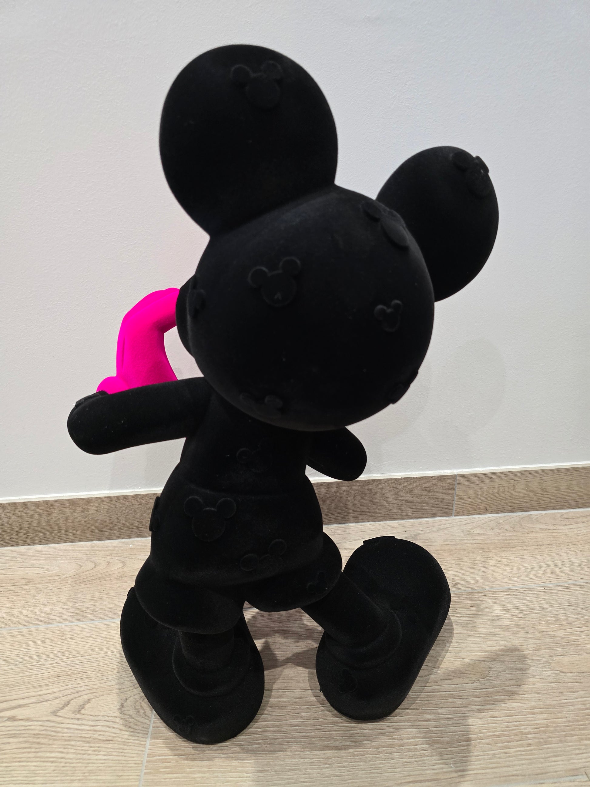 Cette sculpture imposante de 60 cm réinvente Mickey dans un style contemporain et décalé. Recouvert d’un velours noir profond et mat, ce Mickey arbore des gants rose fluo texturés qui attirent immédiatement le regard. Son regard en forme de cœur et sa posture joviale en font une pièce unique et expressive, parfaite pour un intérieur moderne ou une collection Pop Art.