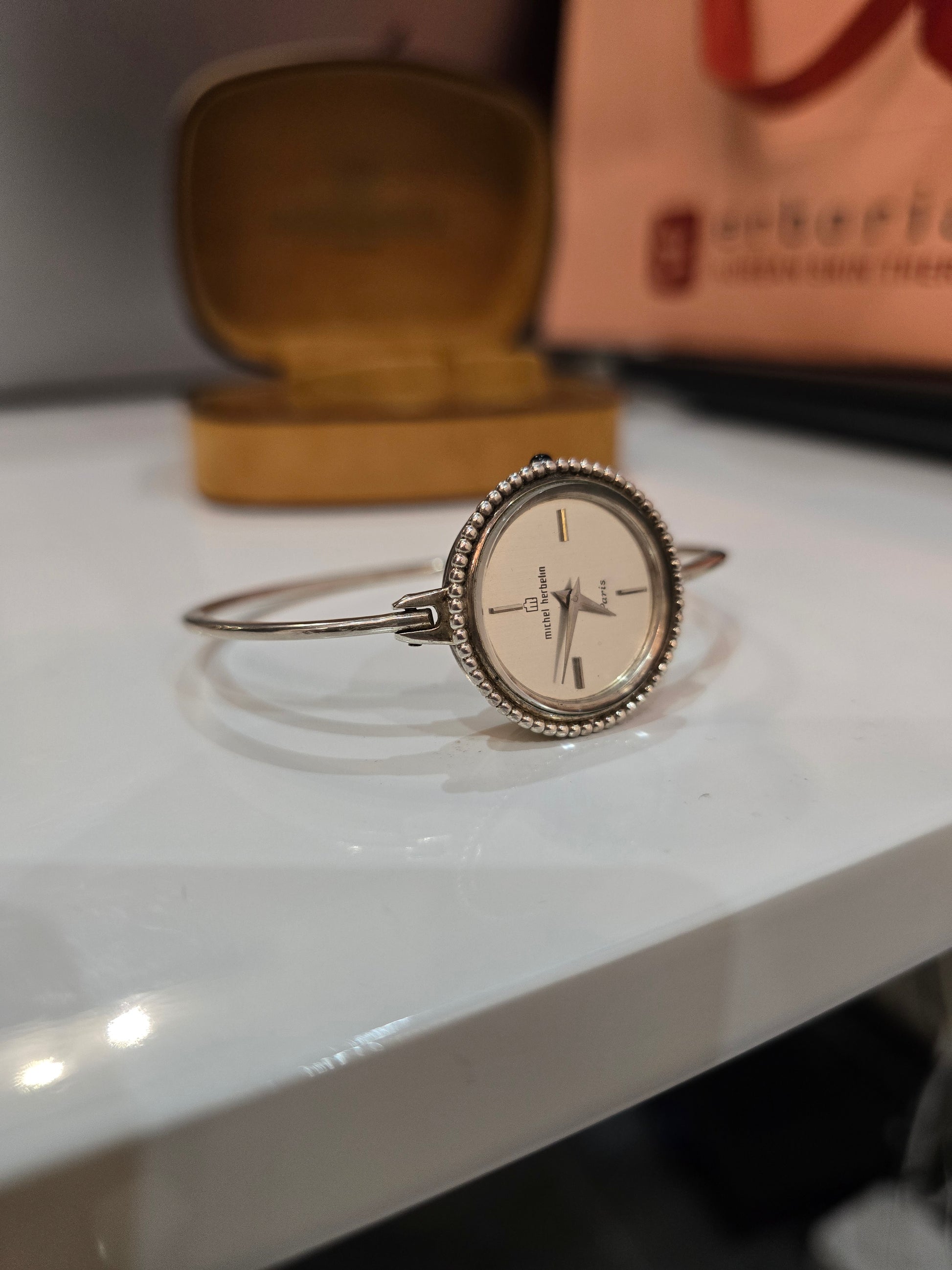 Élégante montre féminine signée Michel Herbelin, maison horlogère française fondée en 1947. Ce modèle au design raffiné combine la finesse d’un bracelet jonc en argent massif poinçonné 835 et la sobriété d’un cadran argenté à index fins. Le pourtour du boîtier est orné d’un décor perlé, apportant une touche de chic intemporel.
