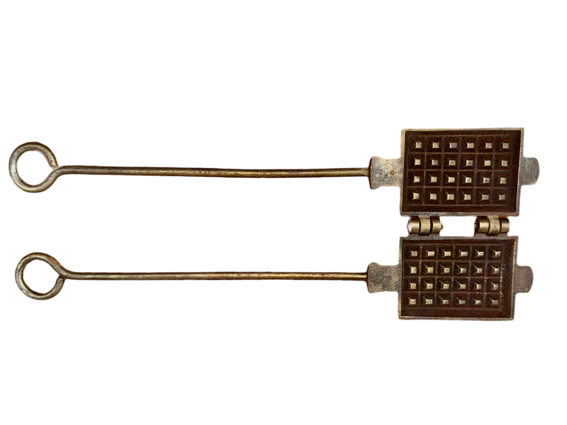 Superbe moule à gaufres ancien en fonte pleine, fabriqué par la célèbre fonderie Godin Colin & Cie à Guise (France). Ce modèle n°26 se compose de deux plaques à motif carré profond, montées sur charnière, avec de longues poignées en métal terminées par des anneaux.