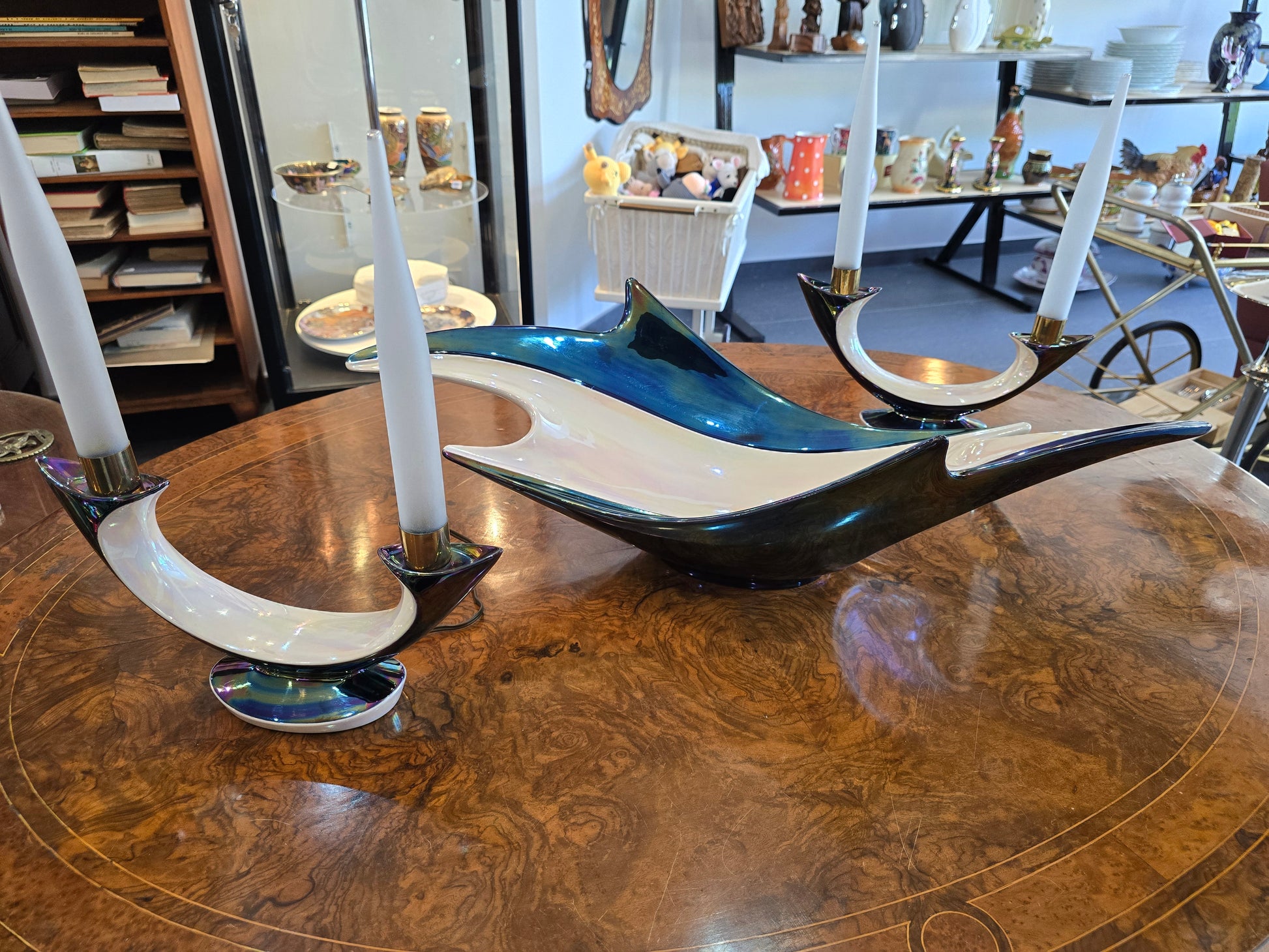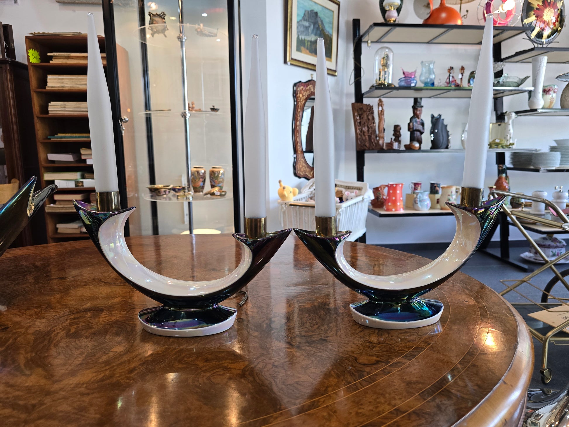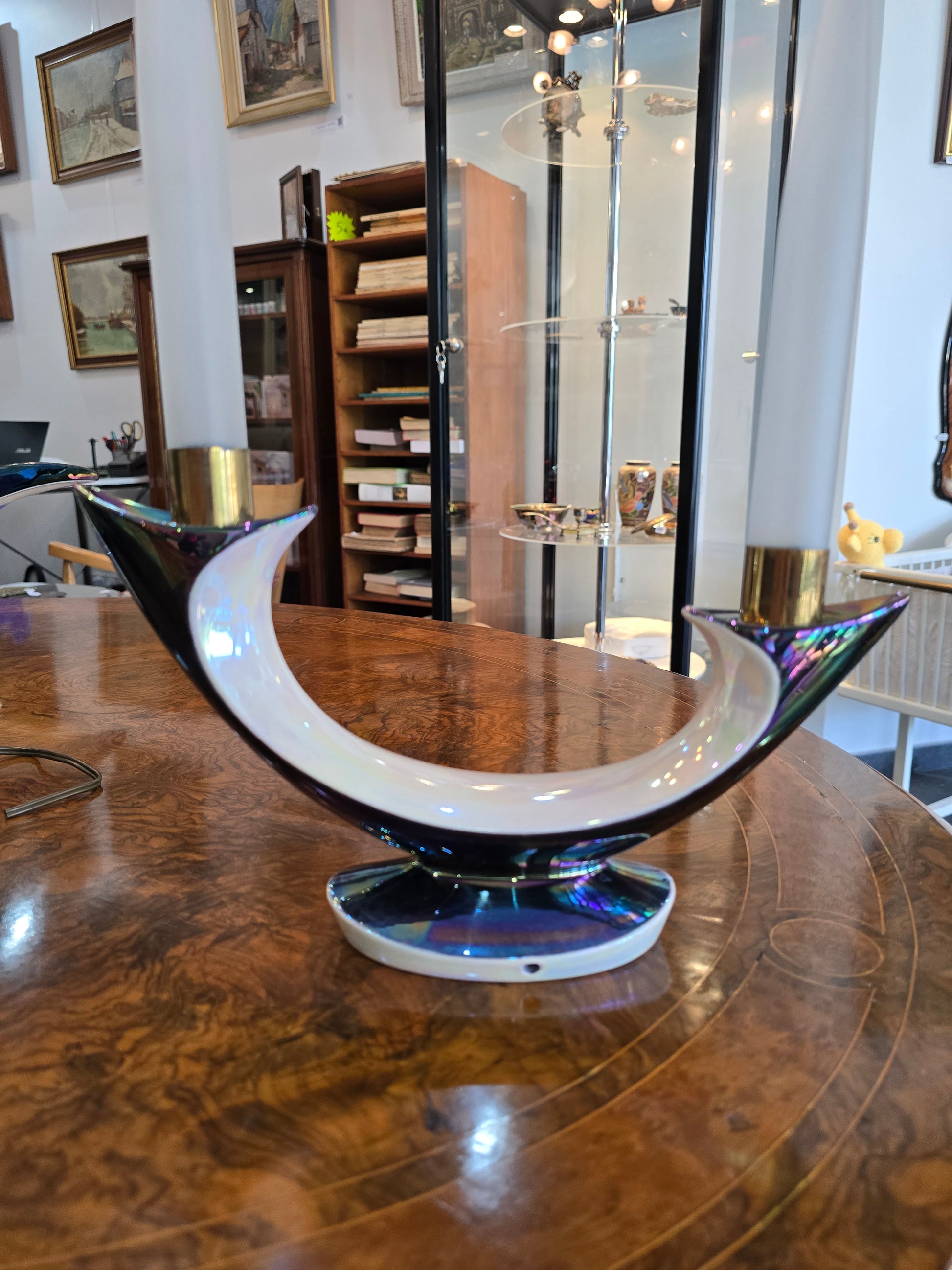 Ces pièces sculpturales présentent une silhouette en arc tendu, dynamique et élégante, montée sur une base ovale. La finition est typique de Verceram : un émaillage irisé, aux reflets noir, violet, bleu pétrole et blanc nacré.