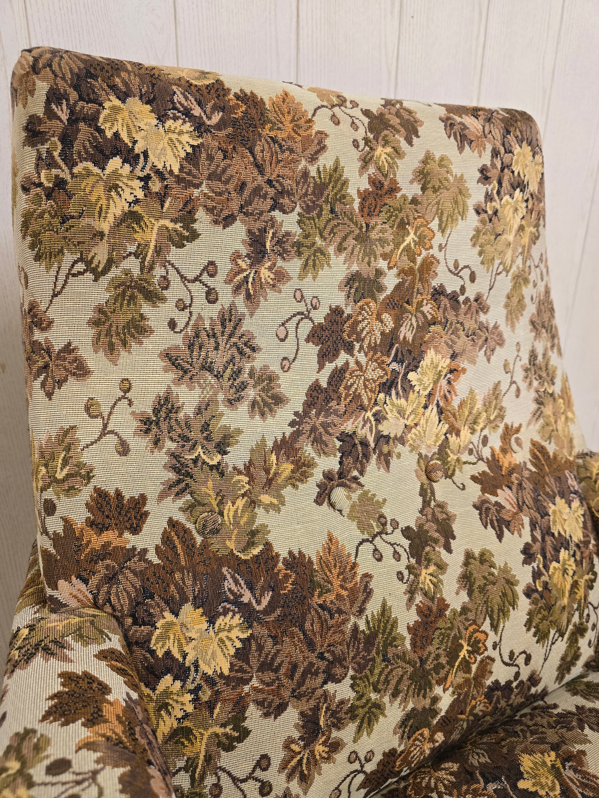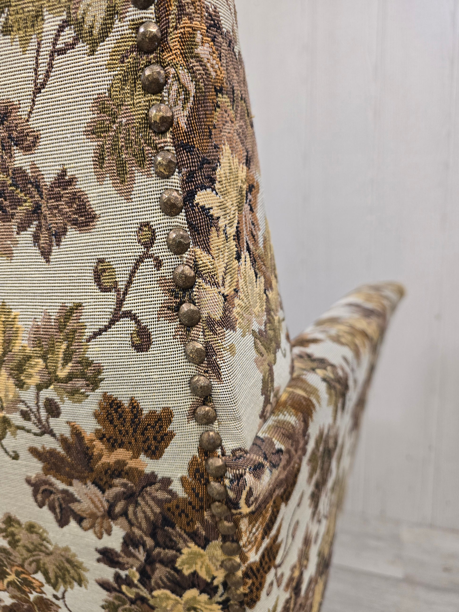 Les pieds compas fuselés en métal noir, terminés par des embouts laiton, apportent une touche élégante et raffinée, tandis que le tissu jacquard feuillage offre une texture luxueuse et chaleureuse.