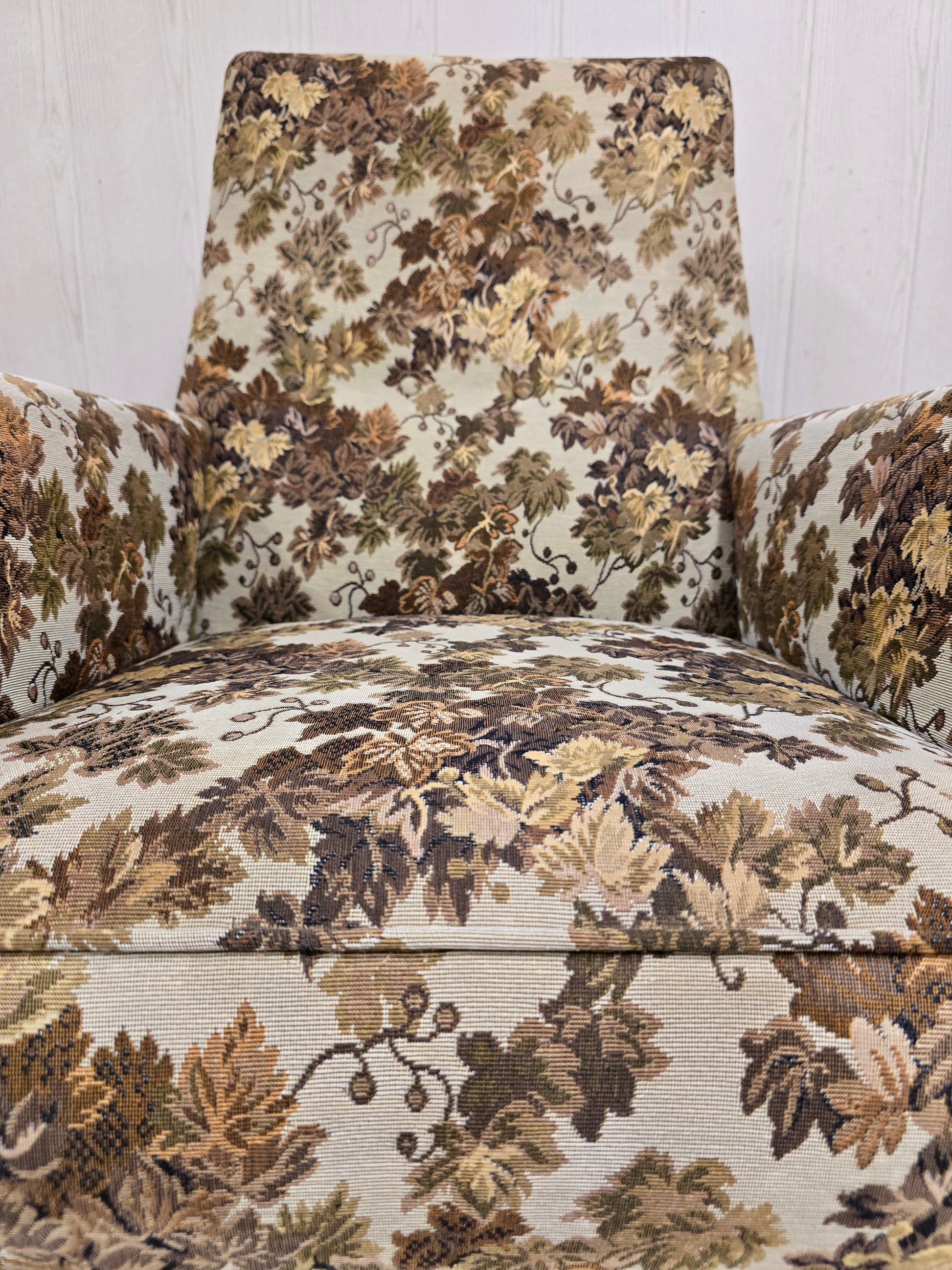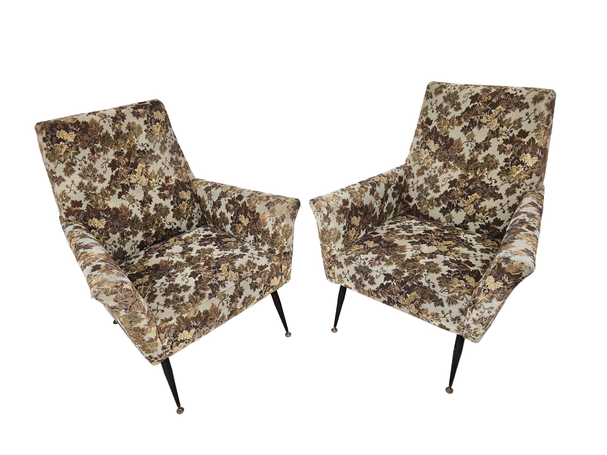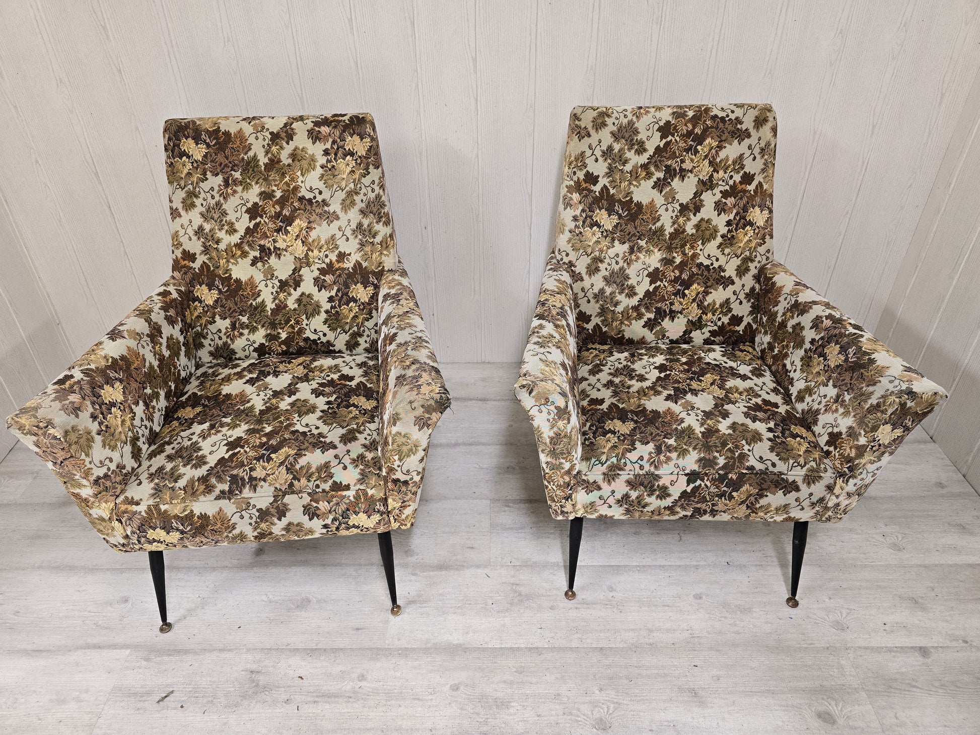 Paire de fauteuils Mid-Century Design – Piètement compas métal & tapisserie jacquard – Années 1960