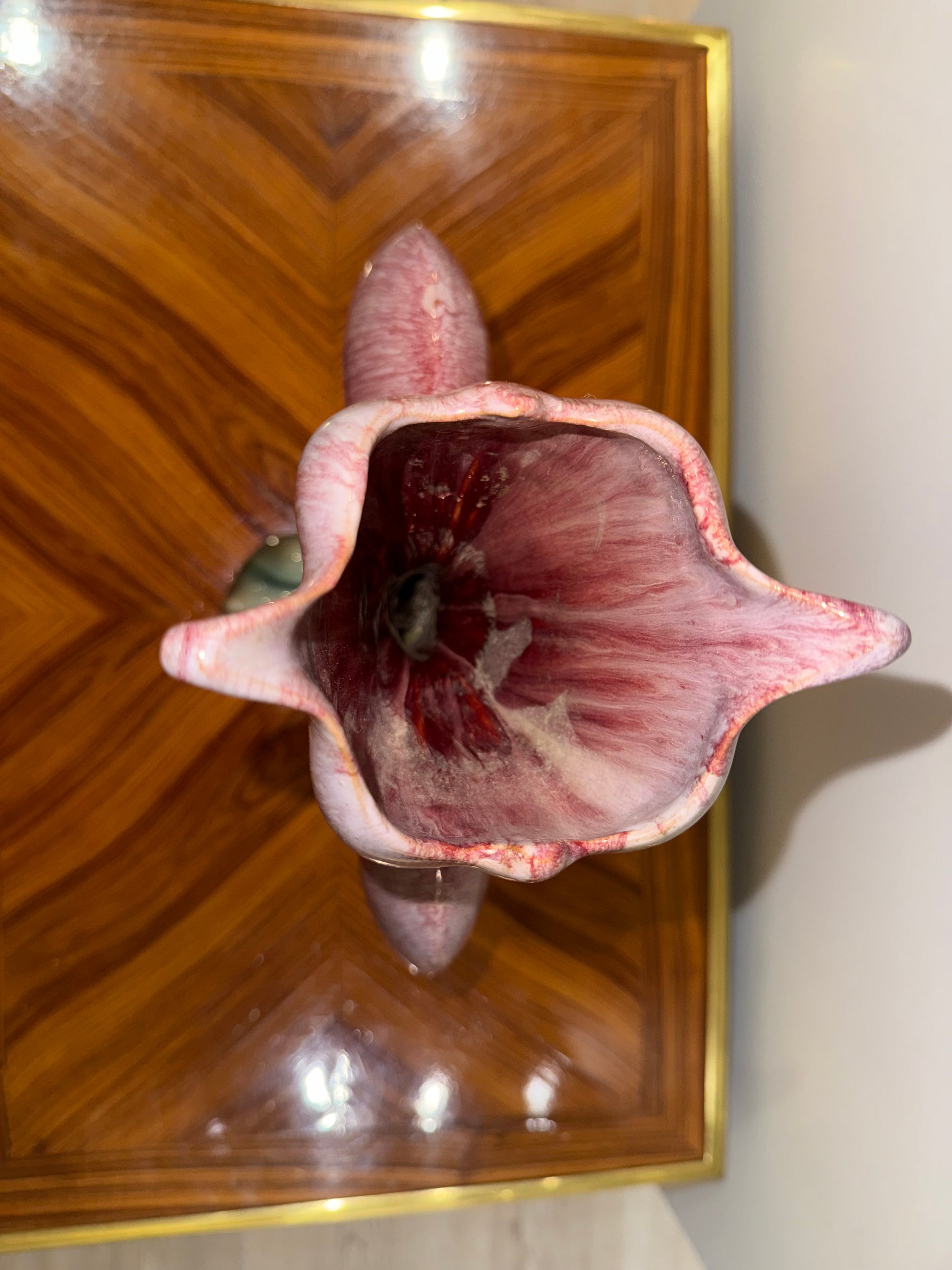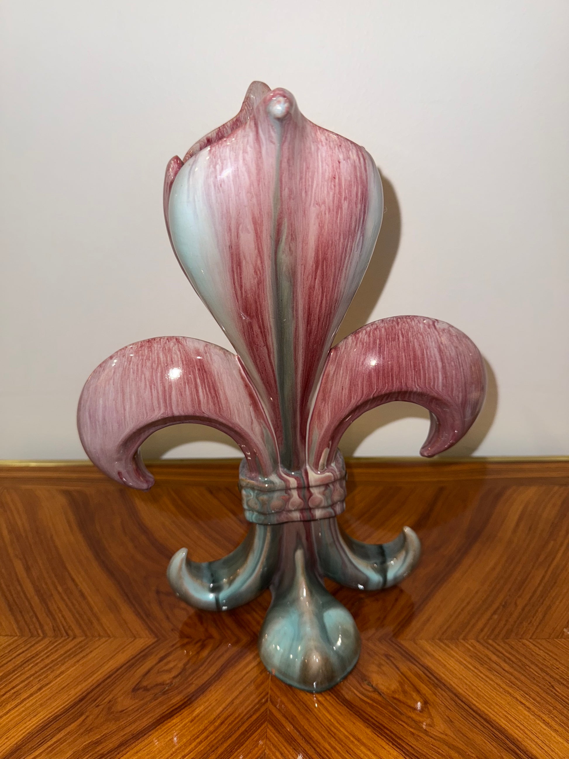 Décor : Fleur de lys stylisée à glaçure flammée bordeaux, rose et vert-de-gris