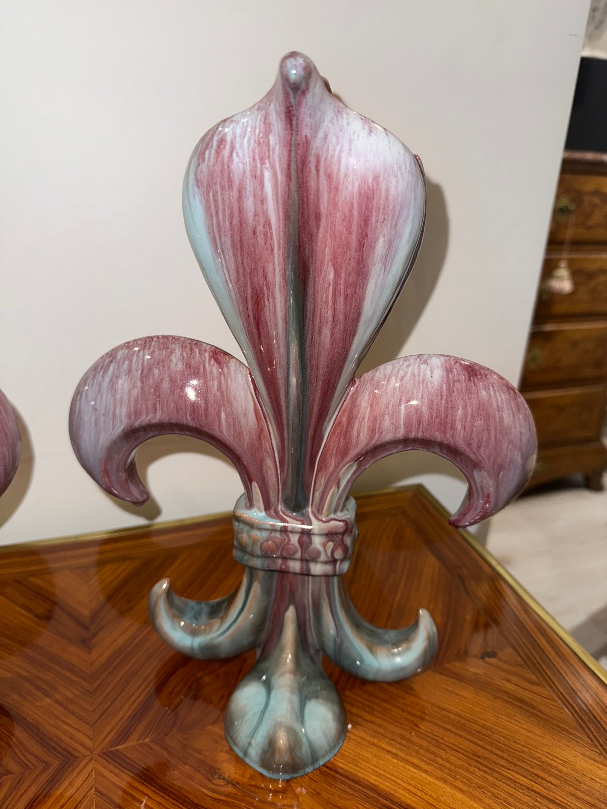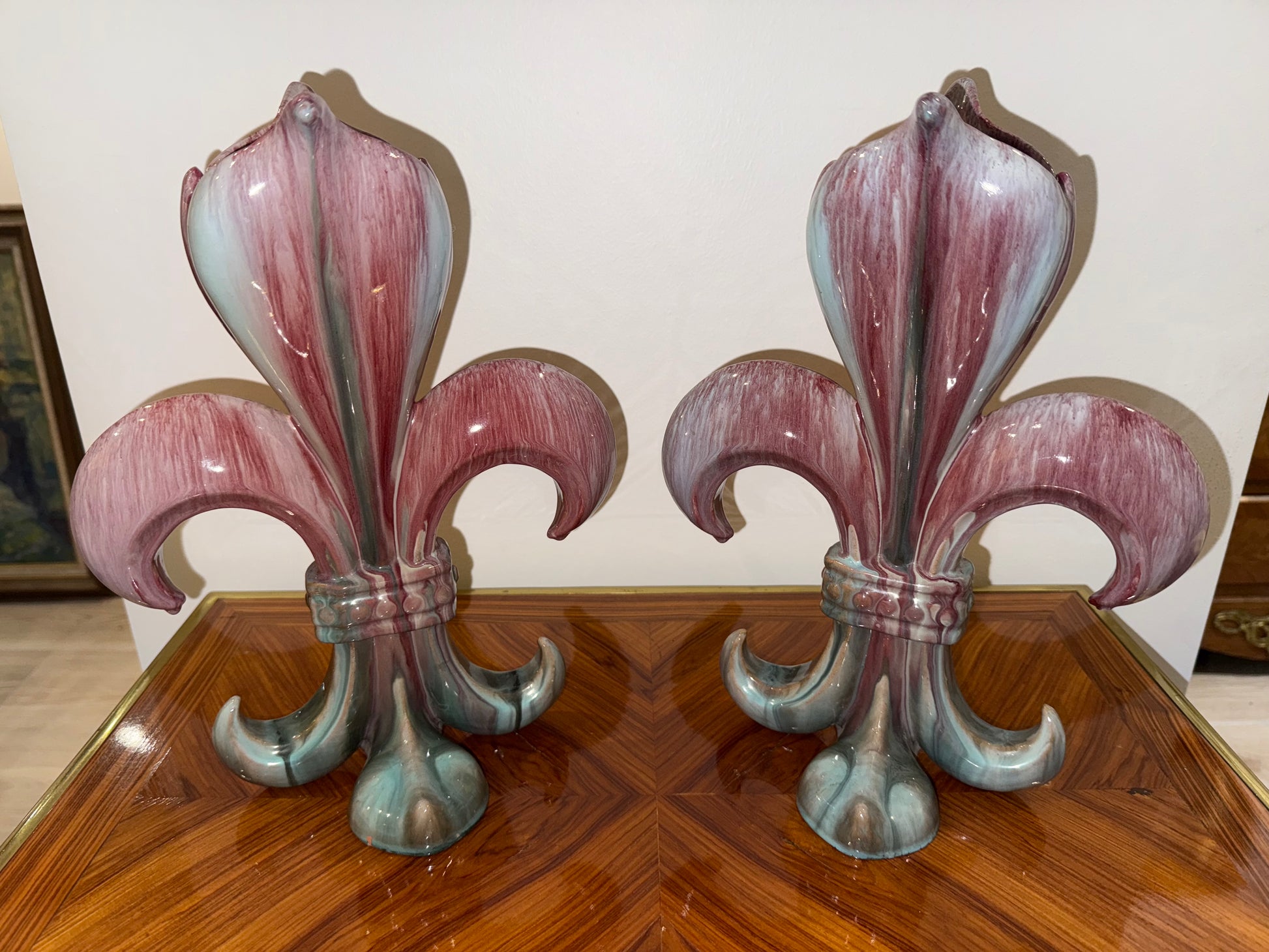 Superbe paire de sculptures décoratives en céramique émaillée, représentant des fleurs de lys, emblème royal et ornement emblématique du style classique français. Travail attribué à la Maison Vallauris, célèbre pour ses productions artistiques et artisanales du XXe siècle.