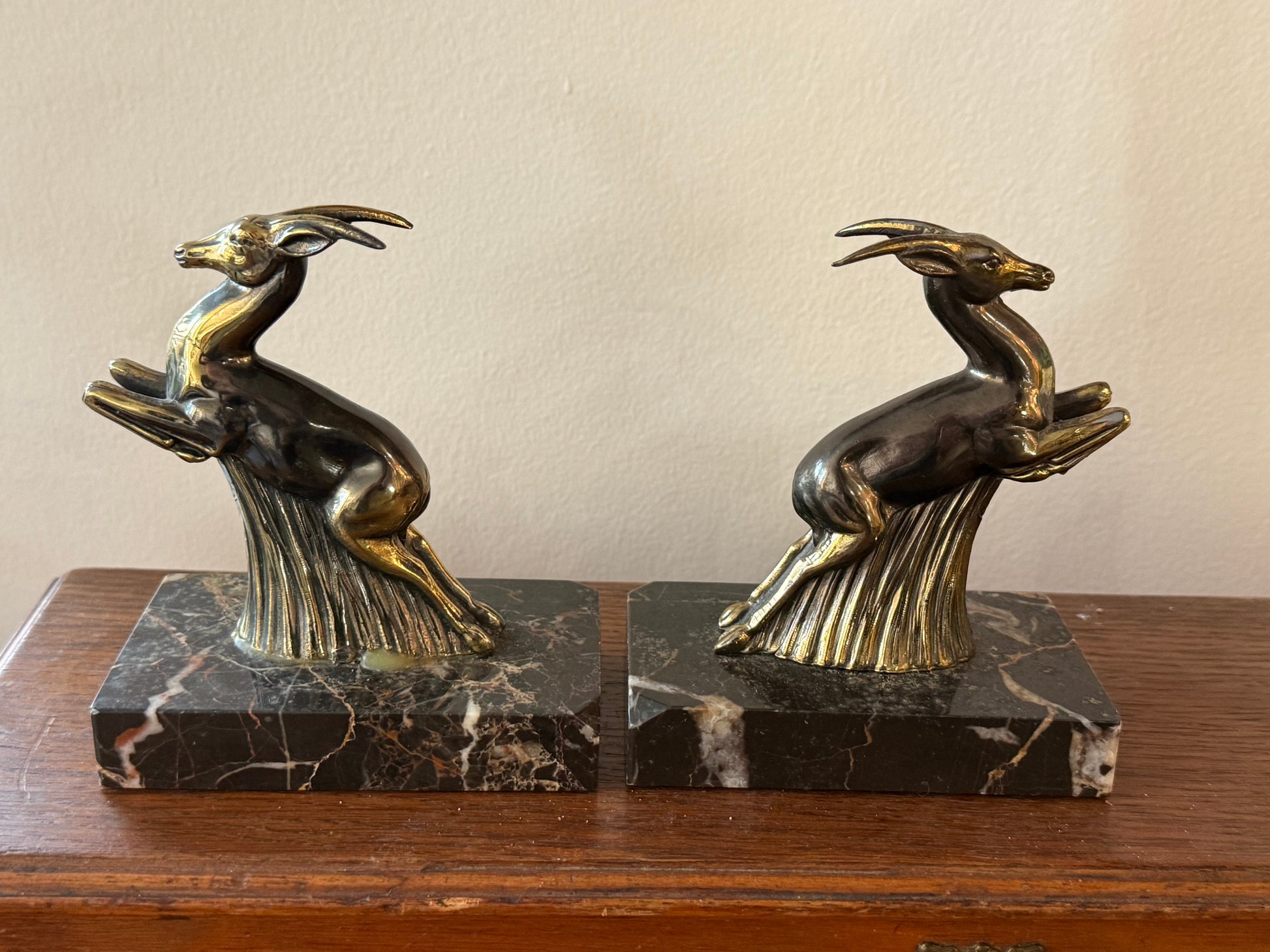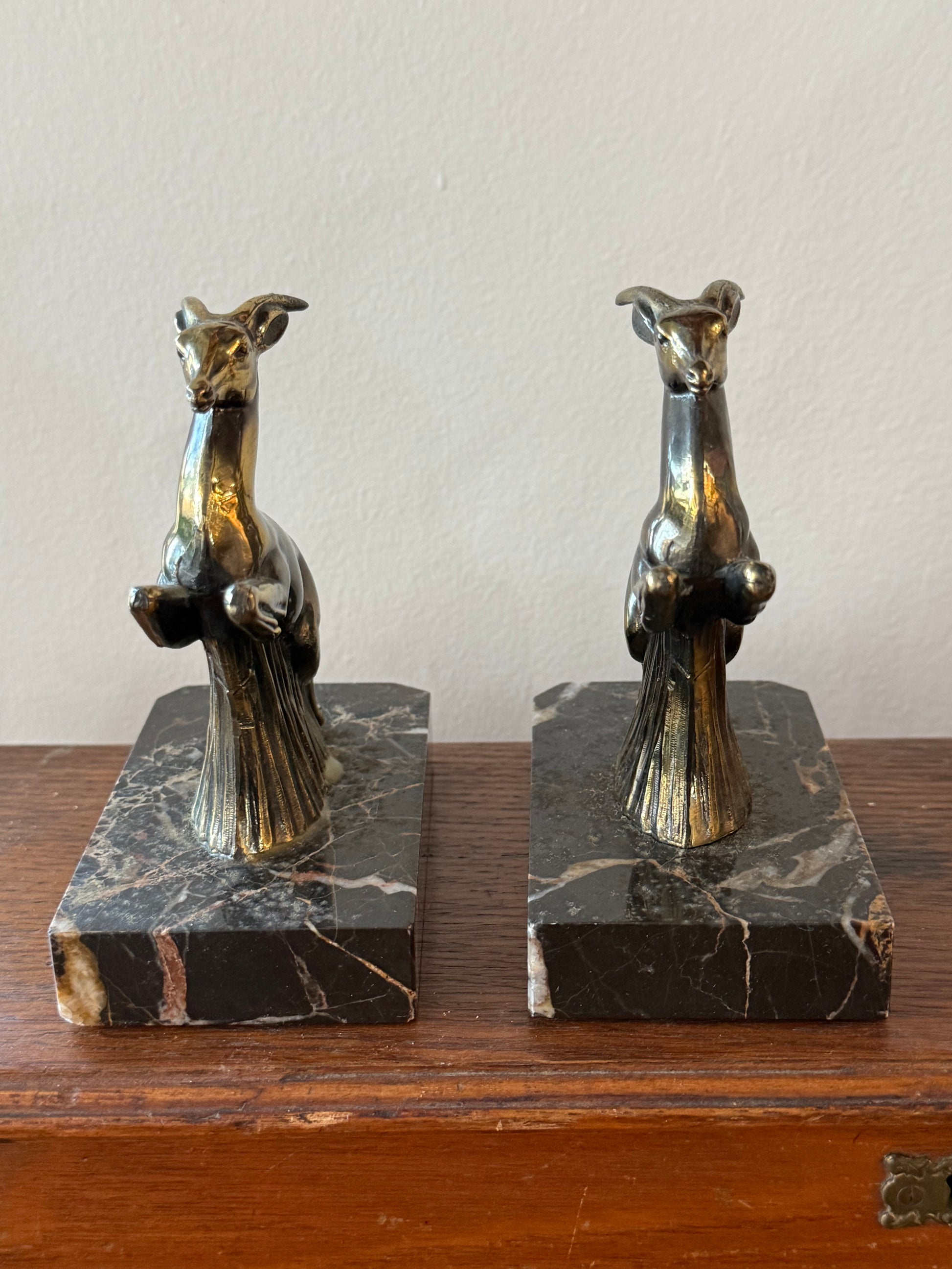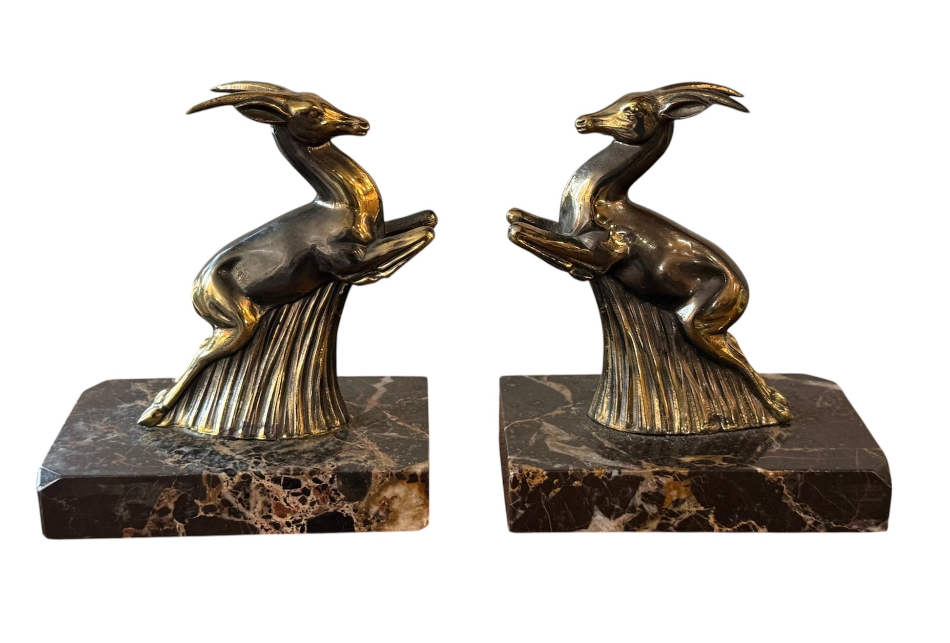 Paire de serre-livres / sculptures Art déco – Antilopes en bronze sur socle en marbre