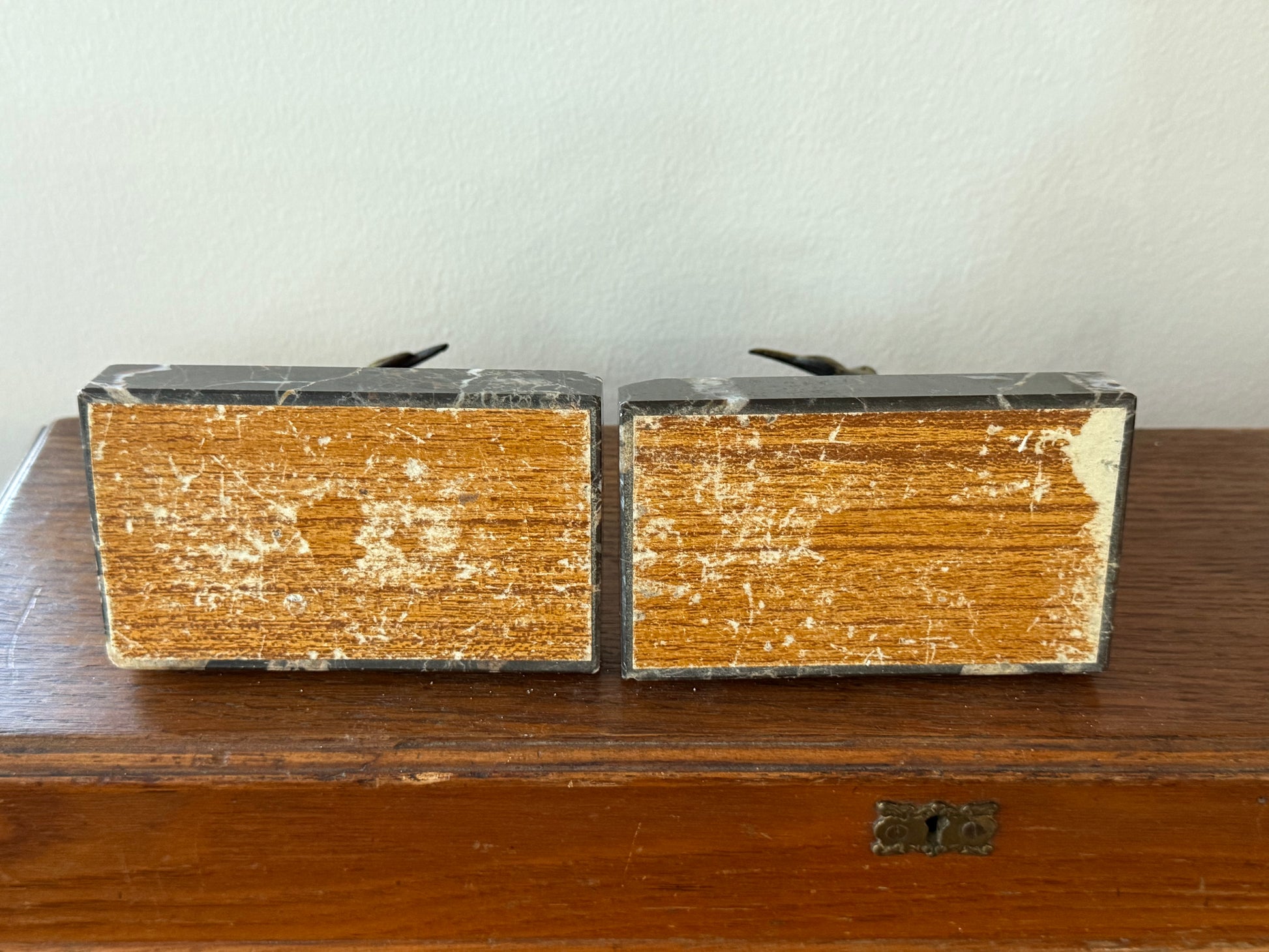 Chaque sculpture repose sur un socle rectangulaire en marbre veiné, apportant stabilité, contraste et raffinement à l’ensemble. Les deux pièces se font face, formant une paire parfaitement symétrique, idéale en serre-livres, décoration de bibliothèque ou objet de collection.
