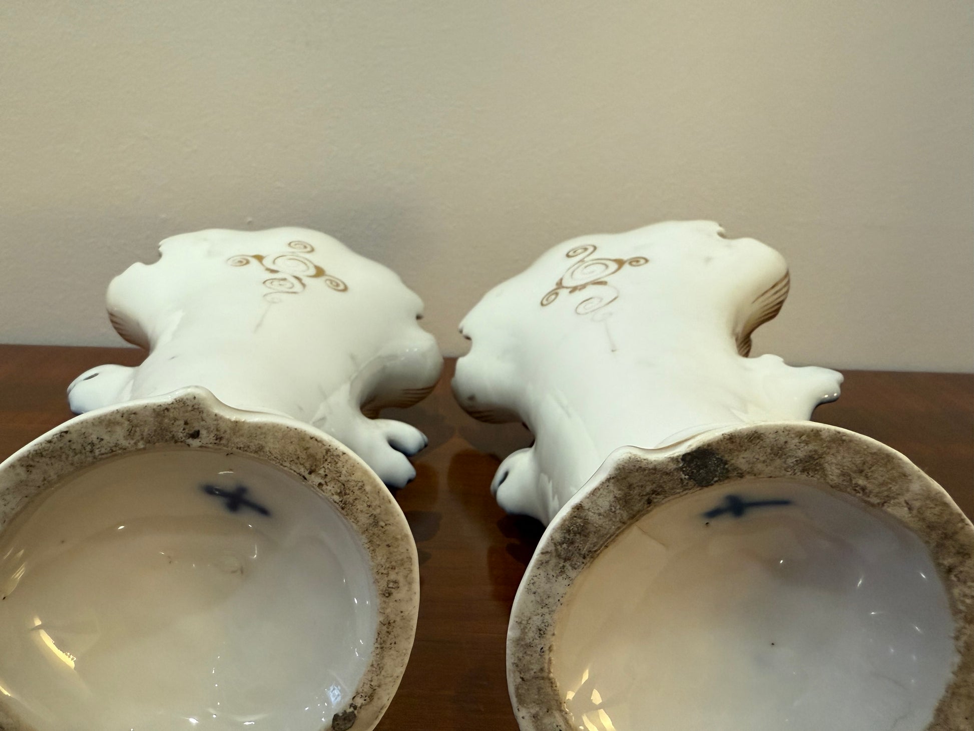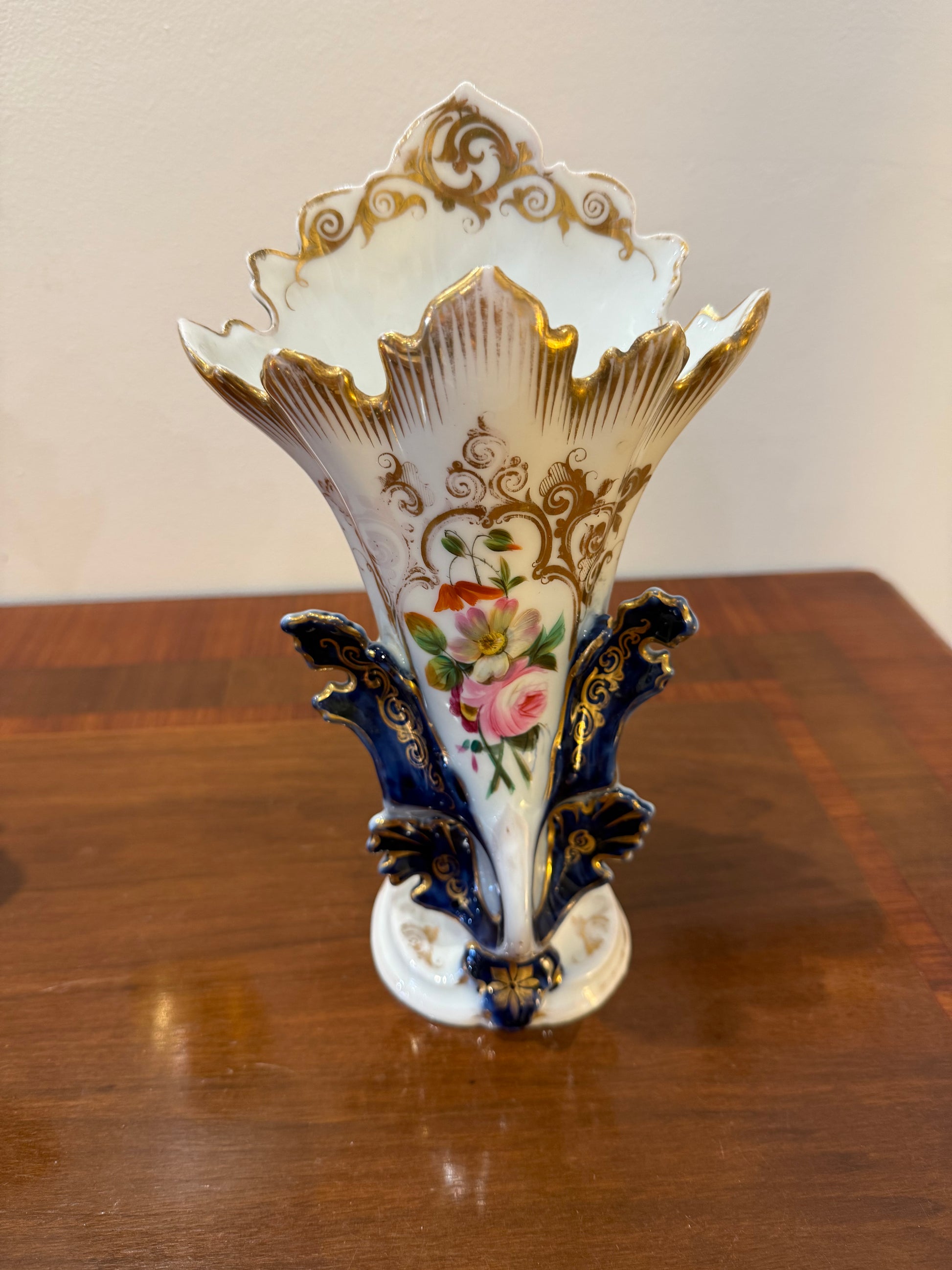 Ces vases en forme de cornes d’abondance reposent sur un socle orné de motifs baroques en reliefbleu cobalt et dorés. Leurs bords festonnés et décorés de volutes dorées leur confèrent une allure majestueuse. Le corps, finement peint à la main, arbore des motifs floraux délicats dans des tons pastel, apportant une touche de romantisme à l’ensemble.
